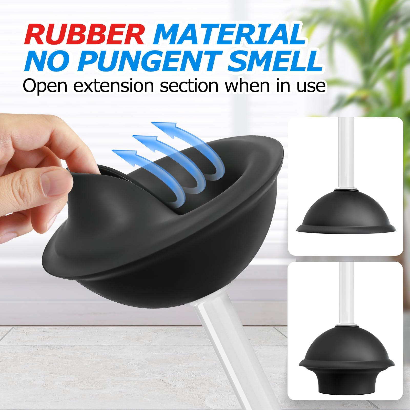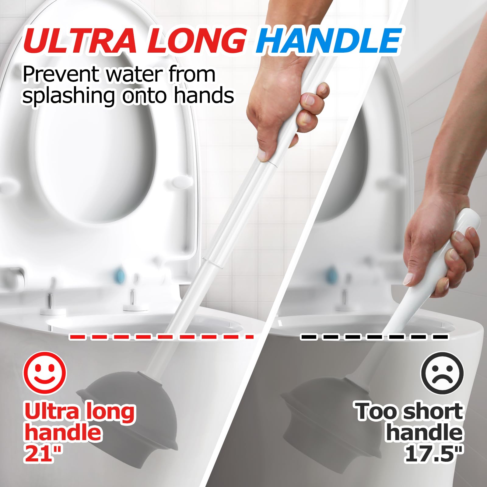 Extended handle -Heavy Duty Toilet Plunger: Compared to ordinary handles, our upgraded extended handle provides a better user experience and prevents stains from splashing onto the hands. A professional powerful suction cup that can solve various blockage problems. Comfortable handles provide greater support during use.