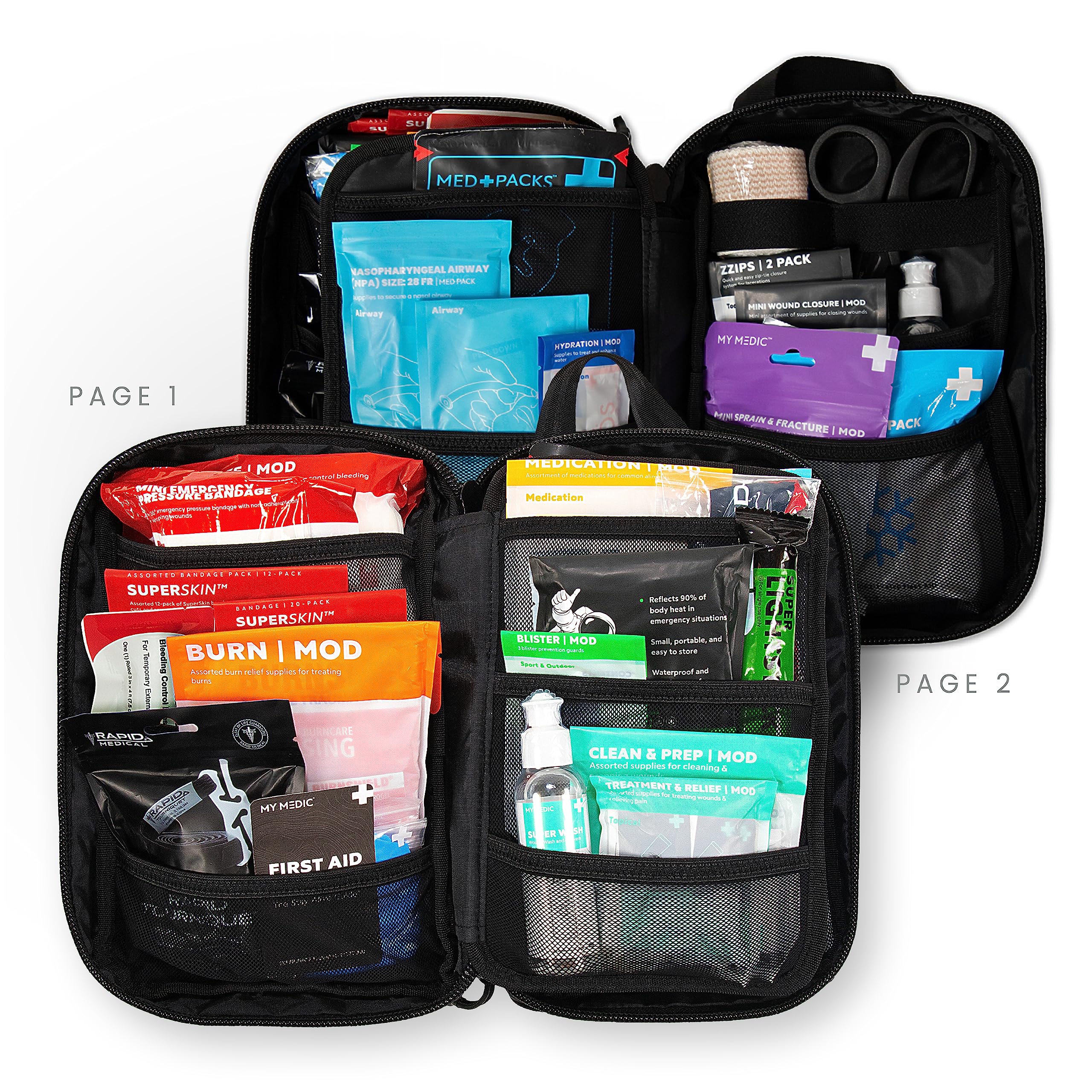 RESCUE & EMERGENCY KIT: Our kits are equipped with not only a splint, but a space blanket, large EMT shears, gloves, gauze, super wash, bandages, tape, burn gel, medicine, blister strips, hydration mods, topical ointment, hygiene basics and so much more.