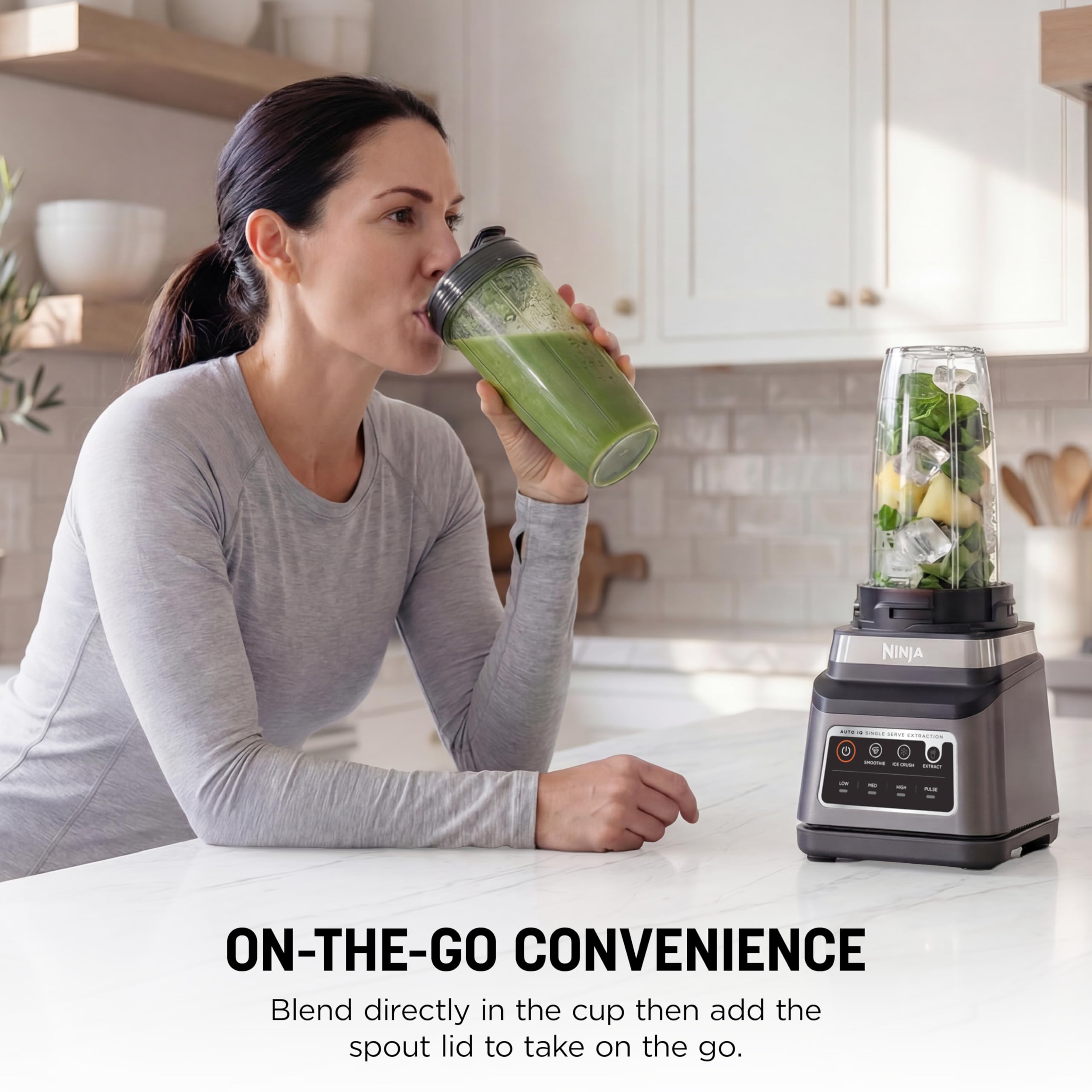 ON-THE-GO CONVENIENCE: Two 24-oz. single-serve cups with spout lids make it easy to take delicious nutrient-rich smoothies on the go.