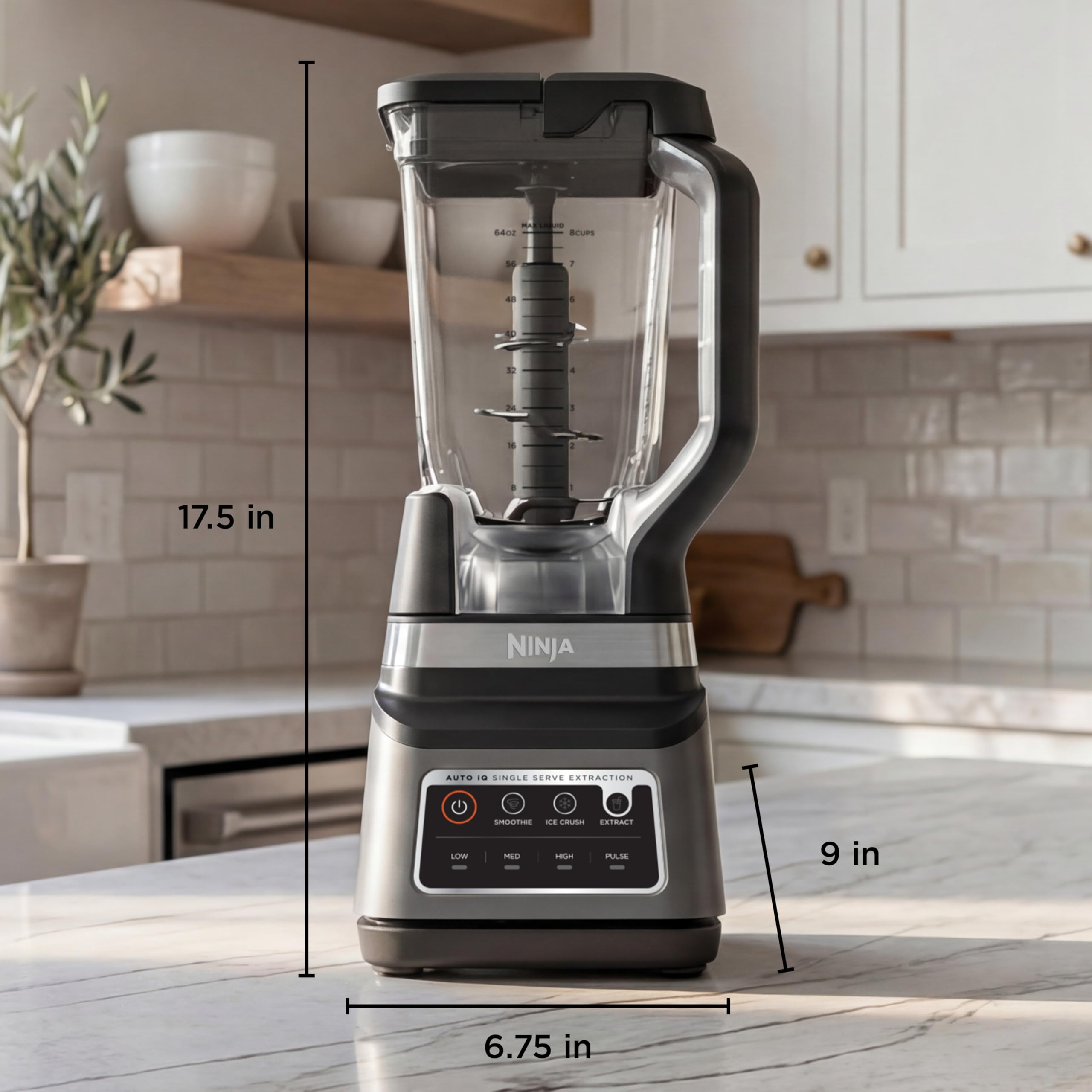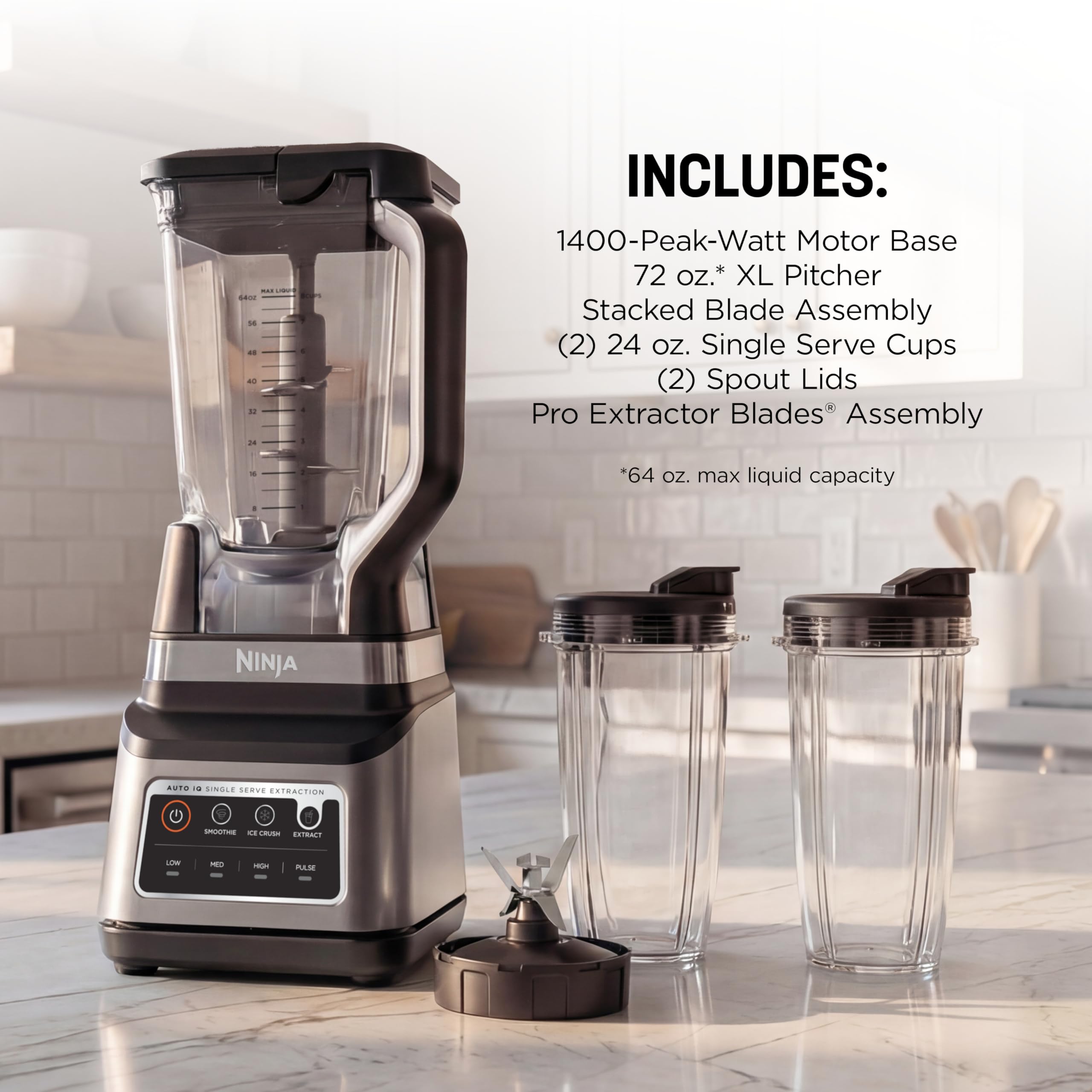 The Ninja Professional Plus Blender DUO with Auto-iQ features a new modern design and a more powerful motor than Ninja's original Professional Blender DUO.* Ninja Total Crushing Blades and Pro Extractor Blades Assembly give you perfectly crushed ice for your smoothies, frozen drinks, and nutrient extractions**. The 72 oz. Total Crushing Pitcher is great for making large batches for the whole family with 1400 peak watts of professional power. Plus, its single-serve cups with spout lids make it easy to take delicious, nutrient-rich smoothies on the go. Auto-iQ Technology provides preset programs that do the work for you, no guesswork required. *Versus BL621, based on operating wattage **Extract a drink containing vitamins and nutrients from fruits and vegetables 64 oz. max liquid capacity