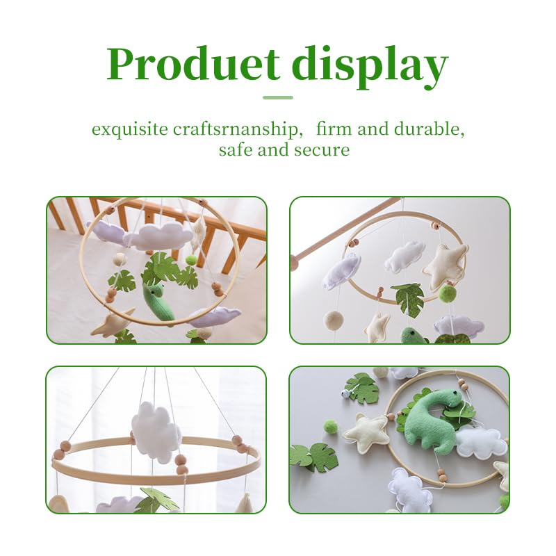 Handmade with Love and Care: Each element of the mobile, from the dinosaur to the clouds and stars, is meticulously handcrafted using high-quality felt. The soft, durable material ensures that your baby is surrounded by safe and gentle textures while adding a touch of craftsmanship to the nursery decor.