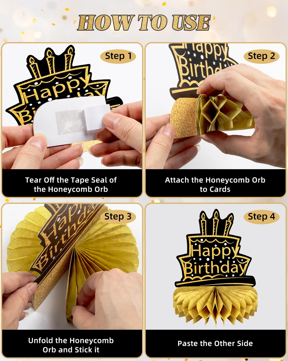 🌈HOW TO USE: Firstly, tear off the sticker of the honeycomb ball, and then stick the honeycomb ball to a fixed area on the card, next step is unfold the honeycomb orb and stick it, finall repeat on the other side of the card and put it stand on the table. It's so easy that you can save a lot of time