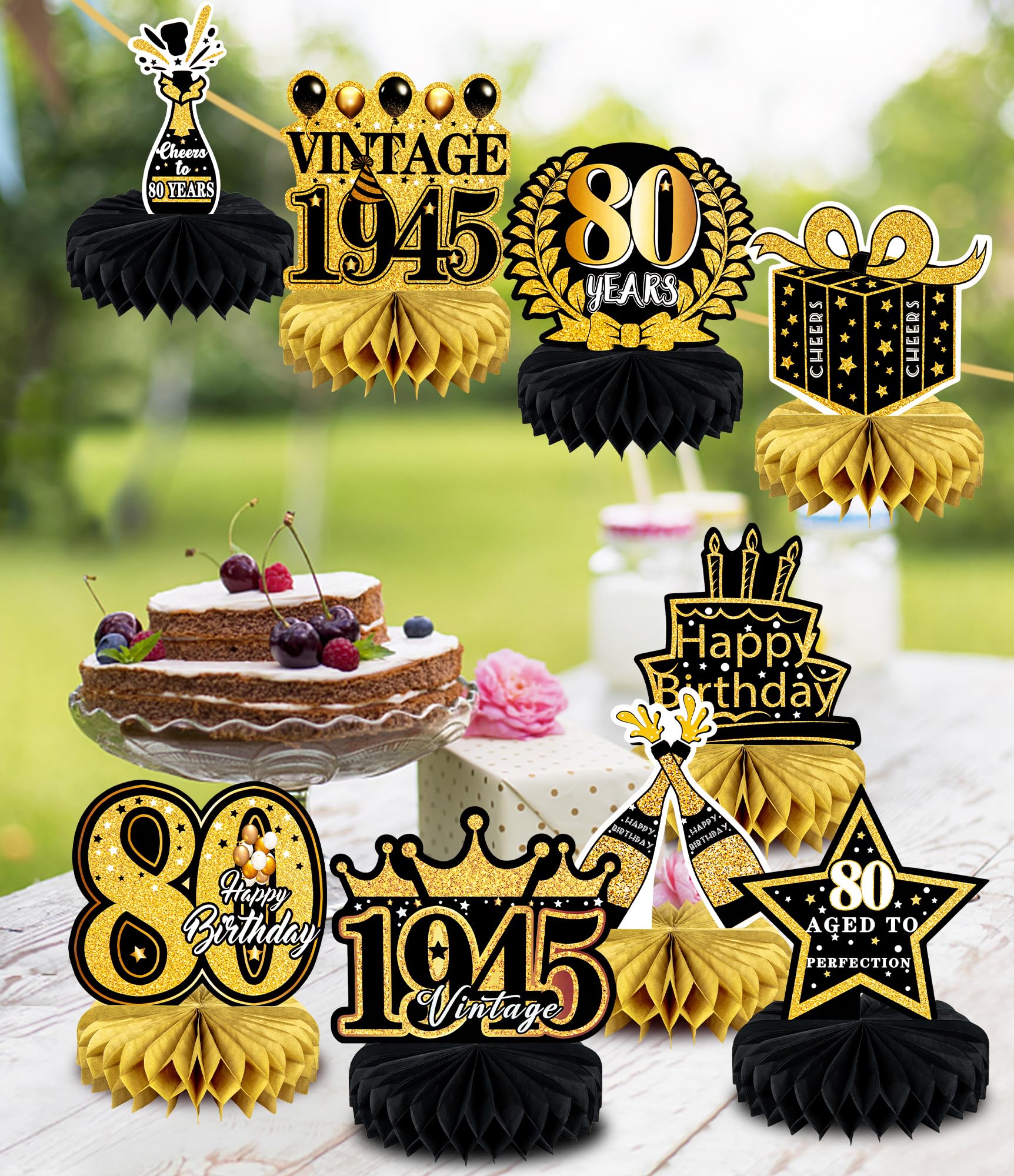 💖80th BIRTHDAY PACKAGE INCLUDES: Our 80th birthday decorations for men women including 9 patterned cardboard and 9 paper honeycombs. These decorations exquisitely designed with interesting birthday elements. It is very suitable as a decoration for your 80th birthday table decorations, you can place it on the table or hang it with a clip