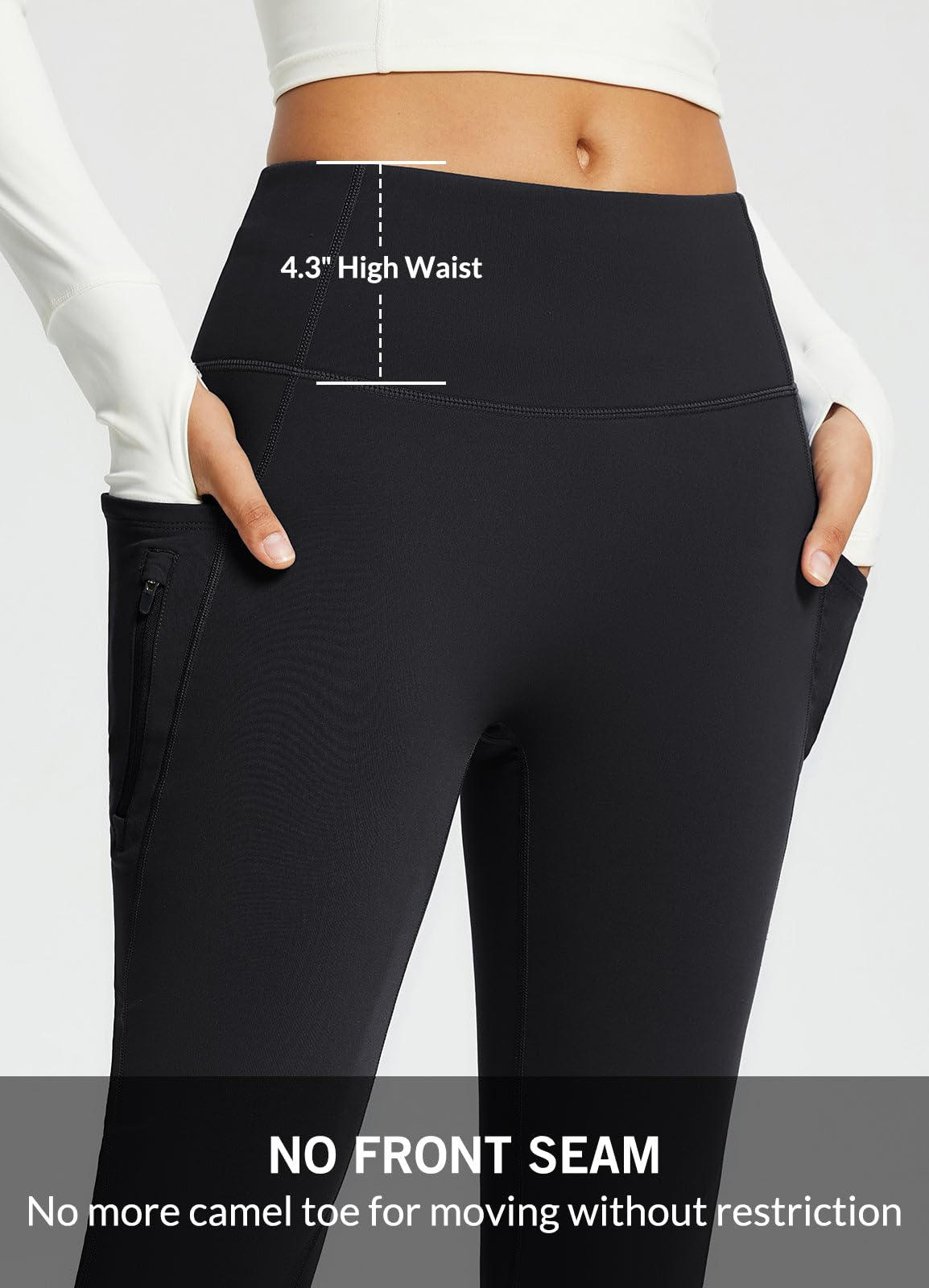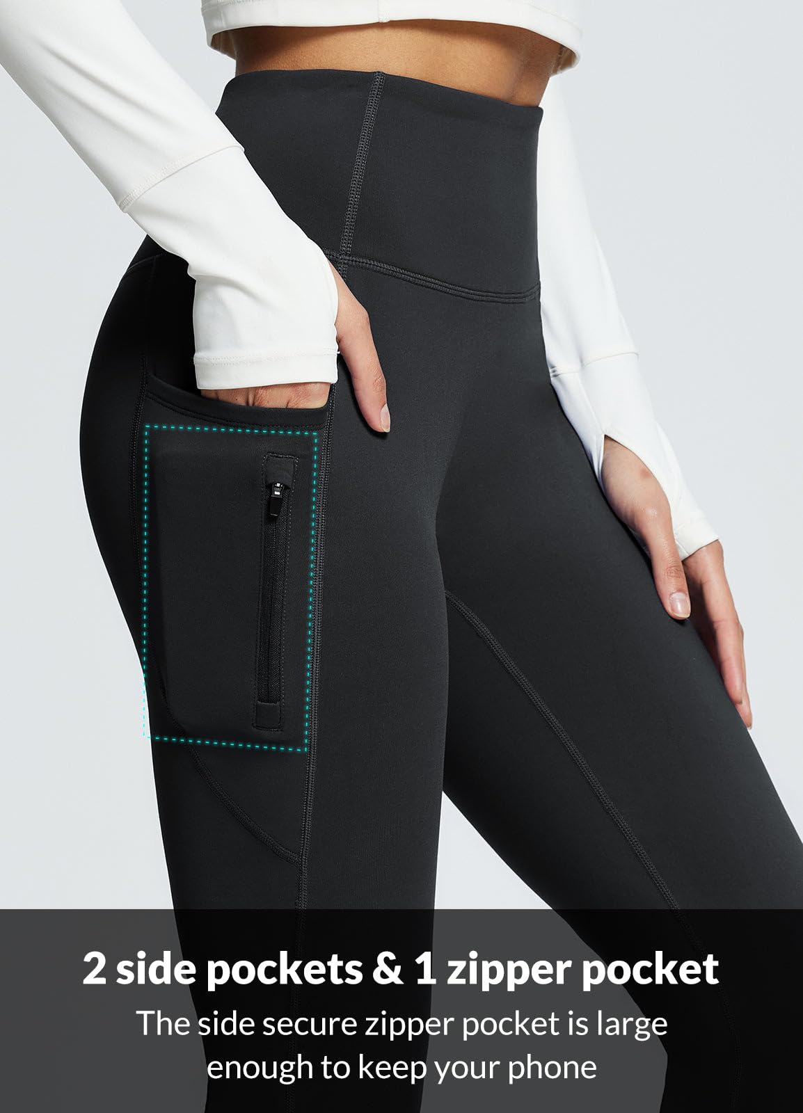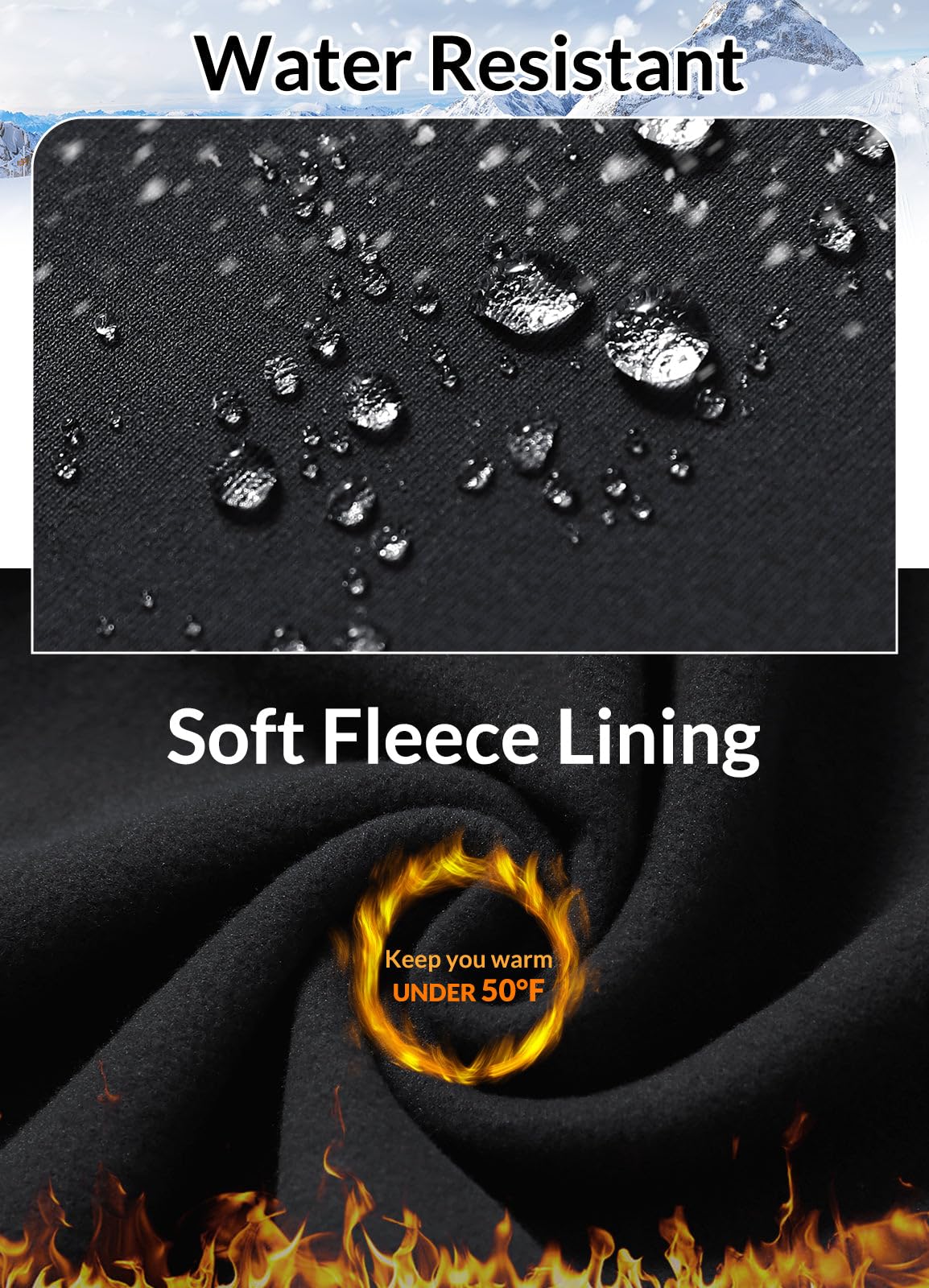 Feel the cold? Put on these fleece lined pants. These high waist yoga pants with pockets with soft fleece lining keep you super comfy and warm under 50°F, the water-resistant fabric is outside to better keep from wind and keep you dry on a snowy day.