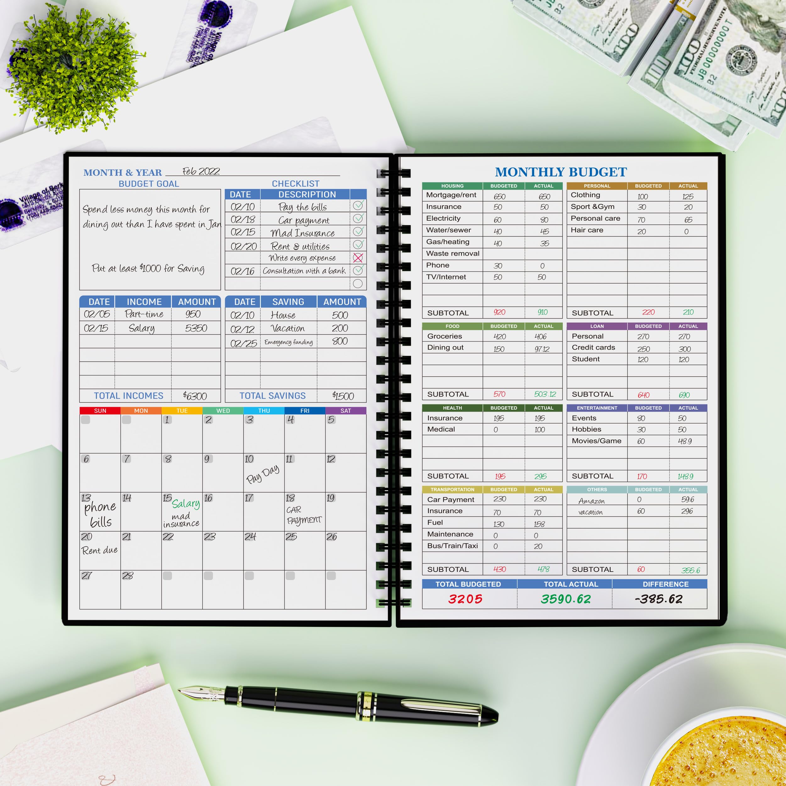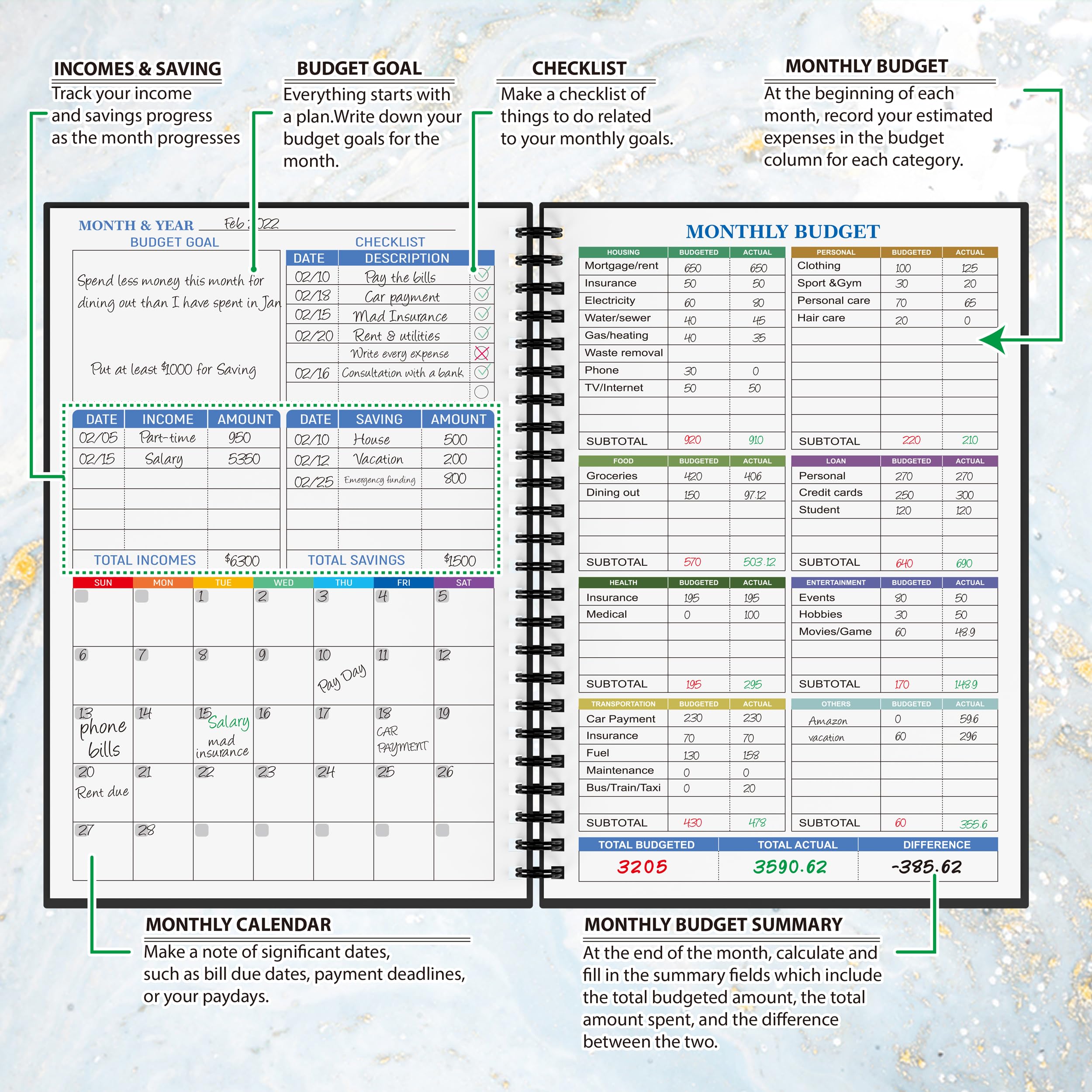 ORGANIZED MONTHLY GOALS & BUDGETS - Our 12-month budget planner helps you set monthly goals, budgets, reviews, and develop good monetary habits, strategies, and action plans. Write down monthly financial goals, put reminders of bills and payments on the calendar, plan your monthly budget in each category, track daily expenses, and review the monthly budget at the end of the month.