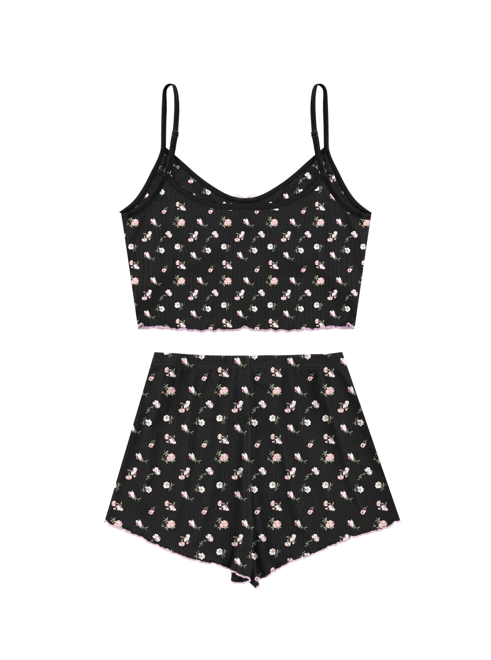 DESIGN: This two piece pajama set for women featuring a v neckline, ribbed knit, floral pattern, lettuce trim, contrast trim, elastic waistband, short length and a fitted silhouette, super flattering