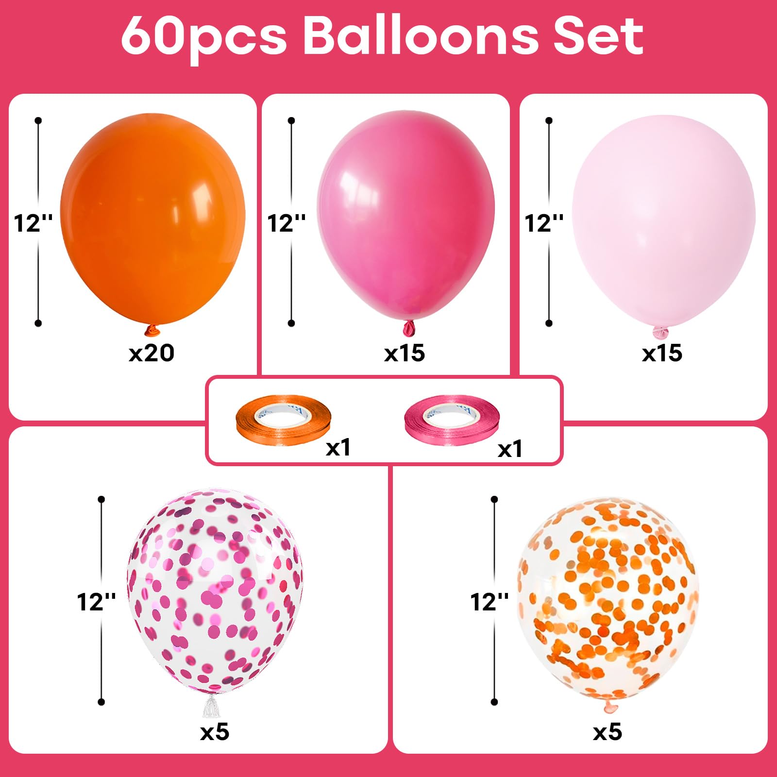 🎈 Orange Hot Pink Balloon Includes: You will get 60 pack pink and orange latex balloons, all sized 12 inch, including matte orange balloon (20 pcs), fuschia pink balloons (15 pcs), pastel pink balloons ( 15 pcs), orange confetti balloons (5 pcs), hot pink confetti balloon (5 pcs) . Orange balloon ribbon * 1 pc, pink balloon curling ribbon * 1 pc. With perfect size and classical collocation, globos rosados will increase lots of fun to the pink and orange party decorations!