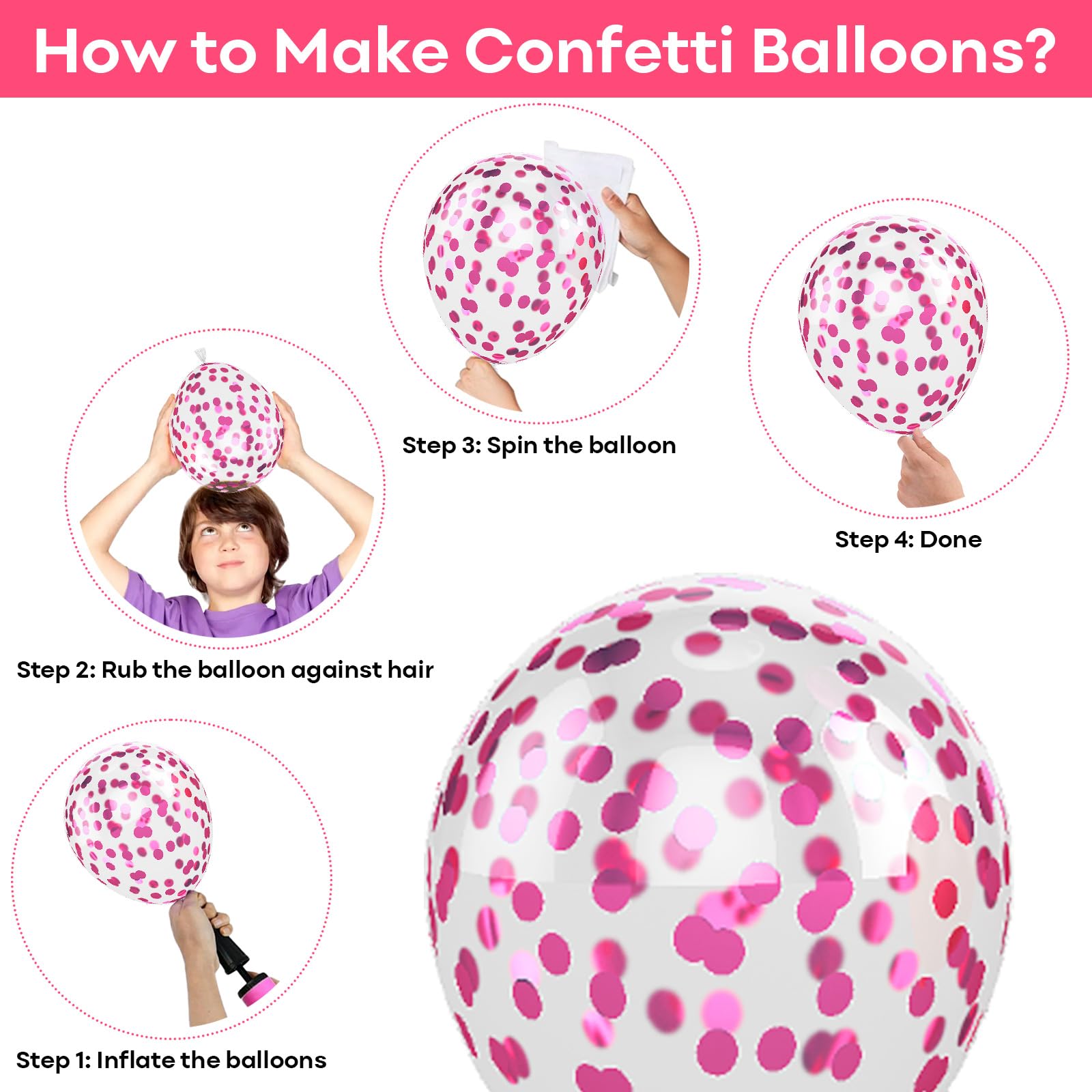 🎈 How to make Glitter Balloons Confetti: For your convenience, our pink glitter balloons are pre-filled with sparkly confetti. After blowing up the magenta confetti balloons, you can just rub the pink birthday balloons for girls on your hair, towel or something similar to help the confetti stick to the balloon easily. Create a romantic scene at your party as you pink sprinkle confetti balloons all over the place, then enjoy your happy time.