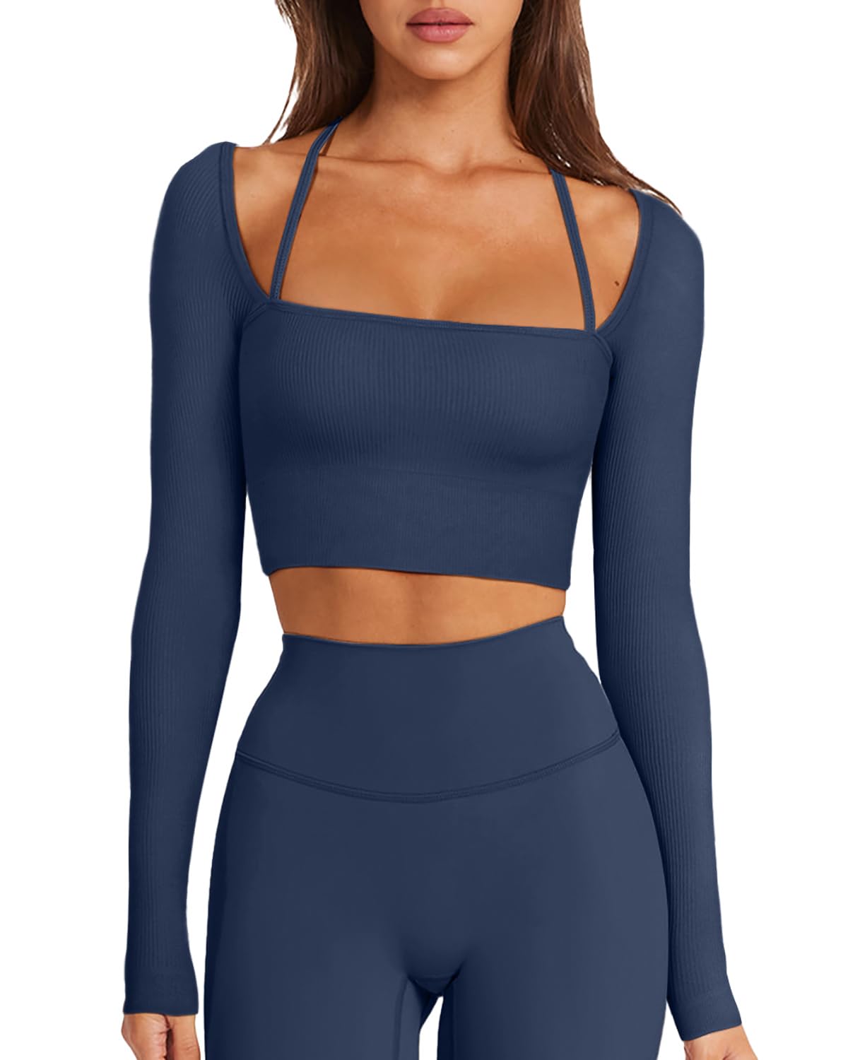 Features:Simple but generous design,sexy square neck ,long sleeve, seamless,athletic yoga tops,crop tops, casual, slim style,workout tops with built in bra, hugs your curves perfectly and flatteringly.Perfect for those who don't want to wear a bra!