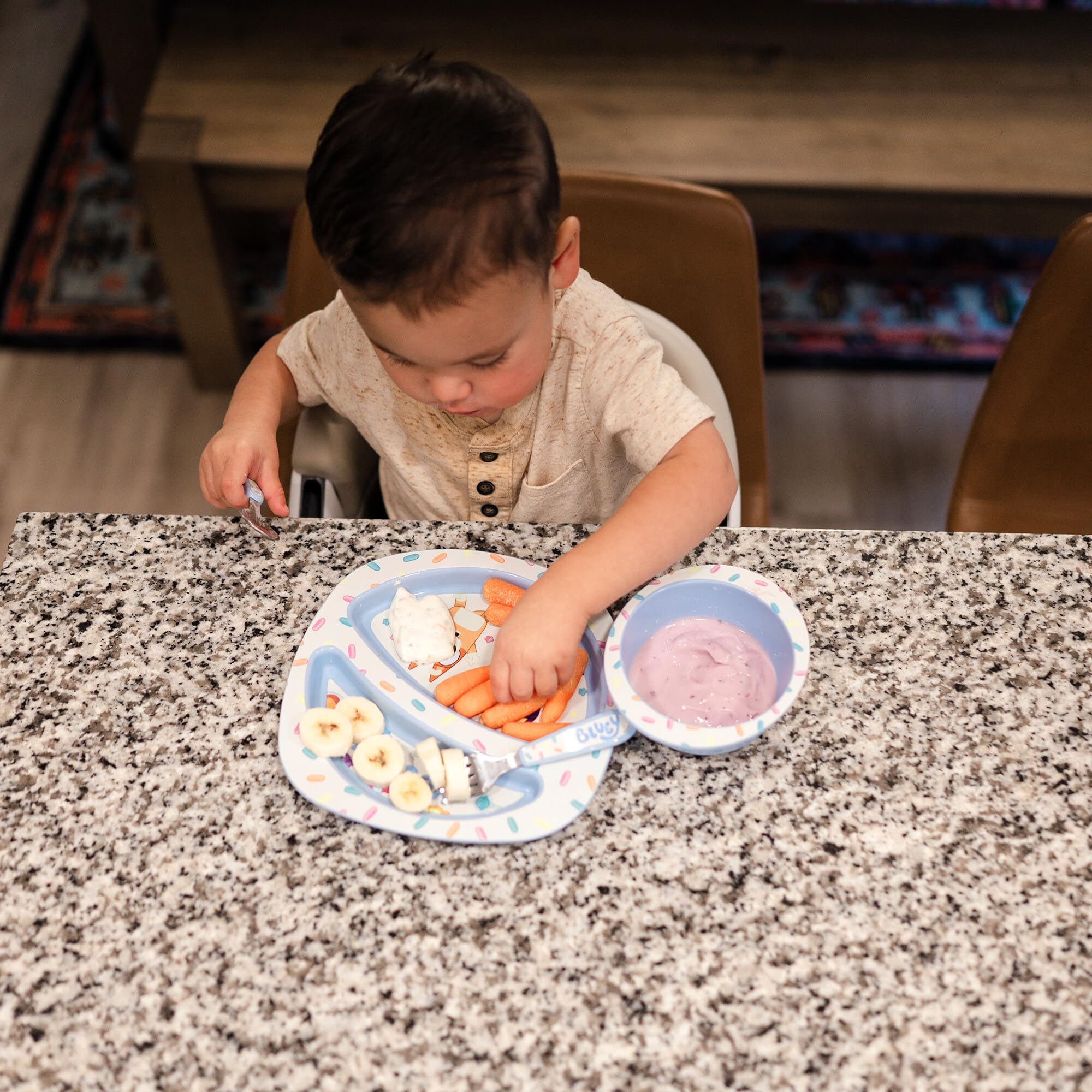 Invite Bluey to mealtime with this fun set featuring kids' favorite characters from the show! Kids will look forward to meals and snack time with their favorite animal friends, and picky eaters will appreciate the divided plate that keeps their favorite foods from touching. This four-piece set includes a toddler bowl, plate, fork, and spoon, each complete with an adorable Bluey-inspired design! The toddler-friendly Bluey bowl features deep sides to help little hands scoop up their favorite treats with the fork or spoon while learning how to self-feed. The stainless steel toddler fork and spoon are also sized right for little fingers to hold, and include durable plastic handles that are easy to grab on to. Parents will love that the plate and bowl are microwave-safe, but check those temperatures before feeding your little ones a warm meal! To make mealtime cleanup a whole lot easier, the Bluey toddler feeding set is made without BPA and is dishwasher safe, making it easy to ensure that they'll be ready for lunch, dinner, and all of your little one's favorite snacks in between!