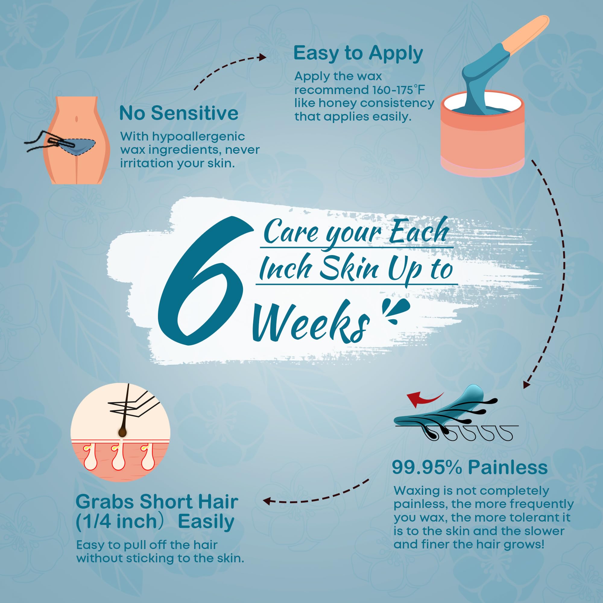 Salon Results, Home Convenience: Experience salon-like results with hot wax hair removal in the comfort of your home. Our easy-to-use hard wax beans are perfect for beginners, providing long-lasting hair removal without strips, lasting up to 6 weeks - much longer than shaving