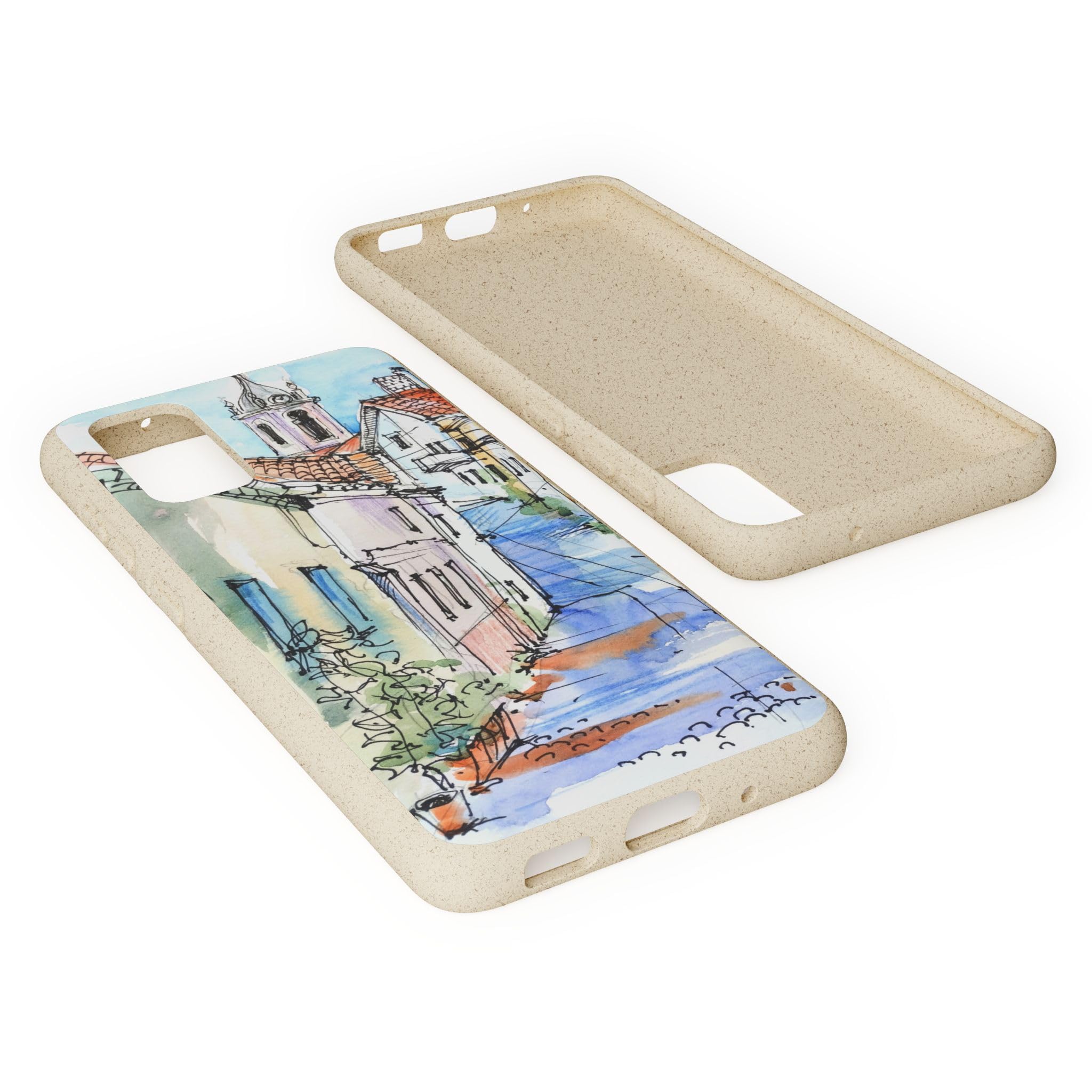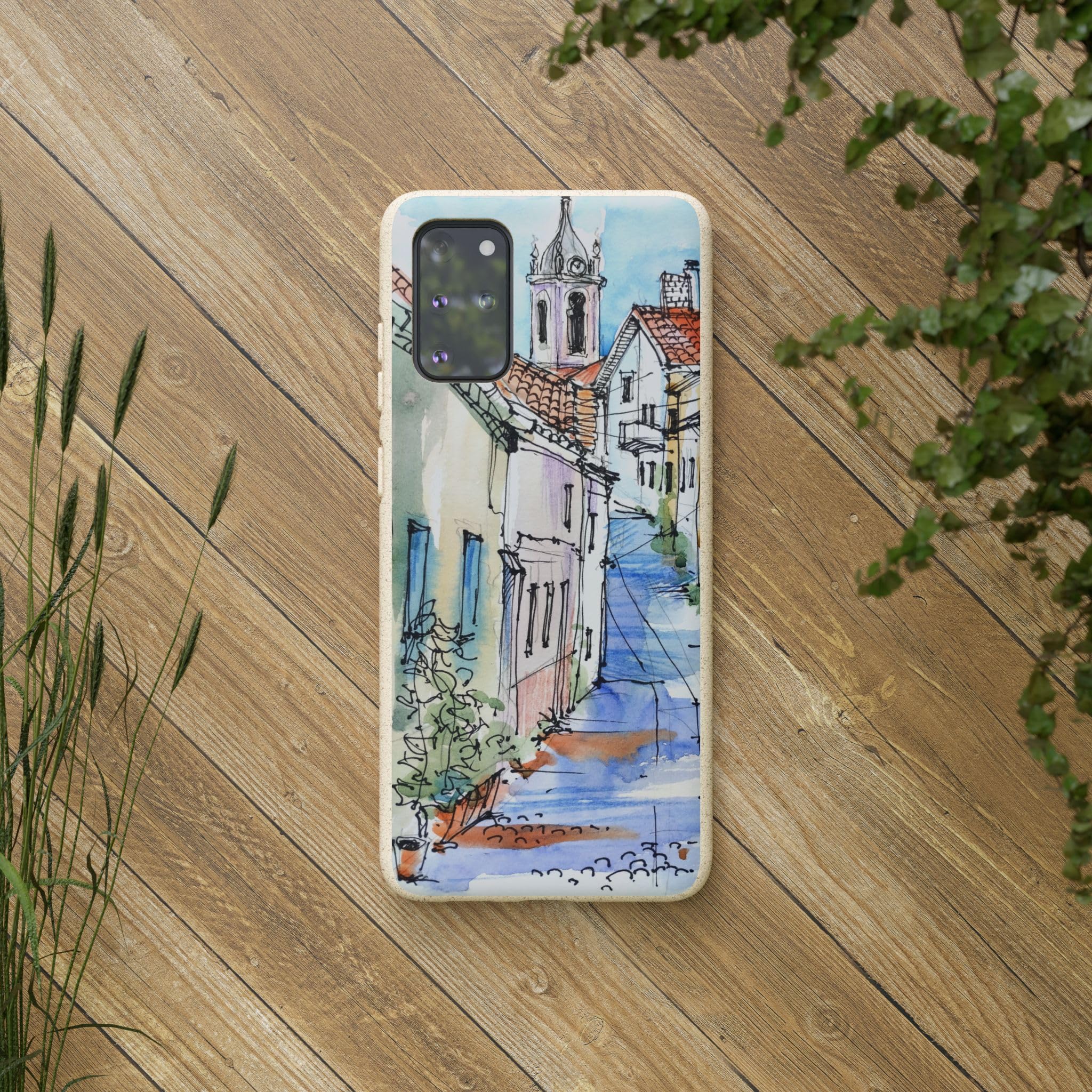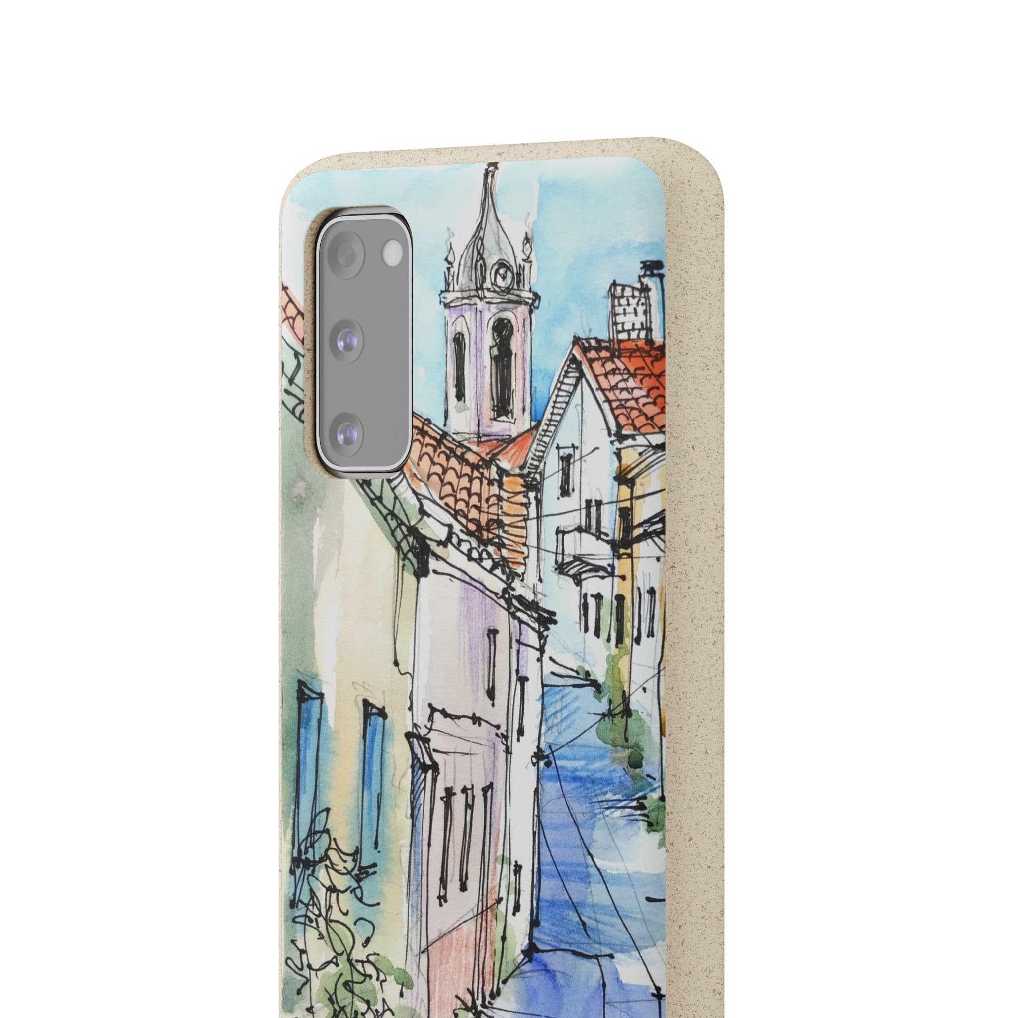 Protect your phone in style while protecting the planet! Embrace nature with our European Town Art Biodegradable Phone Case, featuring a charming illustration of a colorful European street scene. The design showcases quaint cobblestone roads, vibrant historic homes, and a picturesque chapel, all beautifully rendered in watercolor and fine pen detail. Perfect for lovers of travel-inspired art, European architecture, and the warm, nostalgic feel of hand-painted urban landscapes. Crafted from eco-friendly, compostable materials, this sustainable phone case not only protects your device but also supports a greener planet — naturally biodegrading within 160 days of disposal. It’s lightweight, durable, and fully supports wireless charging for effortless everyday use. Available for multiple phone models. Order yours today and carry the beauty of nature wherever you go! Details: .: Materials: PLA and PBAT polymers, bamboo fibre .: Matte finish .: Wireless charging compatible .: Precise cut outs for connectivity .: Might have a natural scent