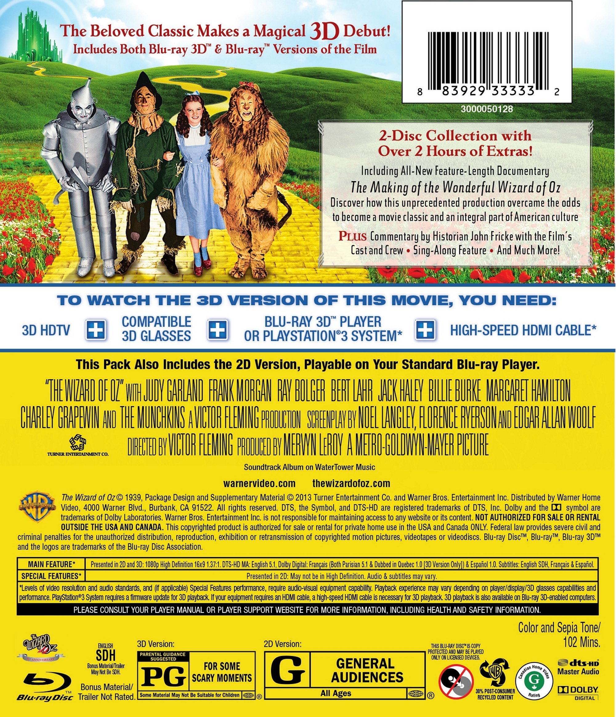 The magic of M-G-M’s wonderfully colorful and unique fantasy has melted hearts for more than seven decades with its indelible melodies and transcendent themes of family, home and the courage to pursue dreams. To celebrate the beloved movie’s 75th anniversary, Warner Bros. Home Entertainment has brought The Wizard of Oz into the present and beyond with a brand new kind of magic: a stunning 3D Blu-ray™. Adapted from L. Frank Baum’s timeless children’s tale about a Kansas girl’s journey over the rainbow, The Wizard of Oz starred Judy Garland as Dorothy, Ray Bolger as the Scarecrow; Bert Lahr as the Cowardly Lion; Jack Haley as the Tin Woodman and Margaret Hamilton as the Wicked Witch. The Wizard of Oz received five Academy Award® nominations1, including Best Picture (Outstanding Production), and captured two Oscars® -- Best Song (“Over the Rainbow”) and Best Original Score -- plus a special award for Outstanding Juvenile Performance by Ms. Garland.