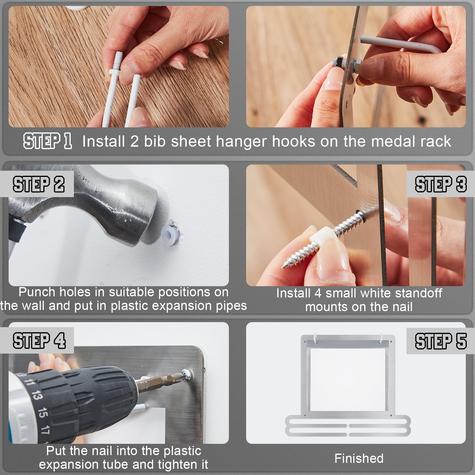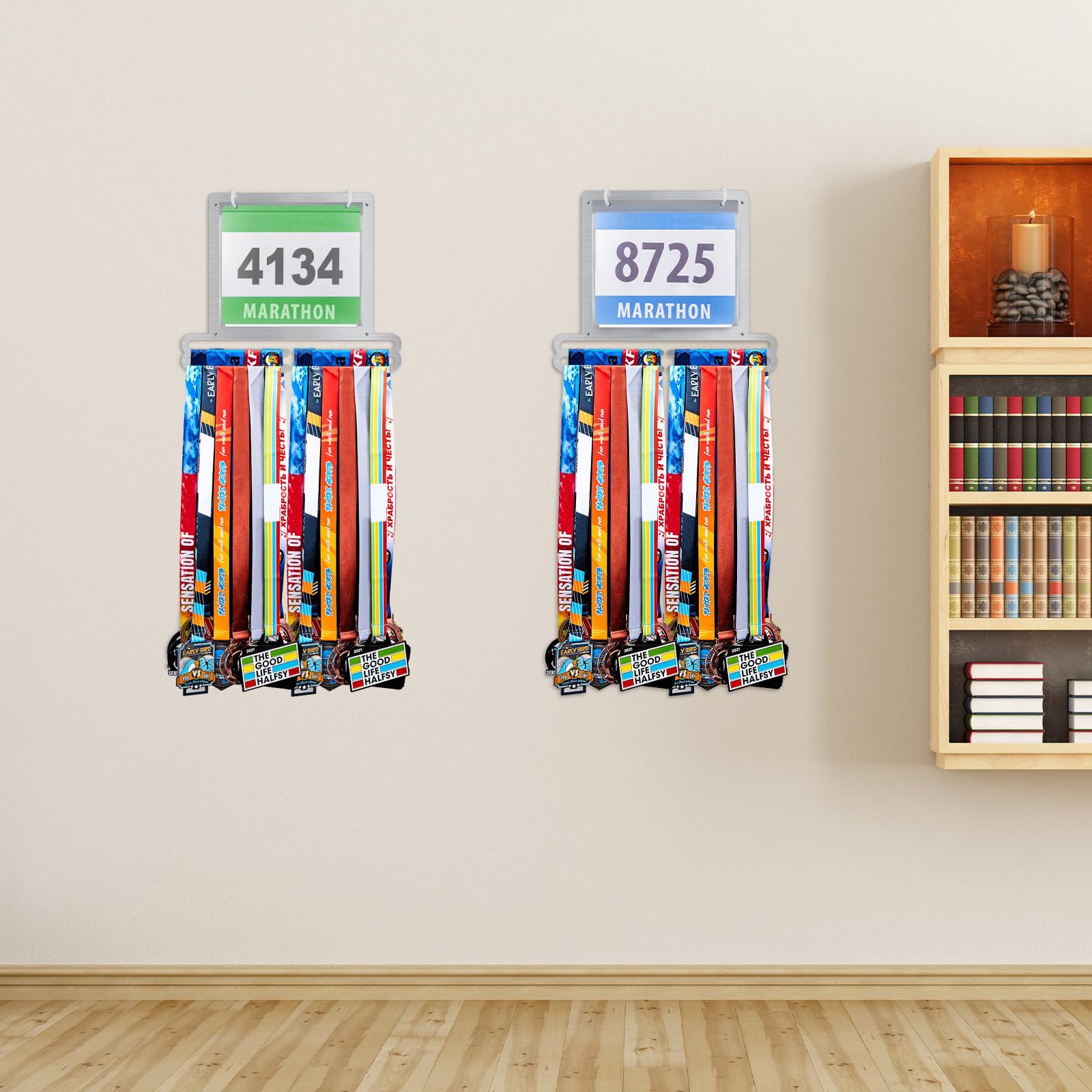 Convenient to install: the race medal display rack is designed for wall mounting to maximize space and keep your medals and bibs organized, the package comes with the appropriate mounting kit, you simply attach the rack and screws to the wall, then place the medals in the plastic bibs and hang them on the hooks, slide your medals onto the bars