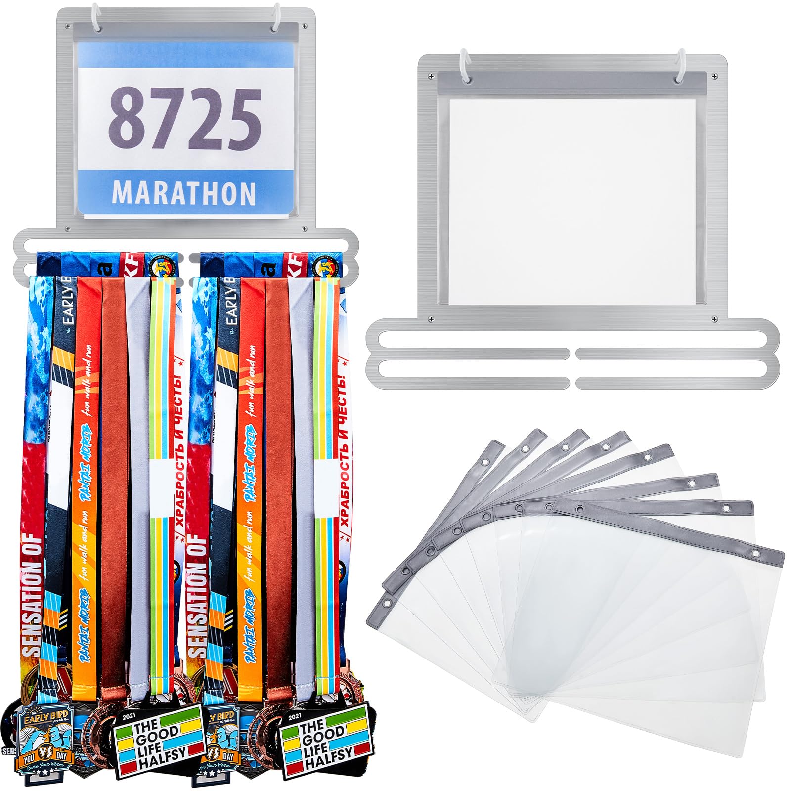 Long lasting to use: made of reliable metal that won't bend or break easily over time, the race bib and medal display is a must-have for most athletes; Multiple hooks hold your race bibs above the hanging medals, and the plastic bib holders are simple to open and close, making it easy for you to use