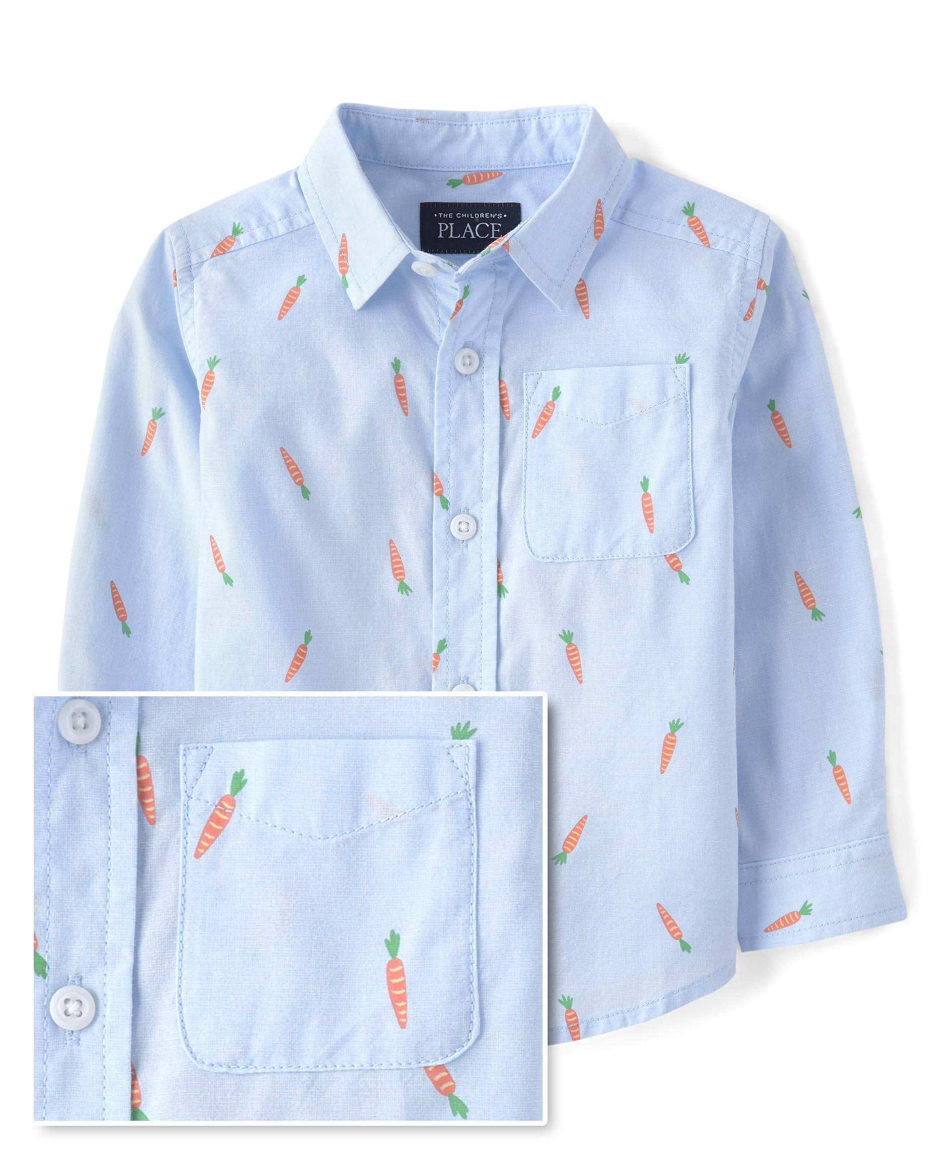DESIGN — Features long roll-up button sleeves, pointed collar, chest pocket, curved shirttail hem and allover carrot print