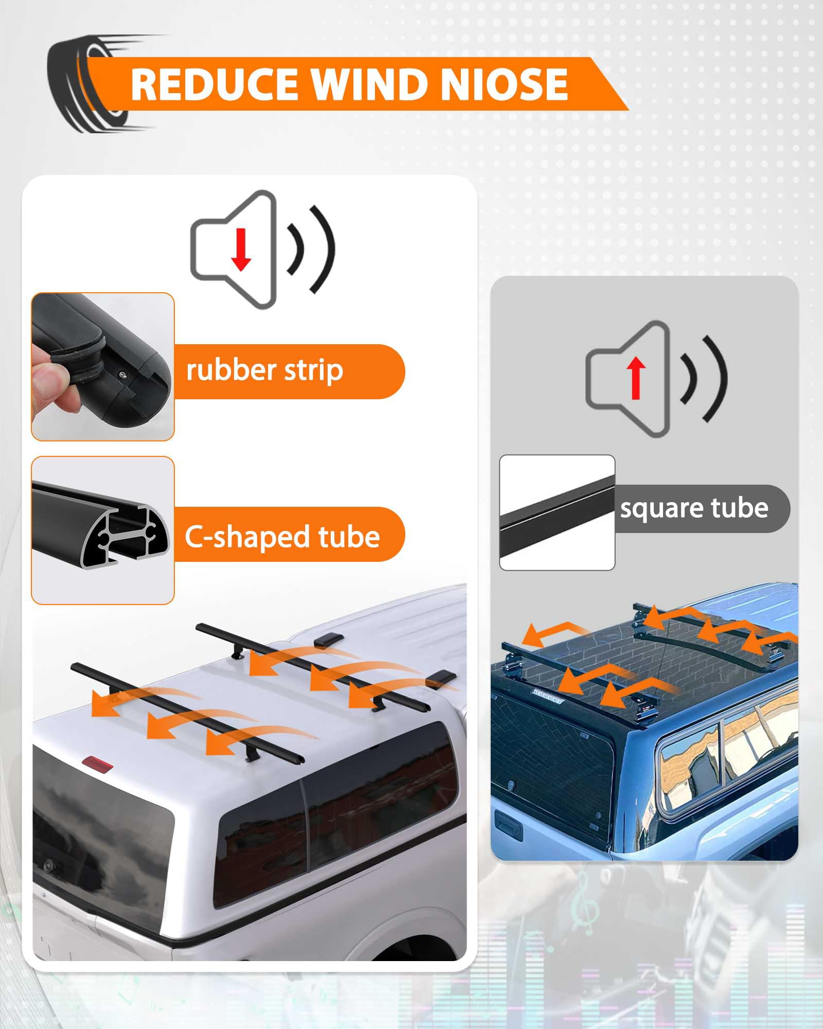 Improve Driving Experience: Truck racks with c-shape tube are aerodynamic that will reduce wind noise at highway speed. Also we provide rubber strips that you can mount them on the crossbar channels to reduce wind noise further