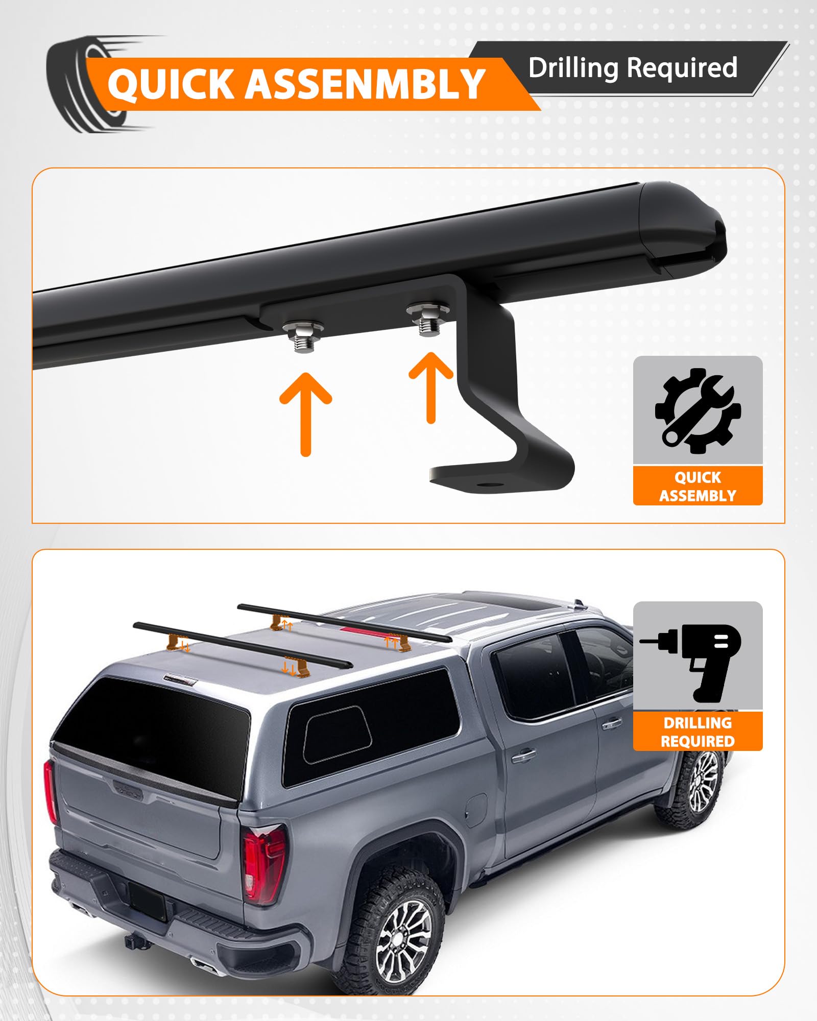 Drilling Needed: Before mounting truck topper racks, you need to drill holes on your flat roof. We provide necessory mounting hardware for you to install camper shell roof rack, easy to assemble.