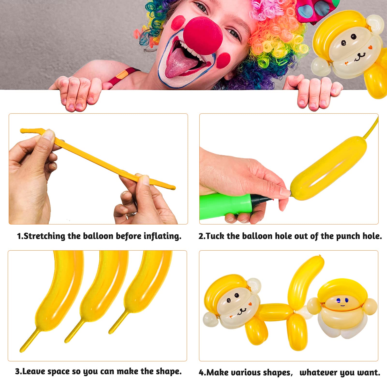 THE PACKAGE INCLUDES: 100 long balloons for balloon animals,can be shaped into any interesting sculpture or animal for professional balloon twisters and artists.