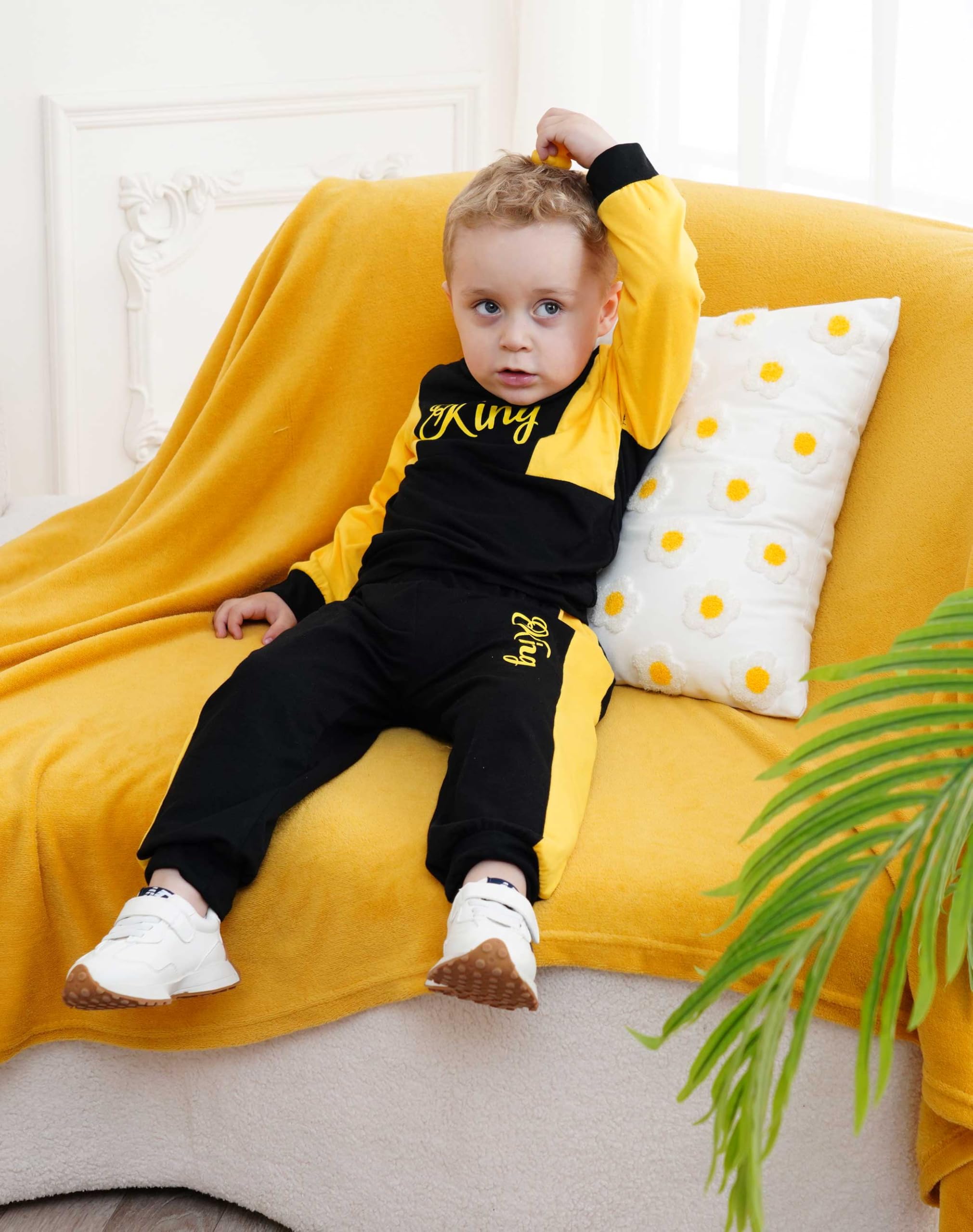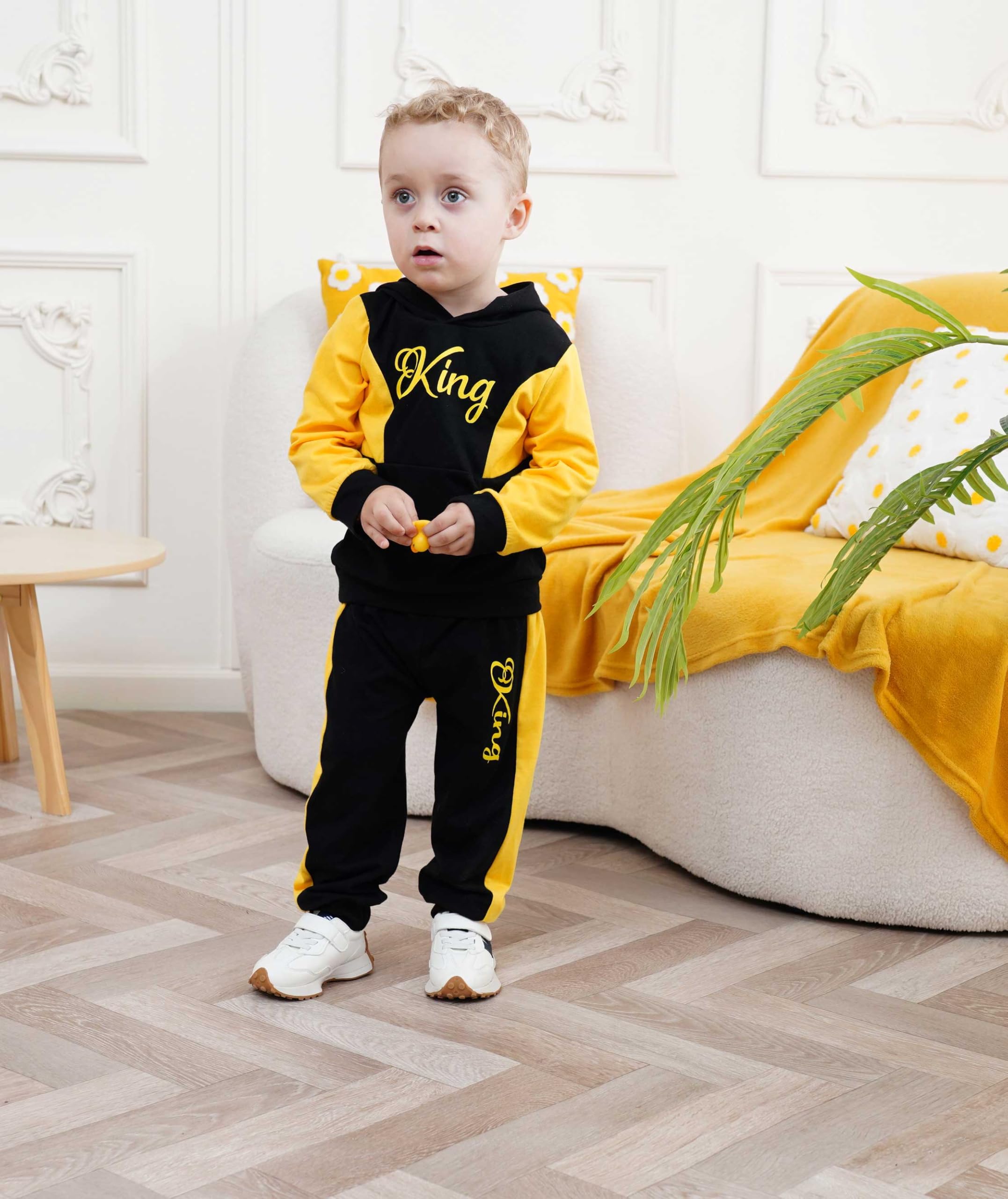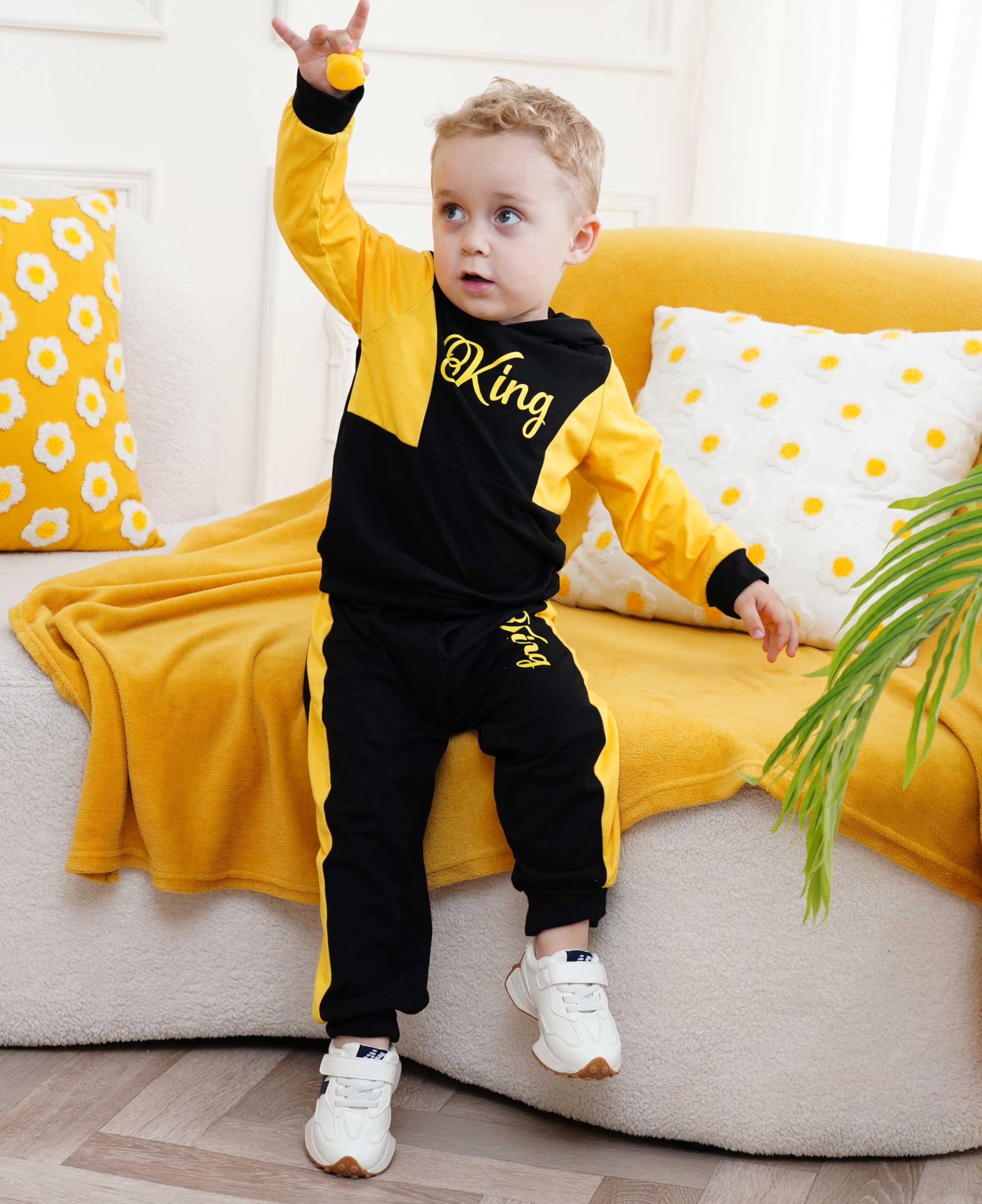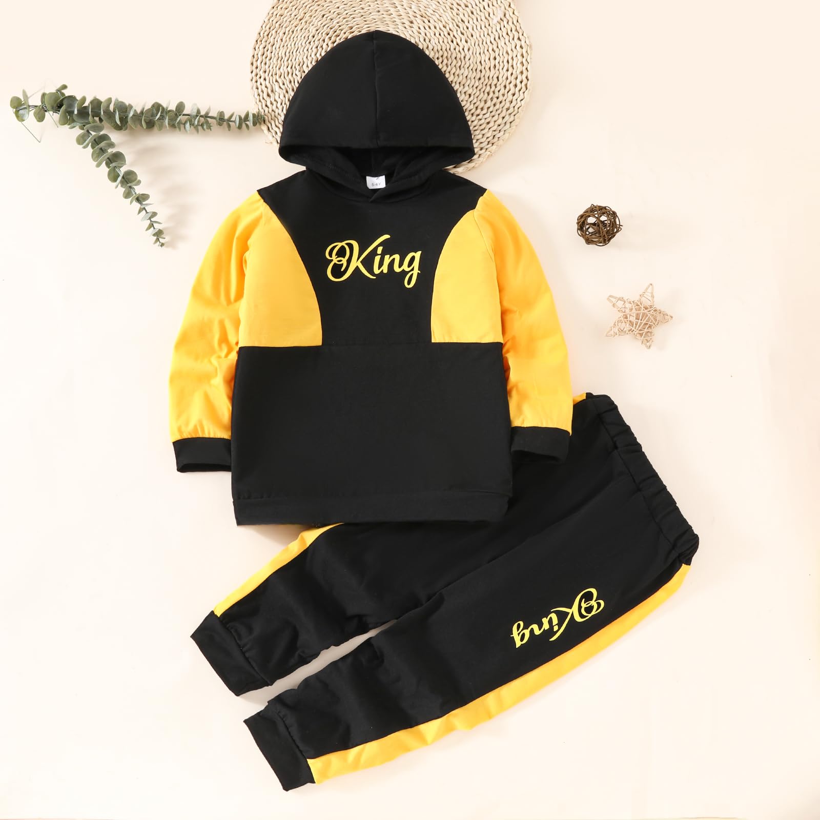 Cute boy Clothing Set: Letter Graphic Color Block Hoodie, KING Printed Sweatpants ; two-piece little boy winters clothing set.