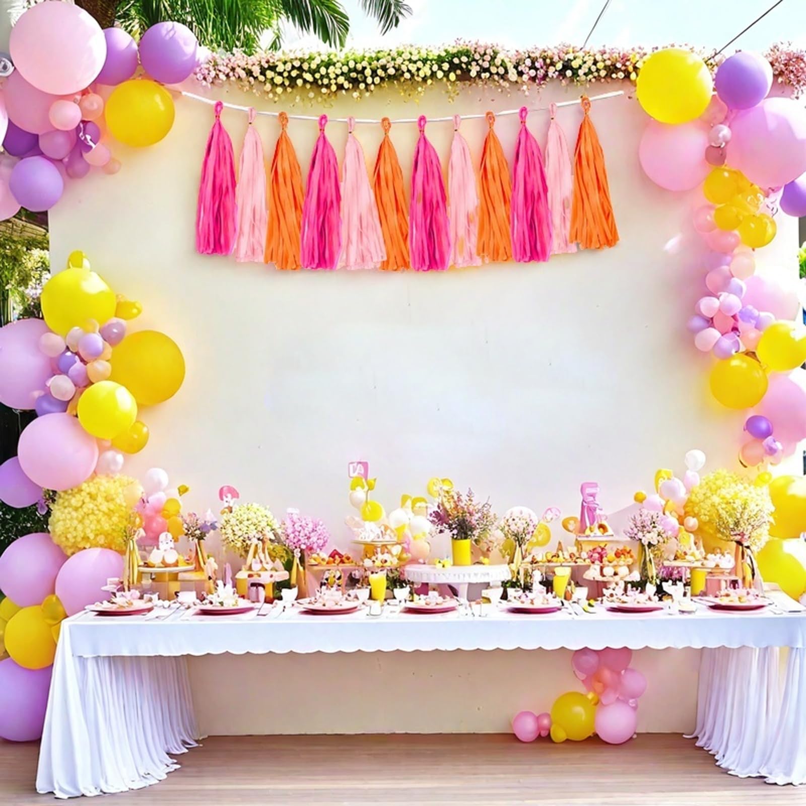 These tissue paper tassel garland banner will be very well match with gold paper pennant banner, happy birthday banner, tissue paper fan flower and balloon.