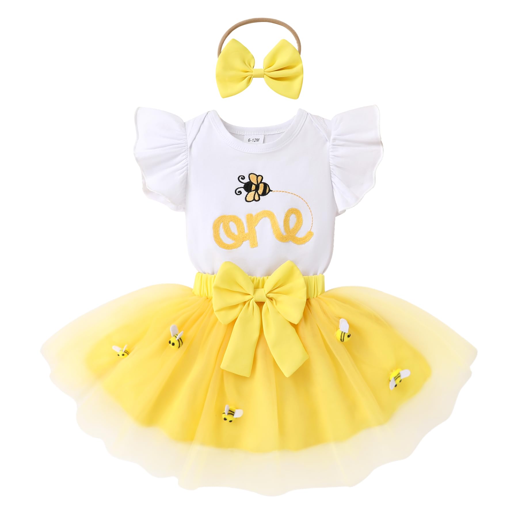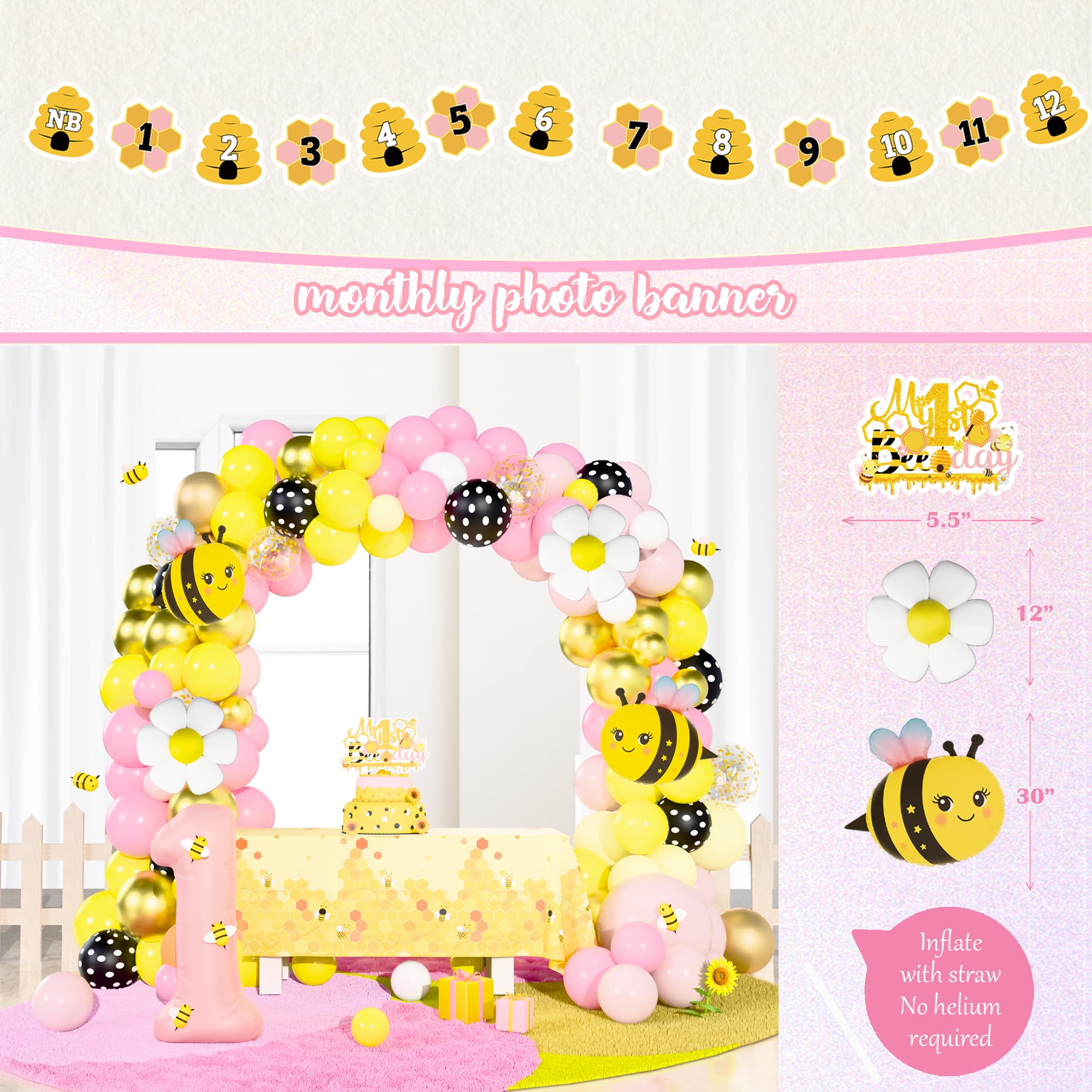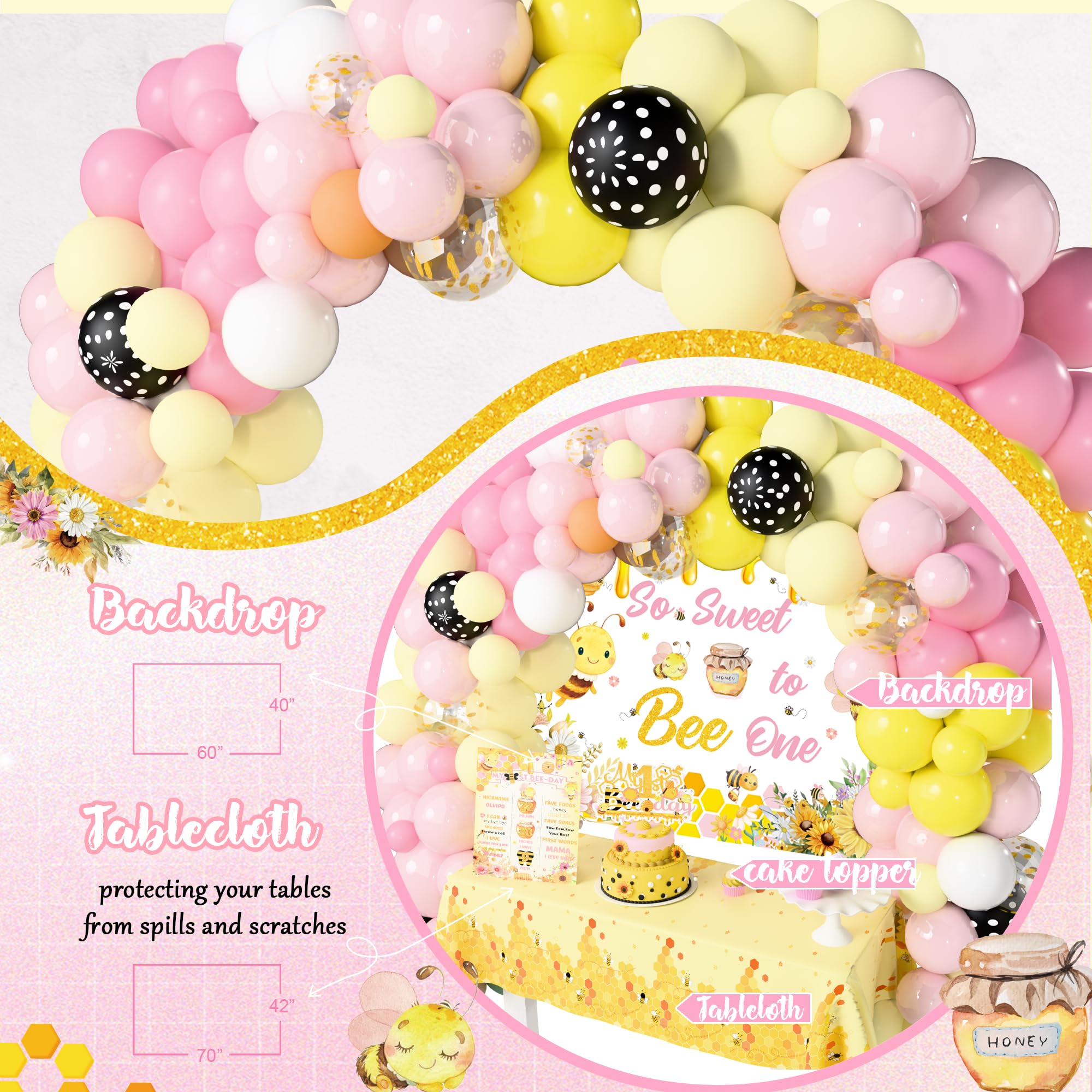 BUMBLE HONEY BEE BIRTHDAY PARTY SUPPLIES INCLUDES - 76 × 12'' latex balloons | 30× 5'' latex balloons | 5 × gold glitter latex balloons | 5 × black white dots printed latex balloons | 1 × cake topper | 1 × bee-themed monthly photo banner | 1 ×'so sweet to bee one' tablecloth | 3 x gold balloon boxes | 3 x balloon box cutouts | 1 × yellow/pink yarn pom | 1 × high chair banner | 1 x bee-themed crown | 10 x fuzzy bees | 1 x milestone poster | 2 x bee foil balloons | 2 x daisy foil balloons | 1 x number '1' foil balloon | glue dots | ribbon | ribbon | poster stand | monthly photo clips