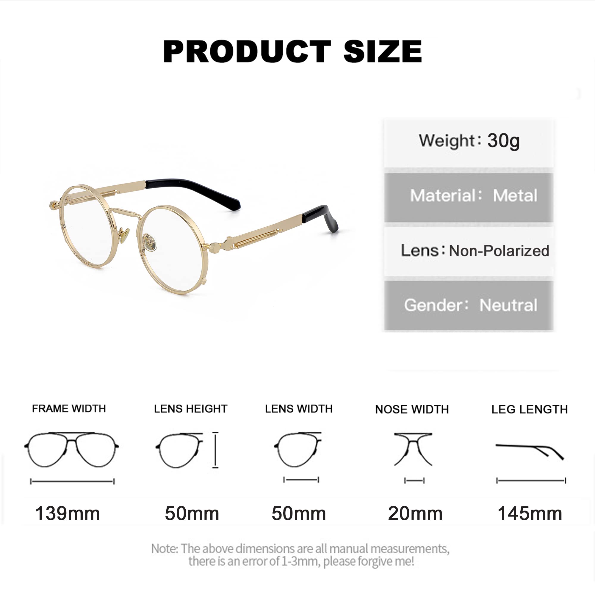 ☀PRODUCT SIZE: Lens Width: 50mm, Frame Height: 50mm, Nose Bridge: 20mm, Frame Width: 139mm, Temple Length: 145mm, Net Weight: 30g.