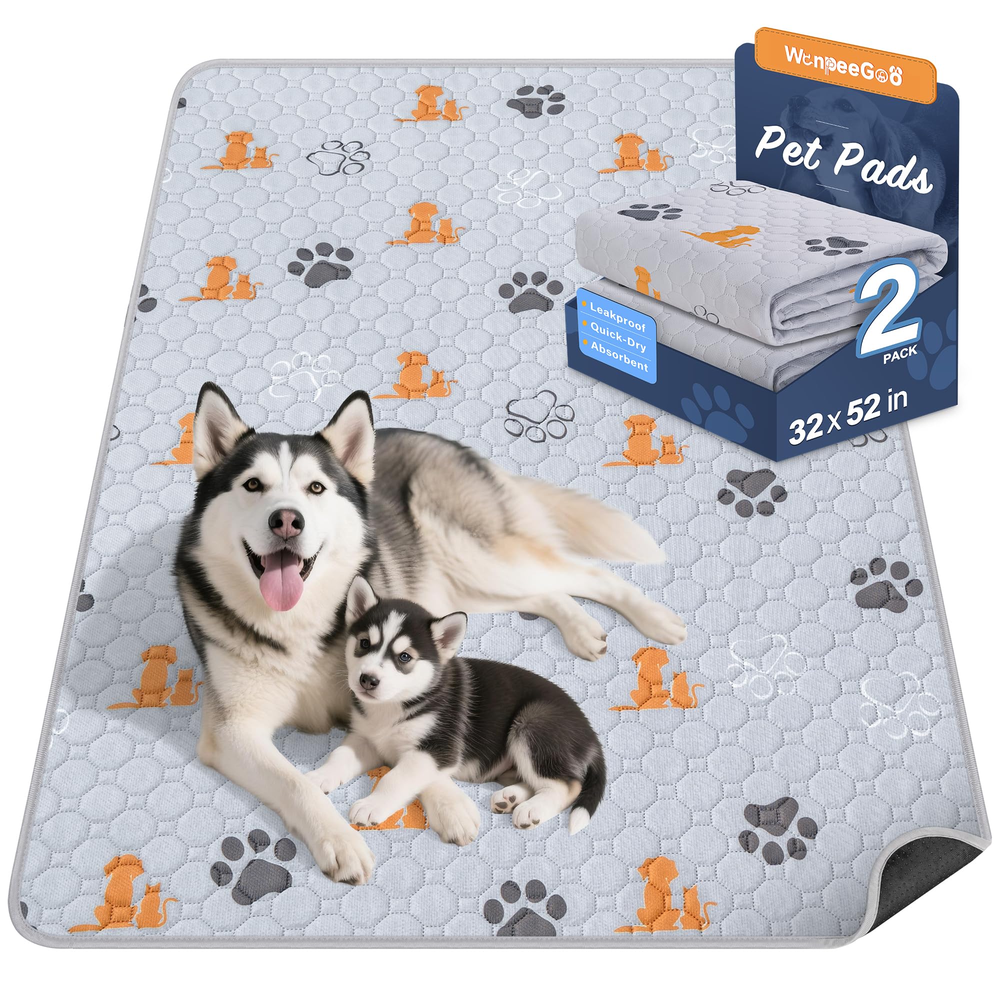 【Cute Dog Pee Pads】Come with 2 Packs. 32"x52" cute pattern are available to accommodate all dog breeds.Washable dog pee pads with our stylish design can be a puppy training pad, dog pen mat, dog playpen mat, dog carpet waterproof, crate pad, waterproof floor mat, pet piddle pad, dog kennel pad.