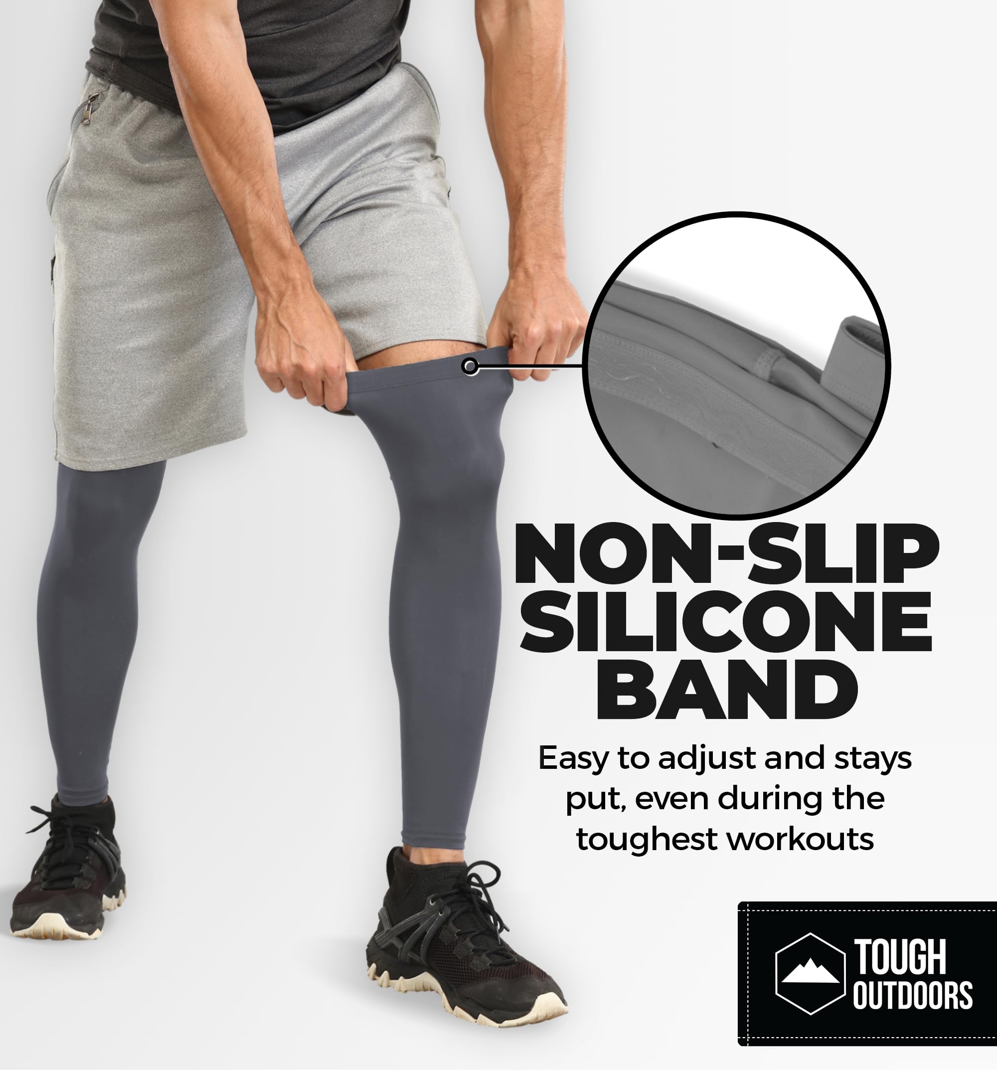 No-Slip, All Grip Fit: These compression leg sleeves for men stay in place. Whether it’s a full leg sleeve or football leg sleeves, silicone bands keep your focus on the game.
