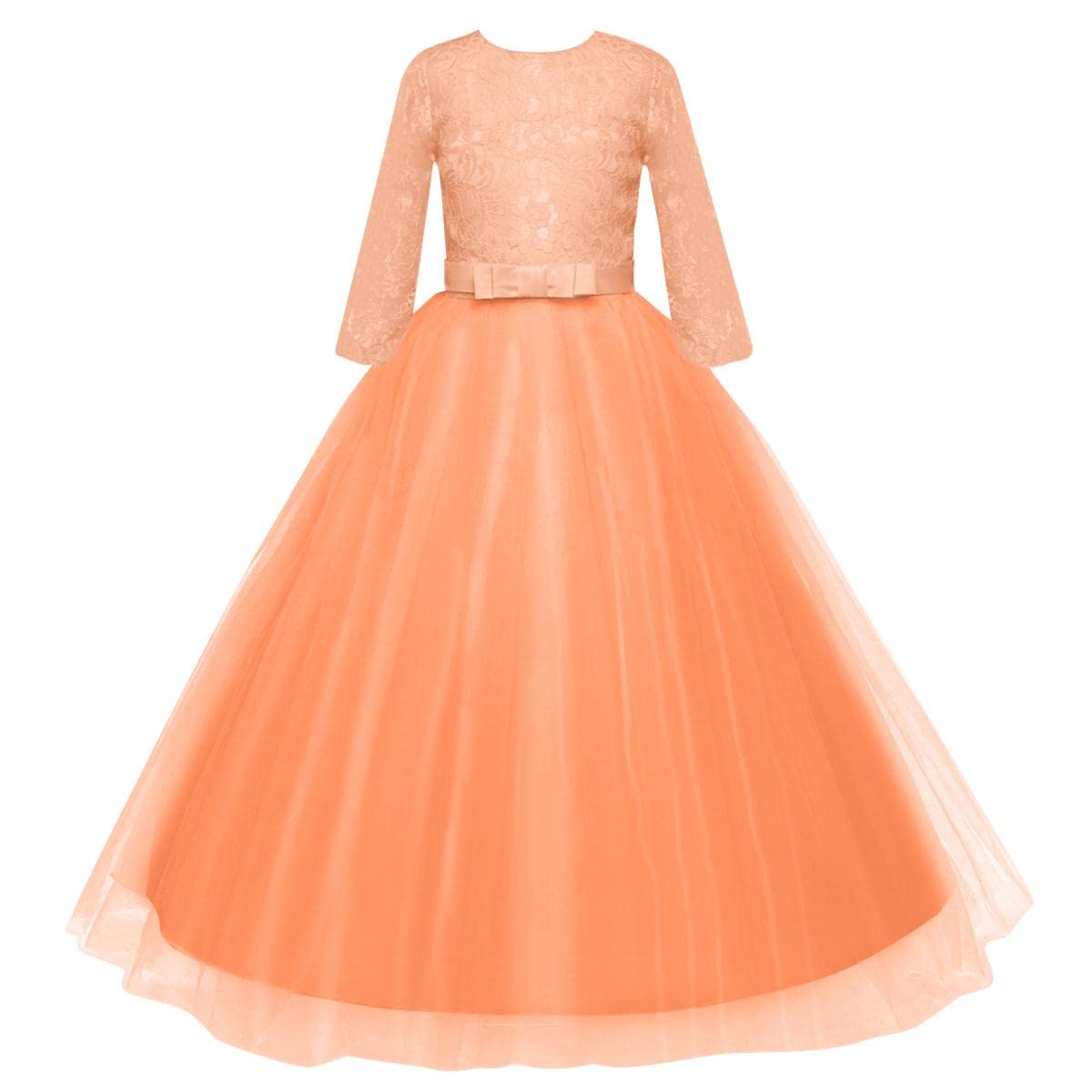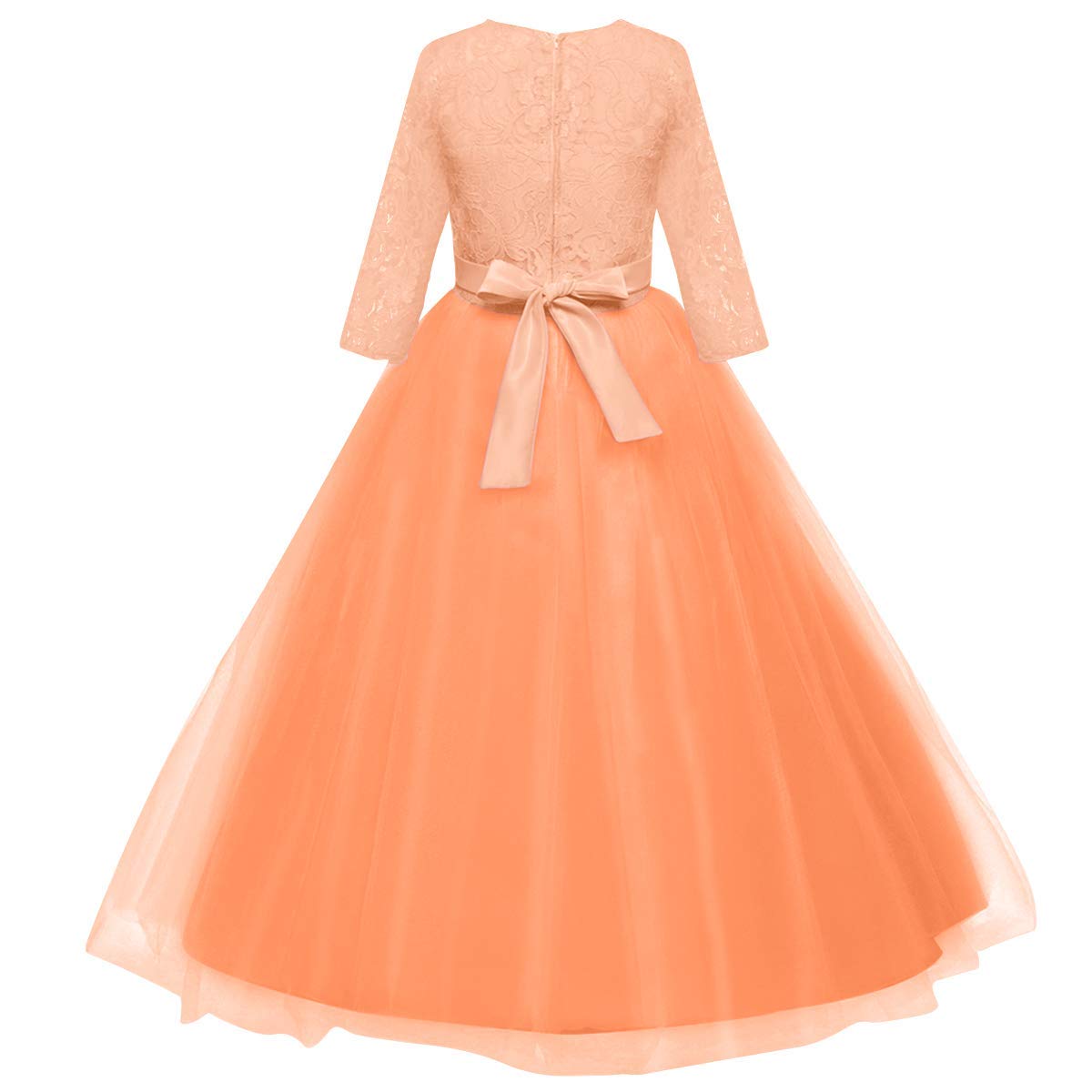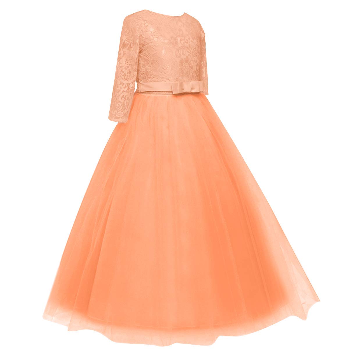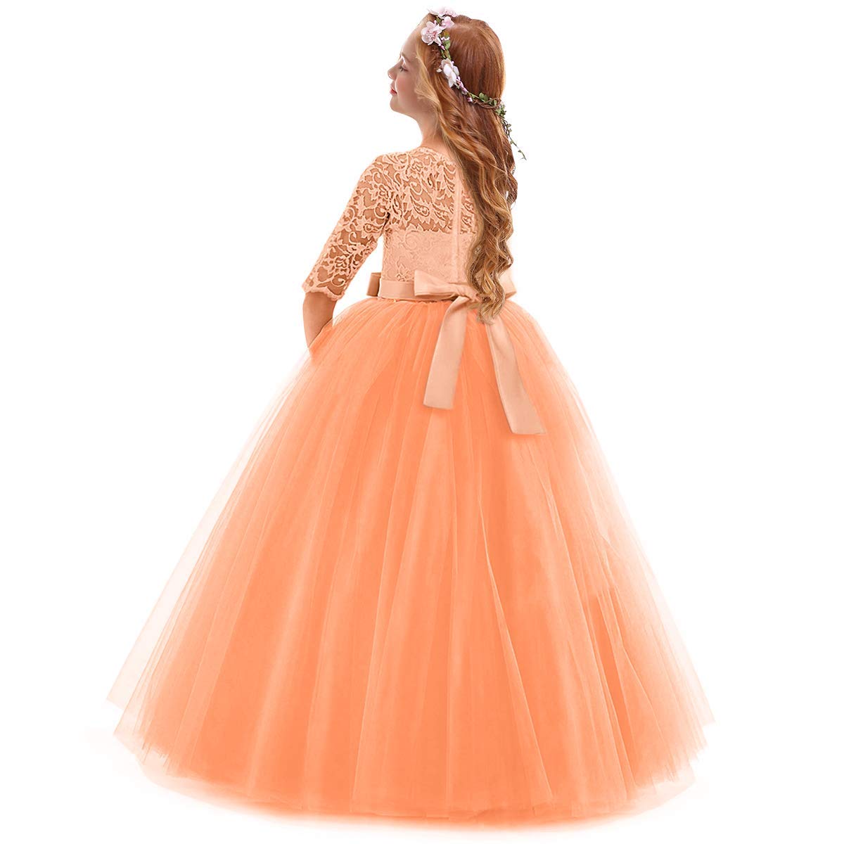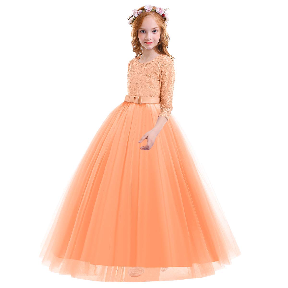 Size: Flower girls lace long maxi dress available for 2-14 Years child girl.Please refer to our size information in the below product description or the left picture for Detail Size Chart before ordering. Junior bridesmaid dresses for girls. Tulle lace layered dress with delicate flower and bow make your sweet princess to be the most graceful and shining girl in the crowd. Beautiful design features a chic style for your young baby and make your little fairy look so distinctive.
