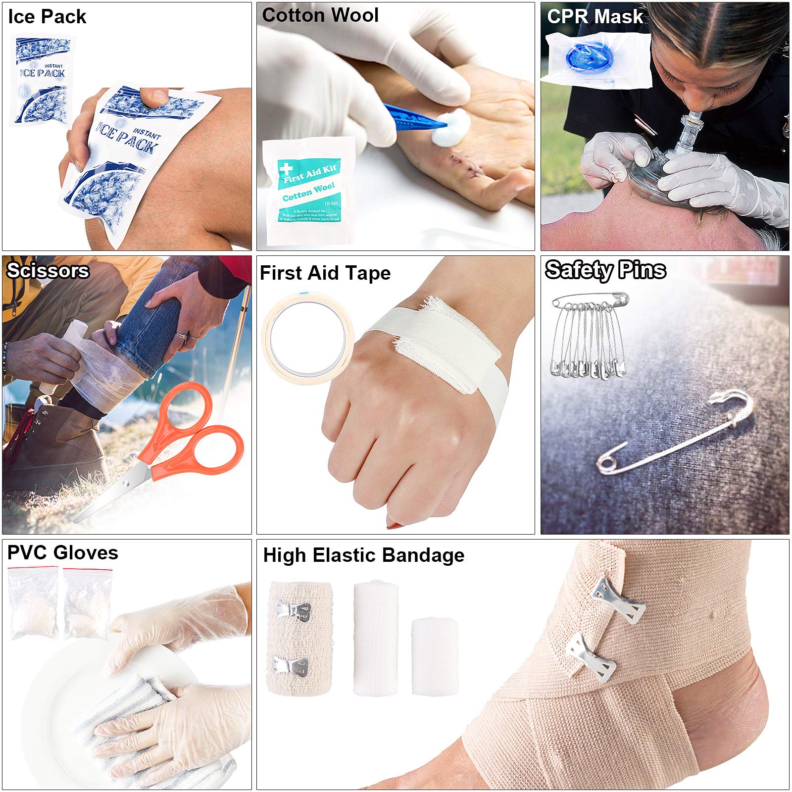 3.【Essential First Aid Supplies】Our emergency trauma kit contains 180pcs essential first aid supplies like bandage triangulaire, bandage, PBT bandage, non-woven medical tape, ice pack, CPR mask, sting relief prep pad, antiseptic cleansing wipe, cotton sticks, tweezers, scissor, etc. Perfect for taking care of any medical needs during outdoor wilderness adventures. It’s a must-having emergency preparedness for car, home, workplace.