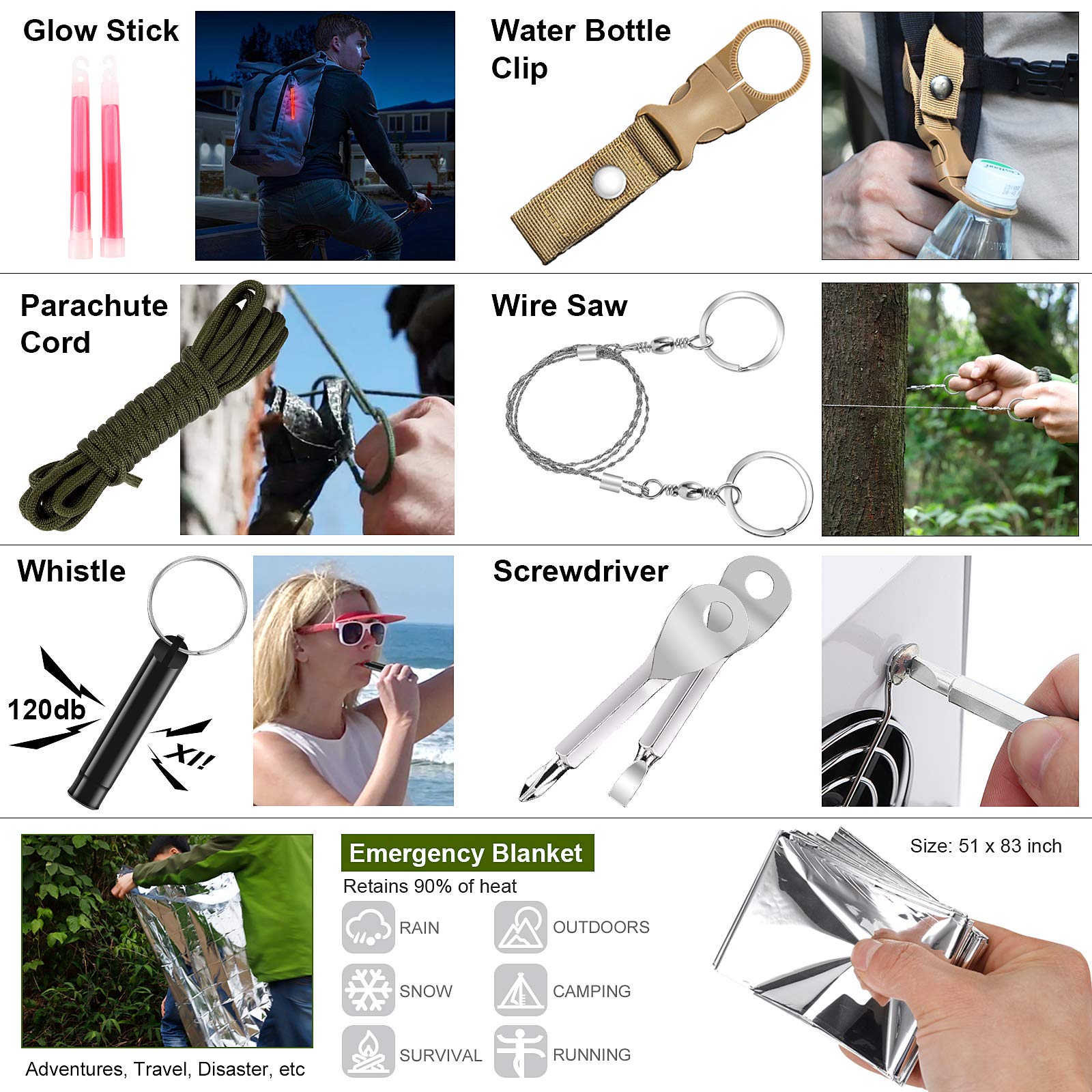 2.【Multipurpose Survival Gear and Equipment】This is a professional emergency kit, it contains various practical survival tools : survival bracelet , multifunctional card, wire saw, 7 in 1 spoon and fork, glow stick, flashlight, emergency blanket, fire starter, bottle hanging buckle, parachute cord, whistle, screw driver, fishing kit, meet your different emergency needs outdoor. Perfect gifts for men women like camping hiking backpacking, fishing, and other outdoor activities.