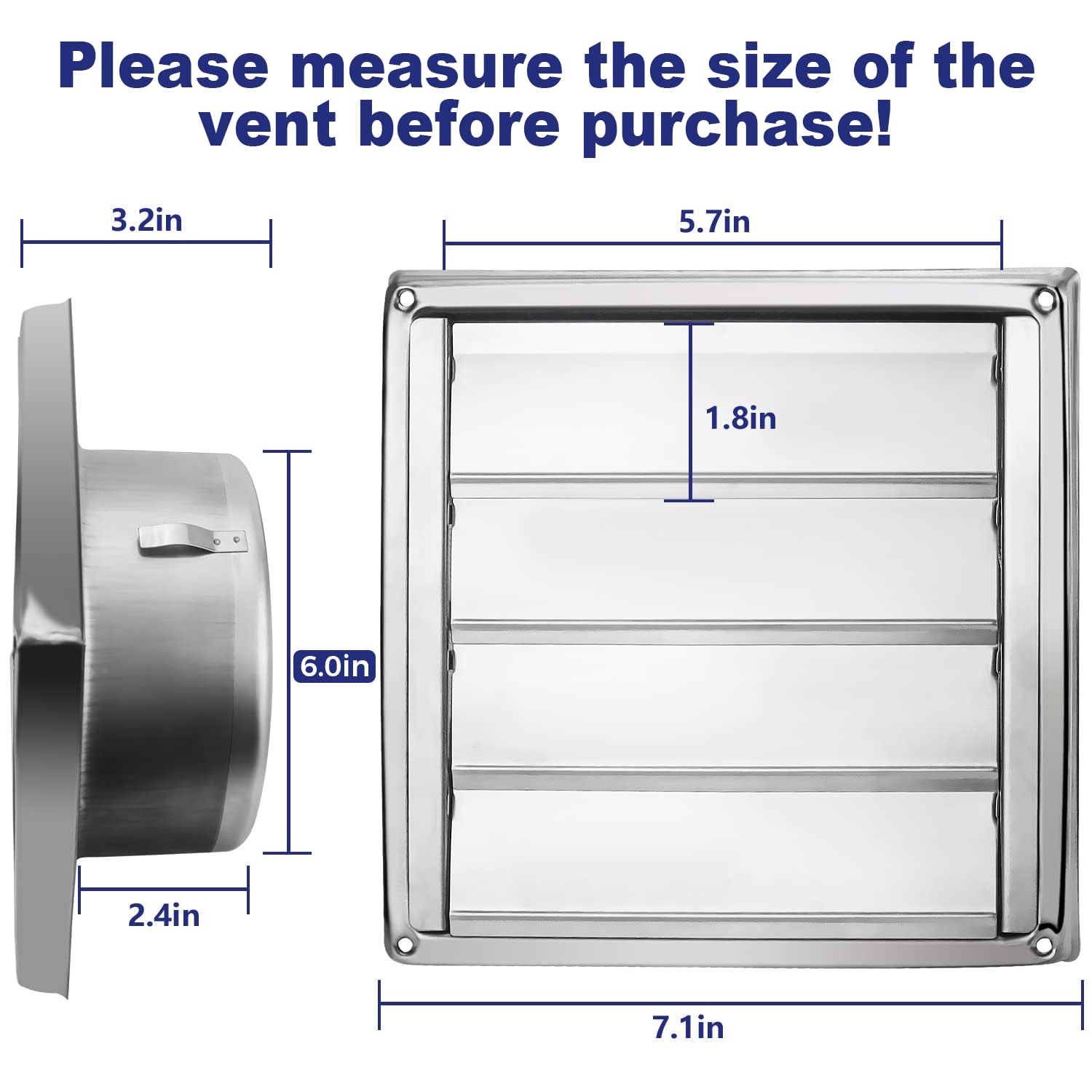 PRODUCT SPECIFICATIONS: Package includes 1 x 6" diameterstainless steel louvered outdoor dryer vent cover and 4 x installation screw. SIZE --- L: 7.1" x W: 7.1" (Note:To facilitate insertion of the vent cover into the exhaust duct, its port size will be slightly less than 6''. Please confirm the size of your exhaust equipment before purchasing)