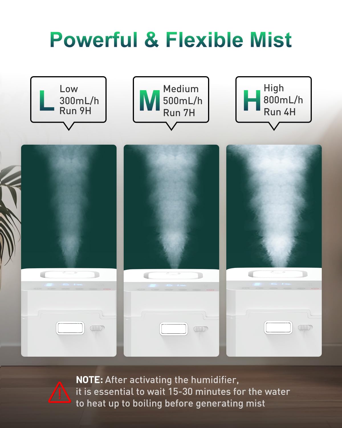 【Sleep Mode & 1-9H Timer】The humidifier large room comes with a sleep mode, when you activate it, the display screen goes off, creating an undisturbed environment. You can flexibly set the timer from 1 to 9 hours for gentle, continuous, all-night humidification. Don't let dry air disrupt your sleep any longer. Choose our warm mist humidifier and enjoy a restful night every night and wake up feeling refreshed and revitalized.