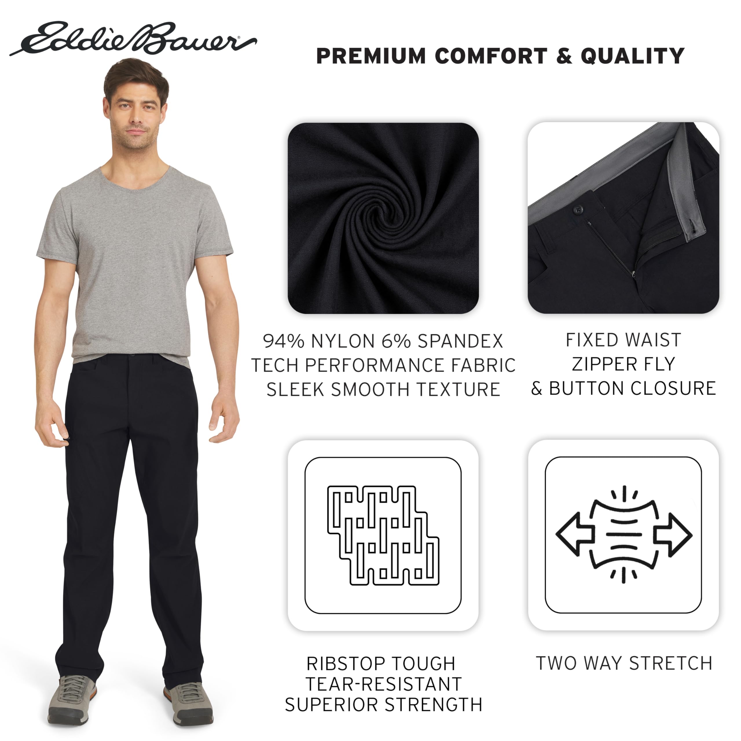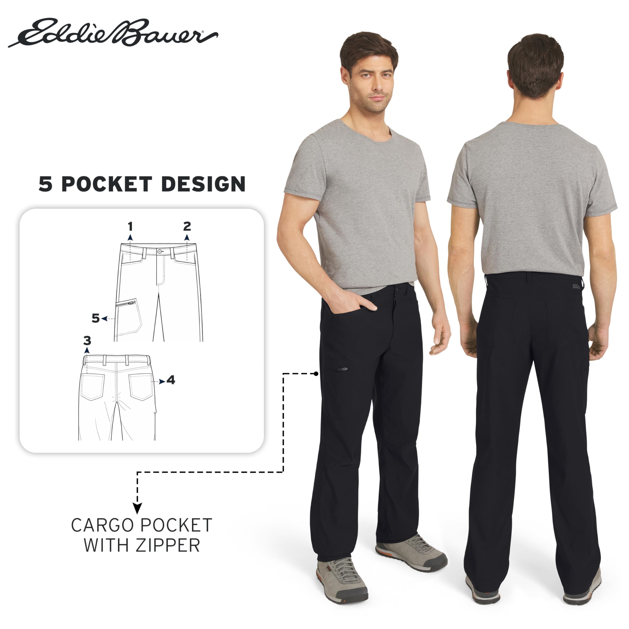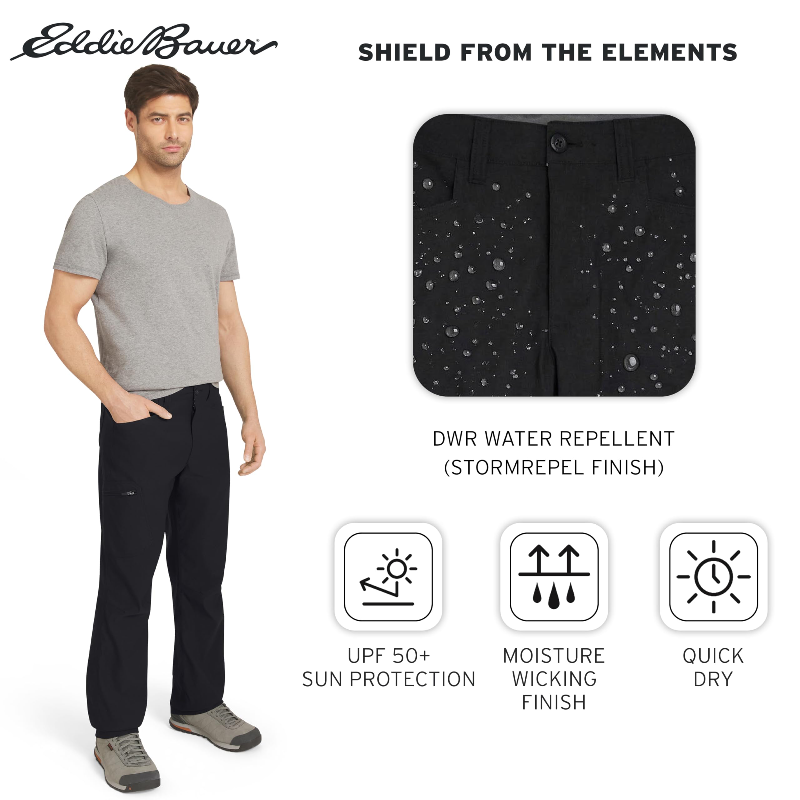 Description Built on a legacy of adventure-driven innovation, Eddie Bauer is committed to a sustainable and inclusive future for all. By utilizing materials and methods that minimize environmental impact, we strive to build an outdoor culture that is open, welcoming, and accessible to every explorer. This mission drives us to create high-performance apparel that respects the planet while empowering you to discover the great outdoors with confidence and purpose. Experience professional-grade performance with guide-tested ripstop fabric engineered for everything from alpine scrambling to backcountry climbing. This lightweight, bluesign® certified nylon-spandex blend features Flexion two-way stretch technology and articulated knees, ensuring exceptional mobility while taking anything you dish out on the trail. To keep you protected, these pants include a StormRepel® DWR finish to shed moisture and FreeShade® UPF 50+ sun protection to block harmful UV rays during long days in the sun. Discover a streamlined silhouette designed for high-intensity movement with an Active Fit that sits close to the body without restricting your range of motion. These moisture-wicking, quick-dry pants are equipped with a total of five pockets, including a zippered cargo pocket at the thigh to keep your phone and maps secure. Whether you are navigating a summit or traveling light, these pants pair perfectly with technical hiking boots or a performance sun hoodie, providing a secure, athletic profile for any adventure.