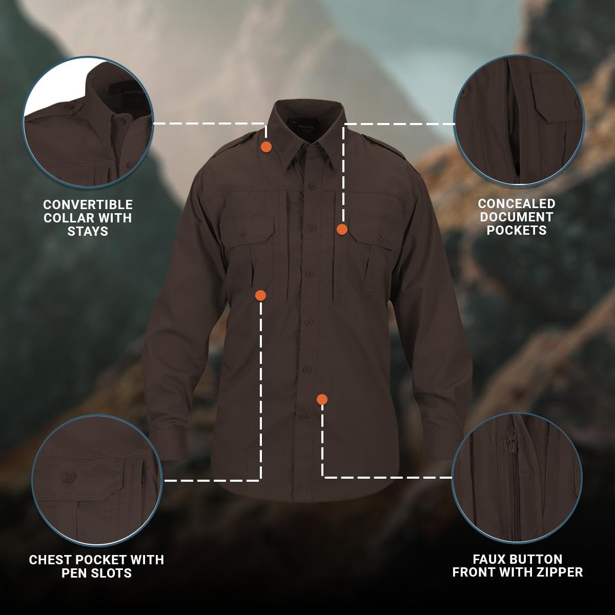 SMART DESIGN: The Propper Long Sleeve Tactical Shirt is made with 65% polyester 35% cotton lightweight ripstop and has a clever concealed zipper front closure hidden behind a traditional button placket faΓ§ade