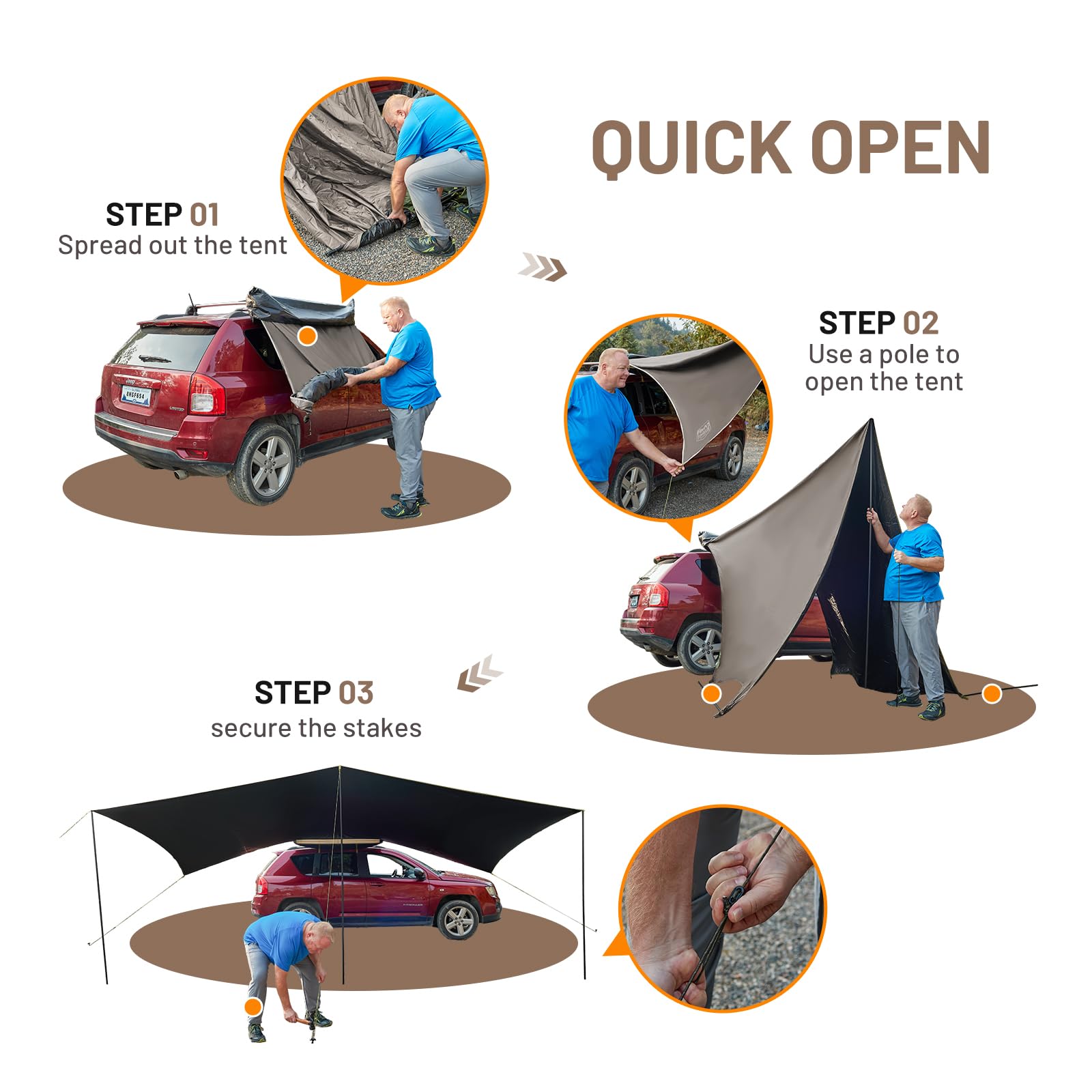 Oversized Car Side Awning: Offer 186 sq. ft of shade to protect from the sun and rain. The entire assembly is packaged in a heavy-duty PVC bag. It can be installed on almost all vehicles with roof racks. Fits your Car/Truck/Jeep/SUV/Van.