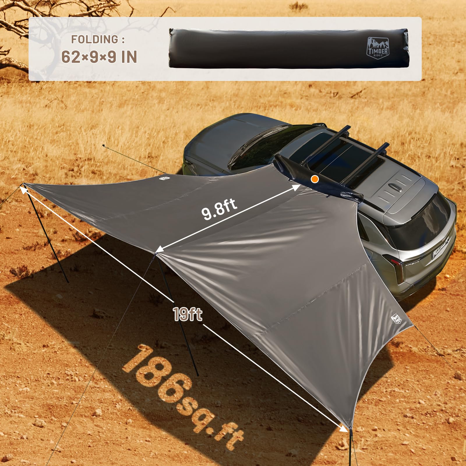 TIMBER RIDGE 19x9.8ft Retractable Car Awning with Blackout Coating, 186ft² Roof Rack Pull-Out Sun Shade Overland Camping, UPF50+ Waterproof Sun Shelter for Vehicle/Truck/Jeep/SUV/Van Tan