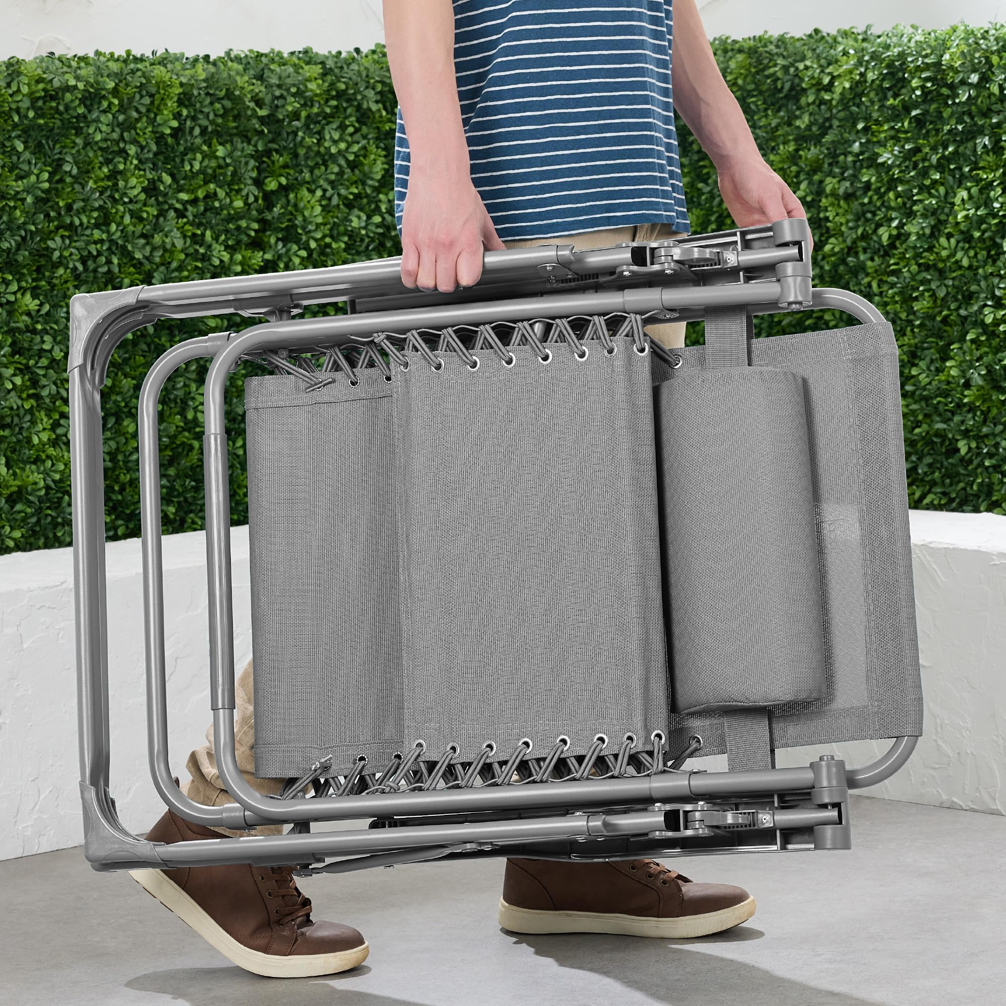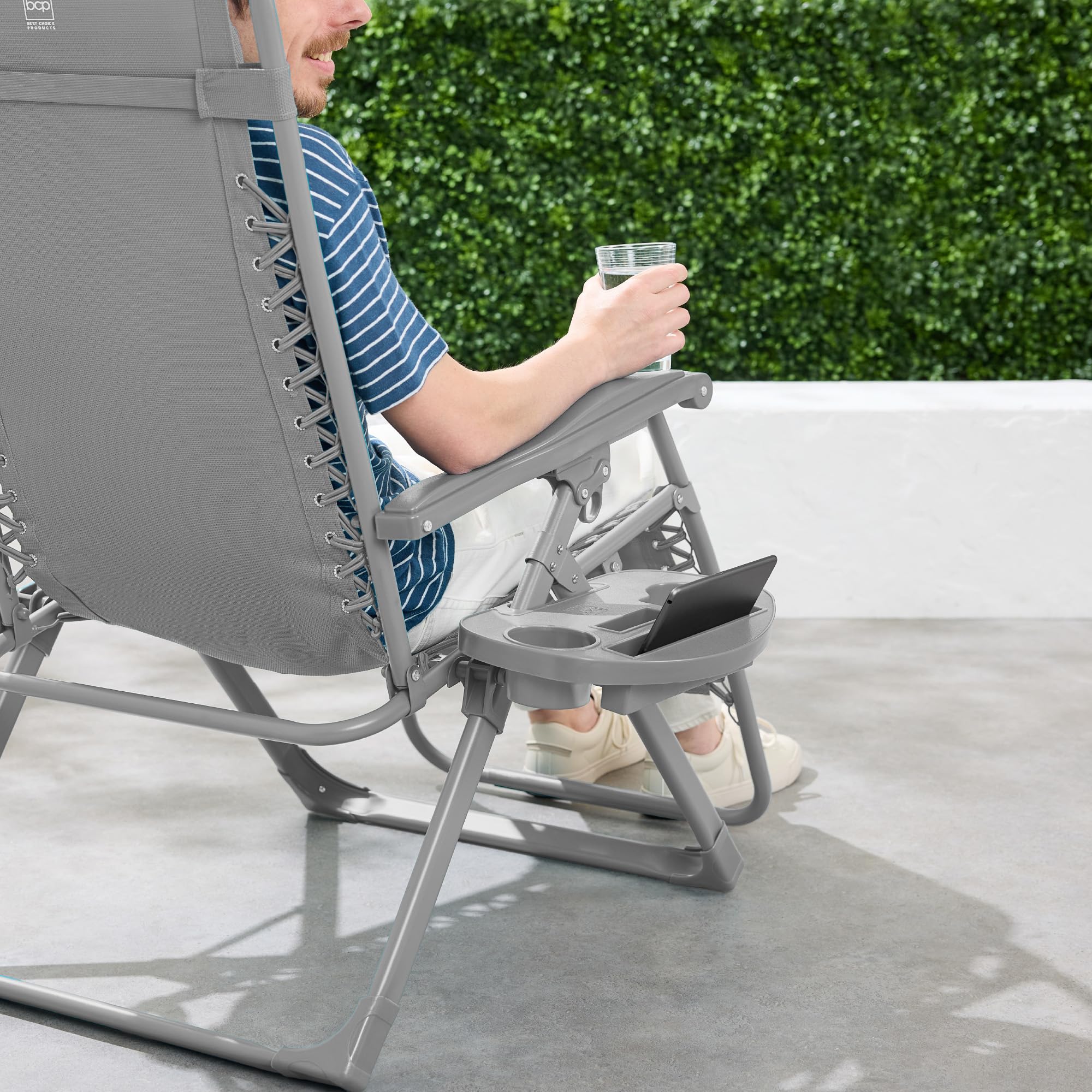 DETACHABLE TRAY: Includes a convenient accessory tray equipped with two cupholders, a phone mount, and a tablet holder, along with a convenient headrest for long-term relaxation; OPEN DIMENSIONS: 32.5"-61"(L) x 25"(W) x 33.5"-44"(H); FOLDED DIMENSIONS: 38"(L) x 25"(W) x 6"(H); WEIGHT CAPACITY: 300 lbs.