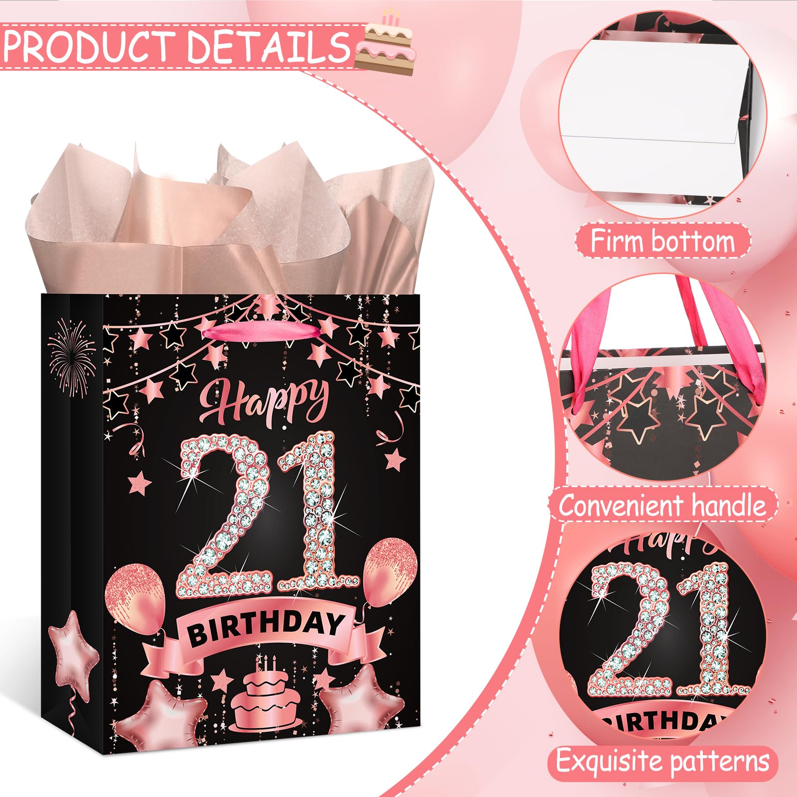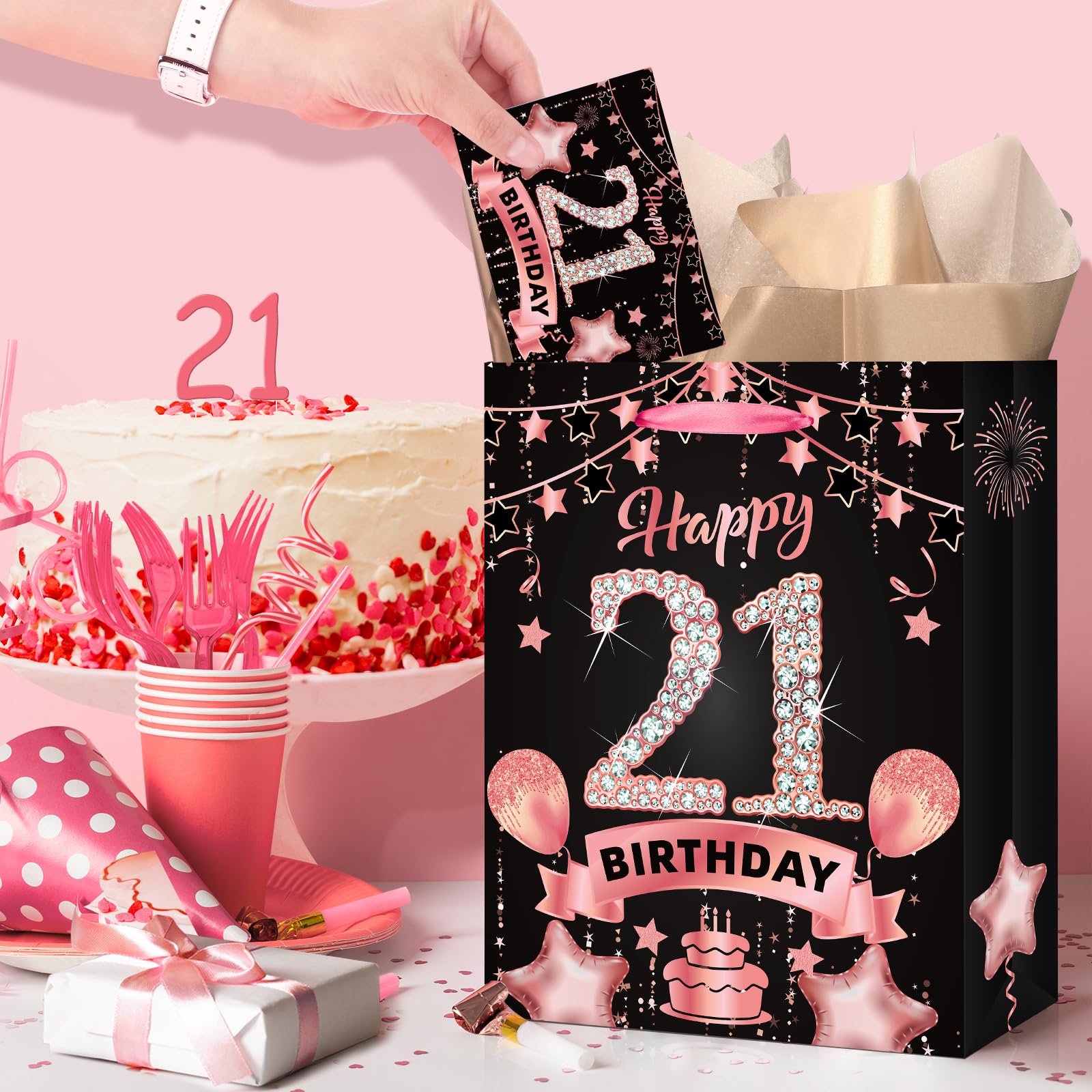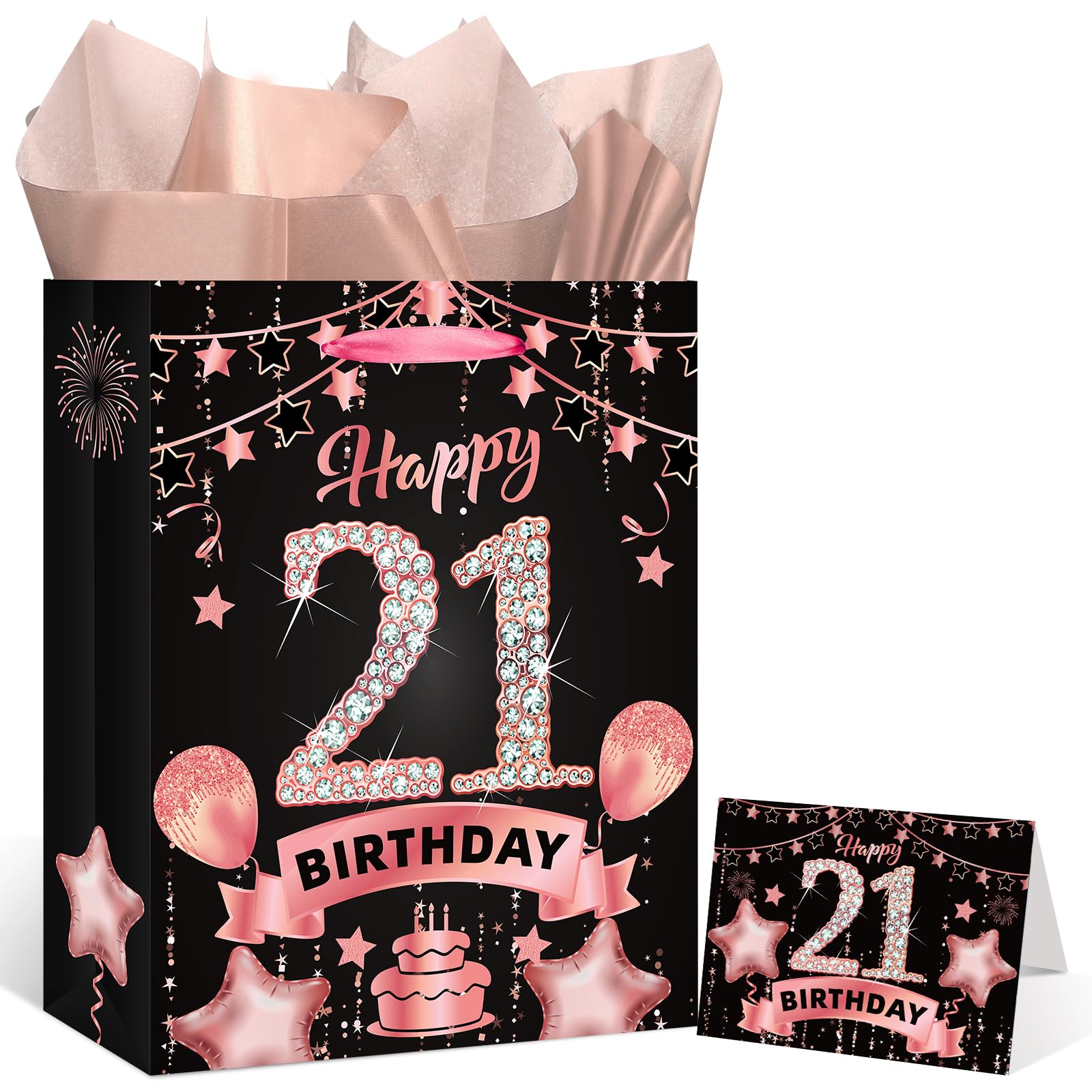 21st Birthday Gift Bag: This rose gold 21st birthday gift set includes 1 piece 21st birthday gift bag + 1 piece 21st birthday greeting card + 3 pieces tissue papers,and the 21st birthday gift bag features exquisite 21st birthday celebration pattern, such as cakes, balloons, fireworks which will leave a deep impression