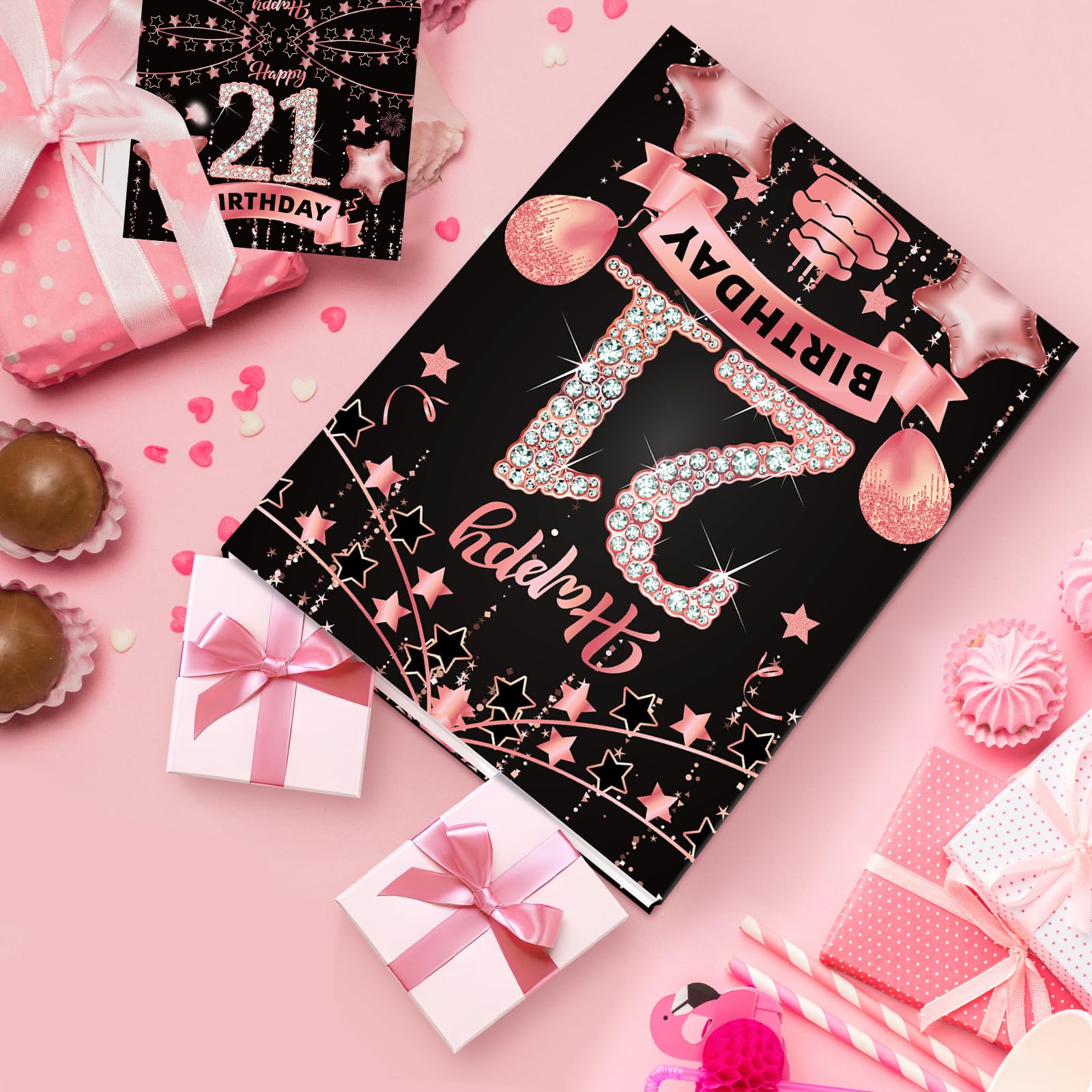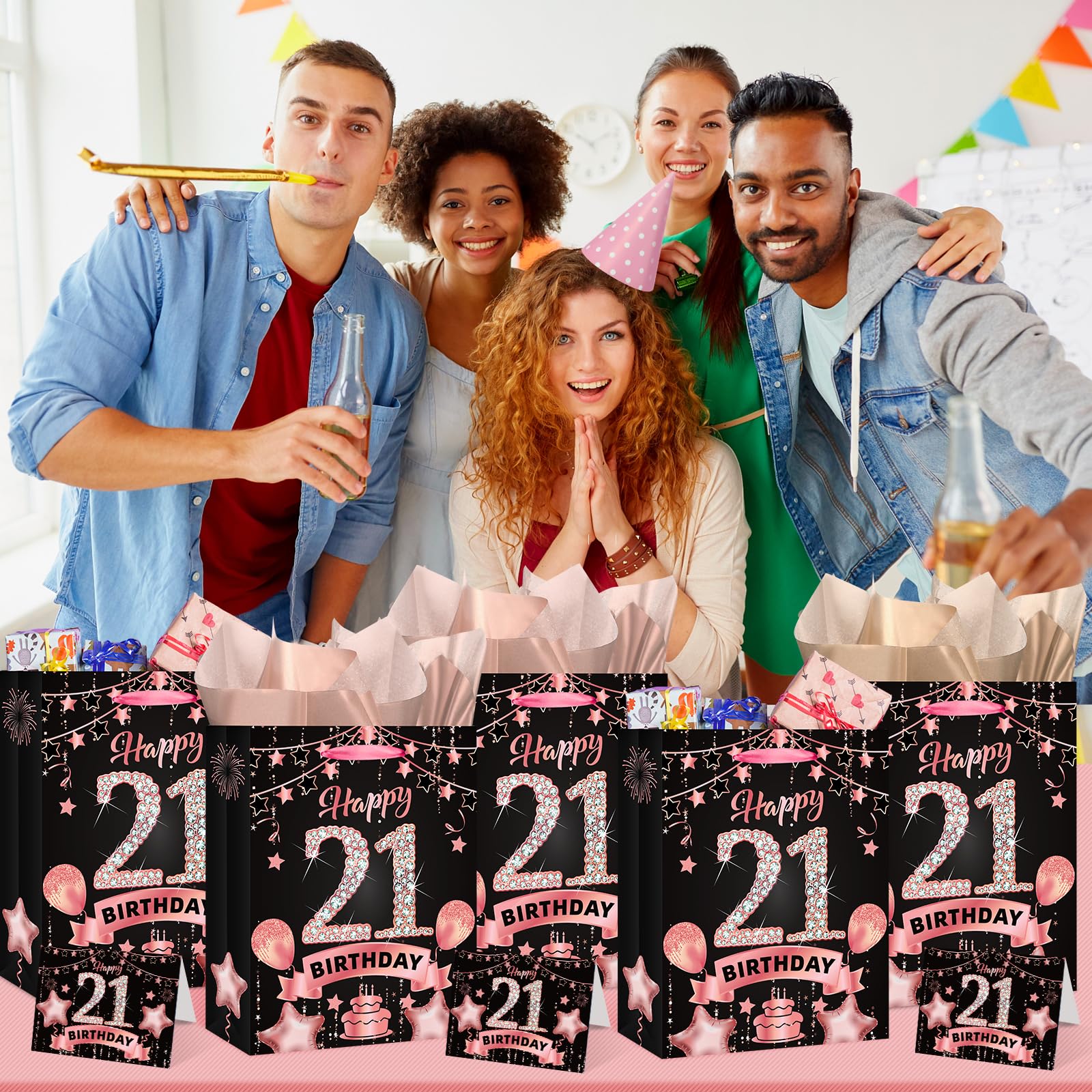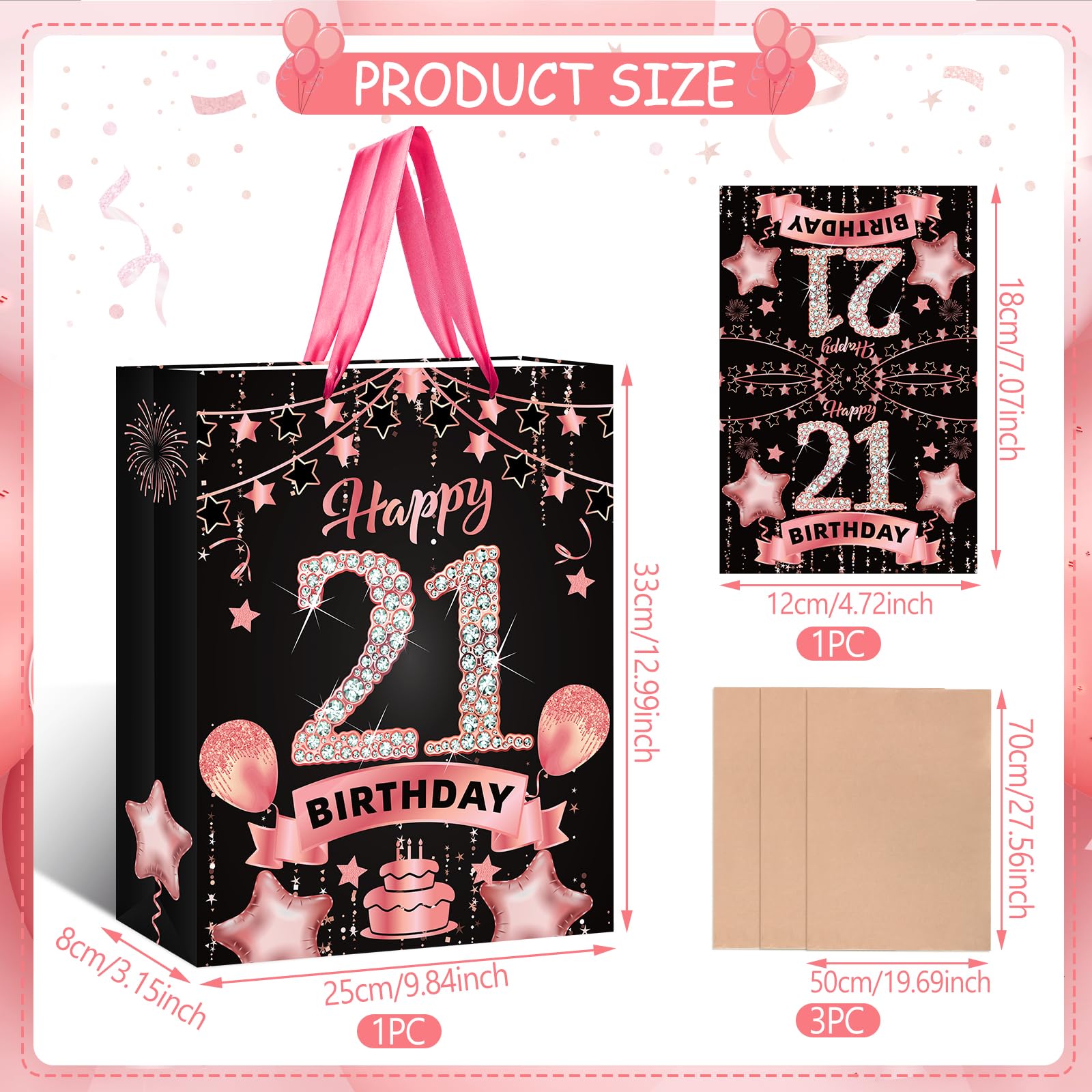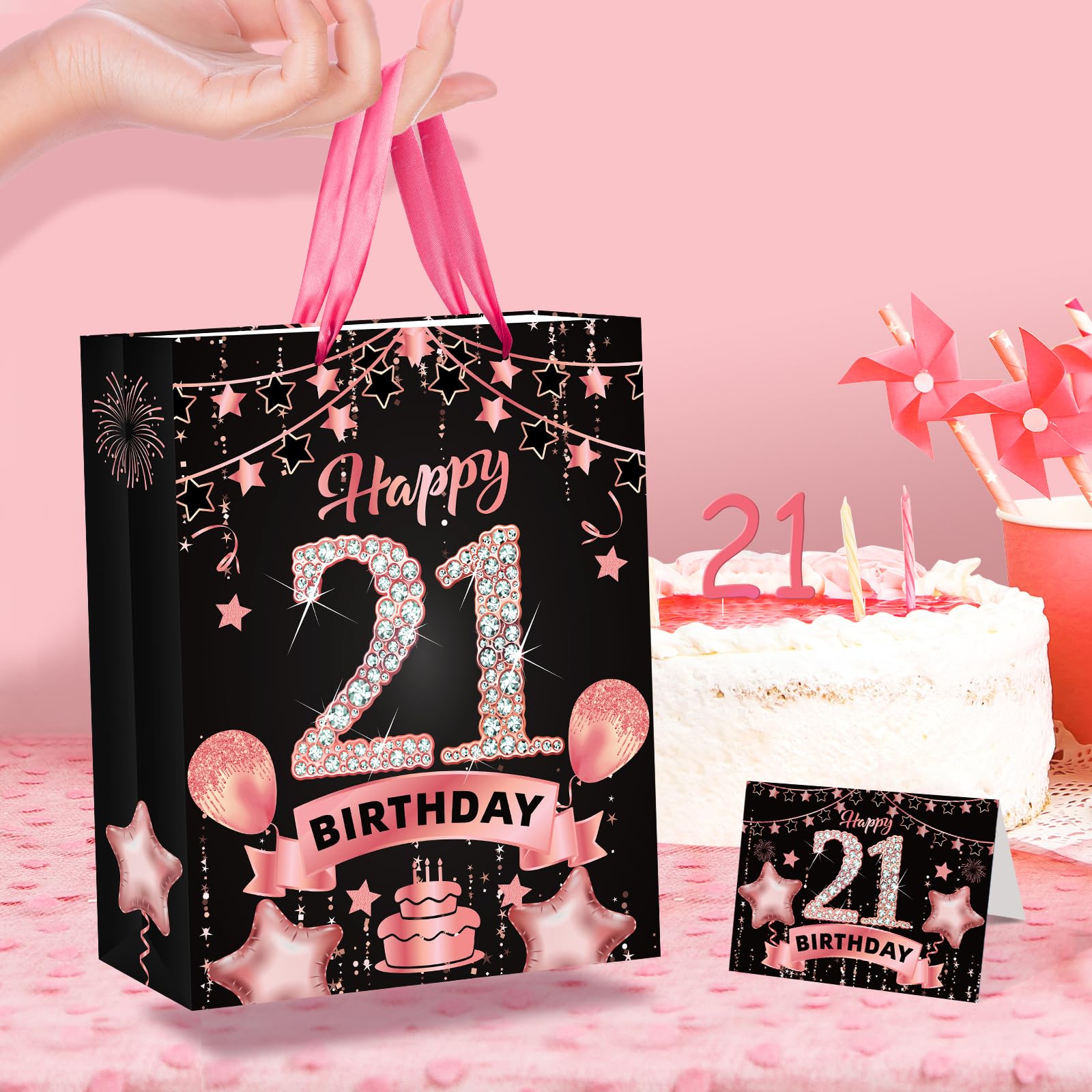 21st Birthday Gift Bag: This rose gold 21st birthday gift set includes 1 piece 21st birthday gift bag + 1 piece 21st birthday greeting card + 3 pieces tissue papers,and the 21st birthday gift bag features exquisite 21st birthday celebration pattern, such as cakes, balloons, fireworks which will leave a deep impression