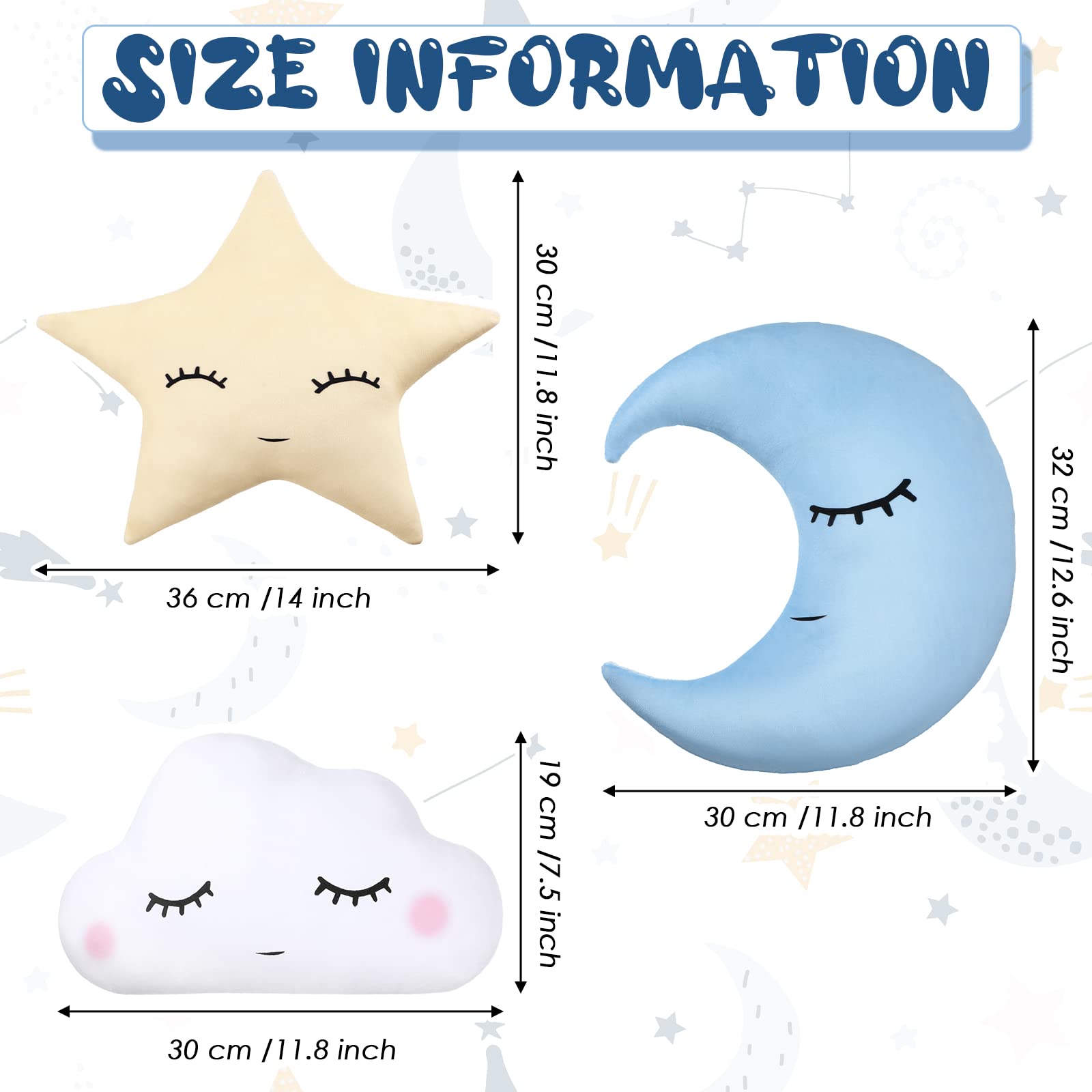 Common Sizes: the white cloud pillow measures about 34 x 20 cm/ 13.39 x 7.87 inches, the size of yellow star shaped pillow is about 35 x 35 cm/ 13.78 x 13.78 inches, and the blue moon pillow is 34 x 30 cm/ 13.39 x 11.81 inches, the right sizes for your bed, and they will not take up too much space; Please note: after filling, the size will become smaller