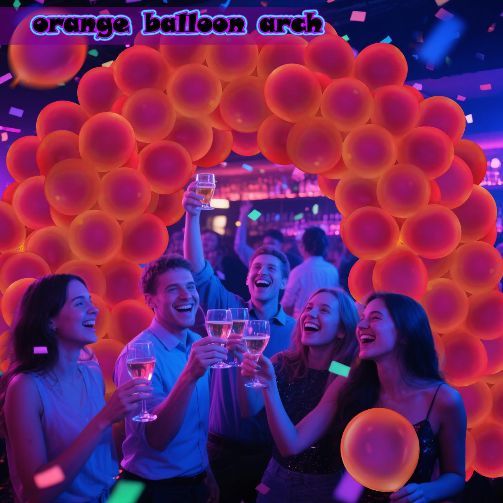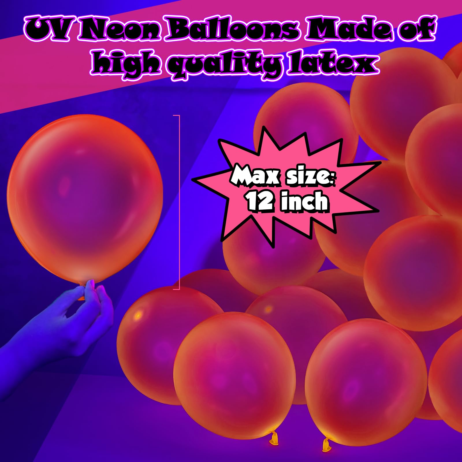 Glow in The Dark Balloons: 100% latex orange glow balloons. Bright color and eye-catching, light weight but wear-resistant, durable and reusable.12 inch neon glow balloons can be filled with air or helium. Helium can float the latex balloons in the air. Which are neon in normal light and fluorescent in specific violet light ,very beautiful.