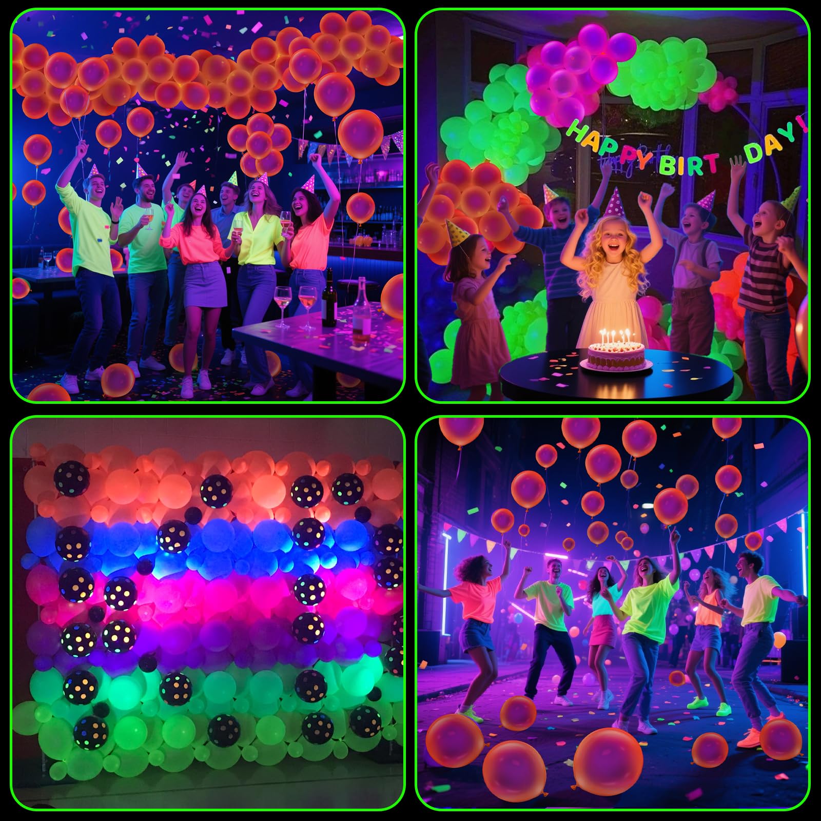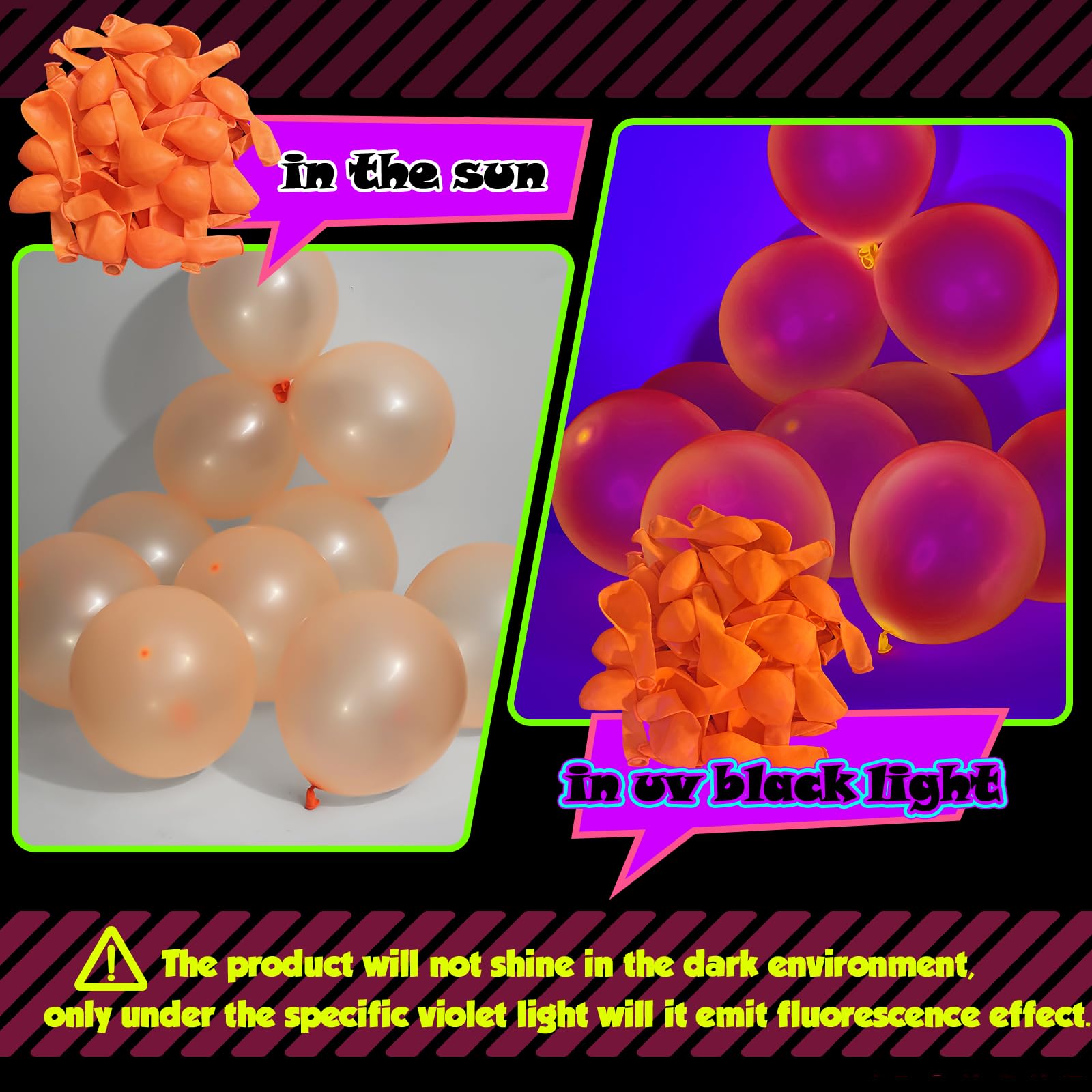 Professional Service: Please do not inflate the UV neon balloons more than 90%, or rub against overheated and sharp objects to avoid sudden popping. Neon colored balloons will not glow in the dark without a UV black light response. Support resend for any missing or damaged parts in your package. If you have any questions, please feel free to tell us, we will give you a satisfactory solution within 24 hours.