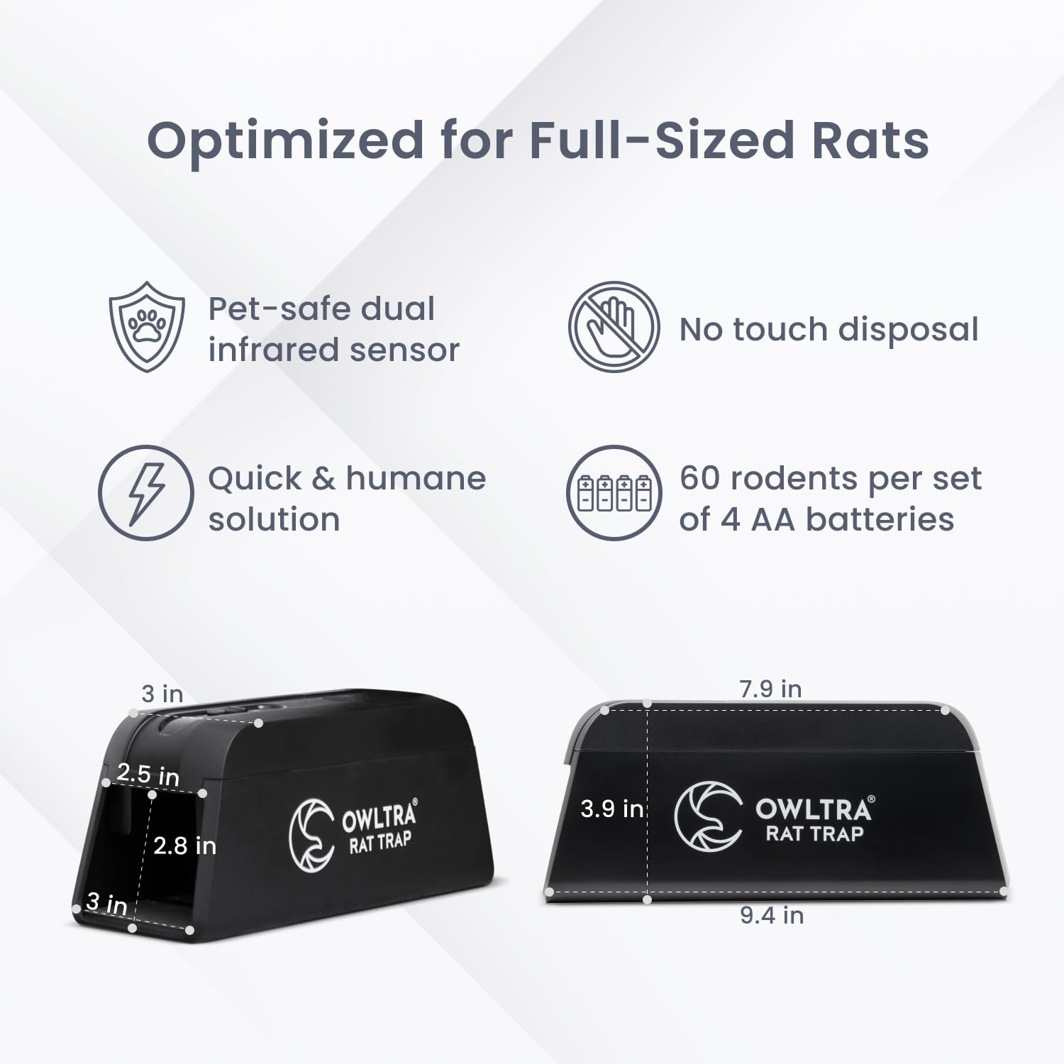 The Humane Solution - Owltra is the humane solution for getting rid of large populations of rodents, as one set of 4 C batteries is enough to exterminate 60 rats. Featuring improved dual infrared sensors to protect kids and pets, Owltra ensures no false zaps. The no-escape design keeps the rodent in place while generating 6,000-9,000 of high-voltage shock for quick elimination