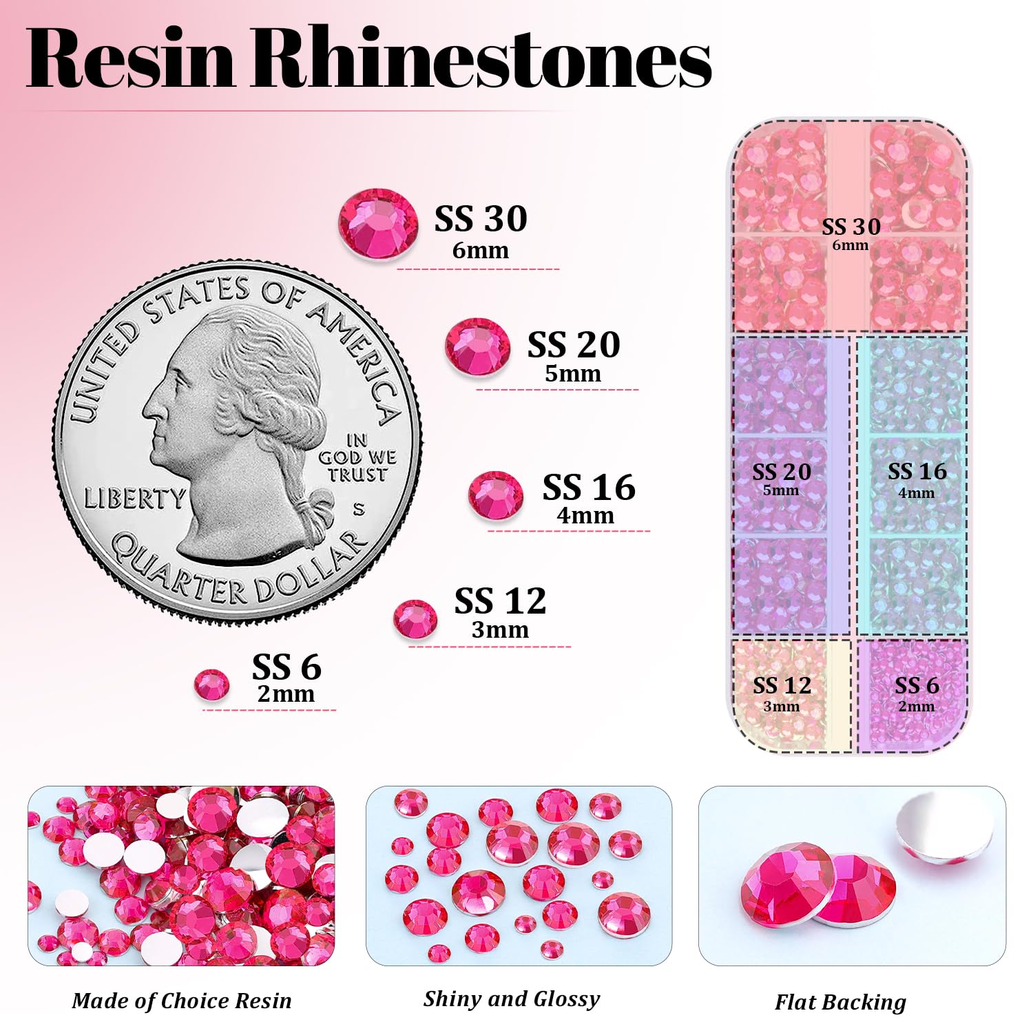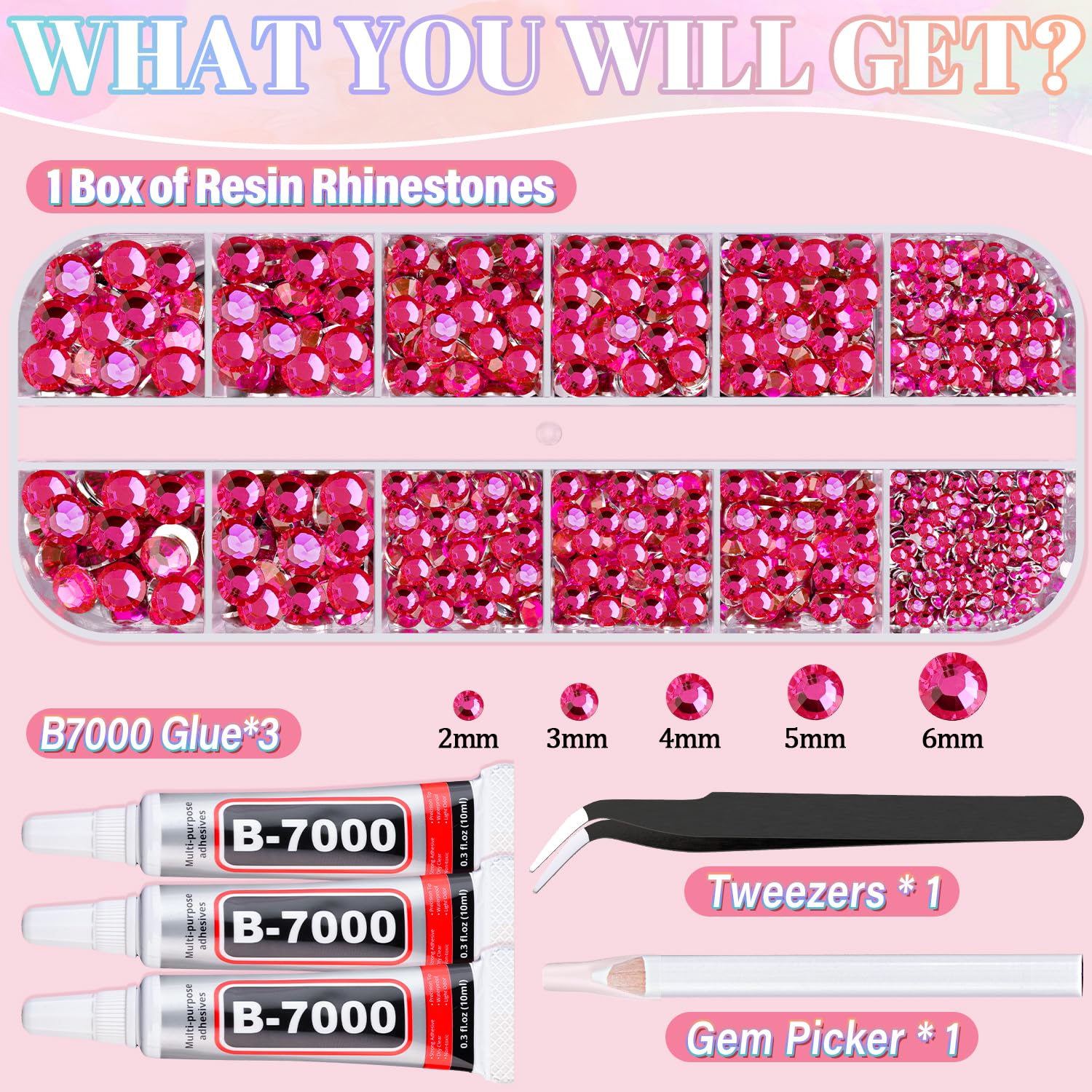 WHAT YOU WILL GET -- The package includes 1 box of flatback rhinestones with 12 grids in different sizes. 1 tweezers for large-size gems, 1 pickup pen for small-size gems. 3 B7000 adhesive jewels glue for jewelry making. This rhinestone kit makes it easy for you to make any craft you like, and will bedazzle your artworks! CHARMING GEMS FOR CRAFT -- These high-quality flatback bling diamonds are made of choice resin, so they are very lightweight, durable, and cost-effective. Their perfect cutting facets, delicate and exquisite shine, will make your handicrafts more dazzling and eye-catching. Our store also offers a variety of colors, which will give your crafts more possibilities. STRONG B7000 GLUE FOR GEMS -- These Non-Hotfix rhinestones are not self-adhesive and need to be used with glue. The equipped B7000 glue has strong adhesion and dries clear. It has a precision needle for easy application. For first use, you can leave the glue head up for a few minutes before opening to avoid overflow. After using, the needle needs to be cleaned with an alcohol wipe to avoid a mess. TIPS FOR USE -- Our flatback rhinestones are non-hotfix and need to be used with glue. To apply the resin rhinestones, first, clean the surface of your crafts or your nail you wish to embellish. Then, apply the rhinestones with the appropriate glue and wait for them to dry. Once the glue is completely dry, it will stick firmly to your crafts or nails, making your artwork more sparkling! WIDE APPLICATION -- These sparkling iridescent resin crystals are perfect for creating dazzling looks. Use them for bedazzling DIY crafts like shoes, tumblers, mugs, bottles, phone cases, popsockets, scrapbooks, photo frames, diamond paintings, greeting cards, bags, glasses, guitars, keychains, hats, masks, hair clips, bracelets, wristbands, clothing, wedding dresses, and more.