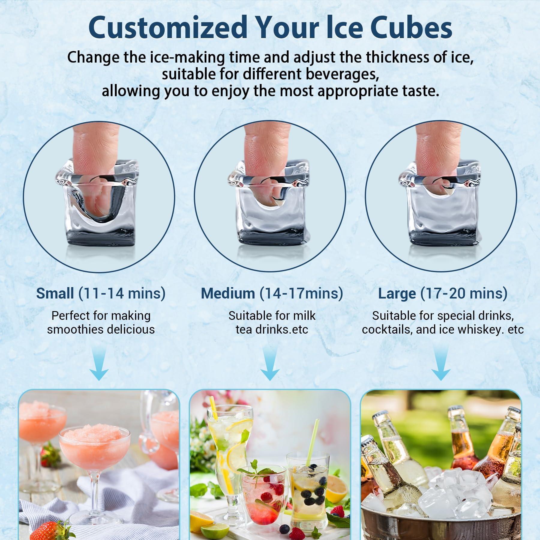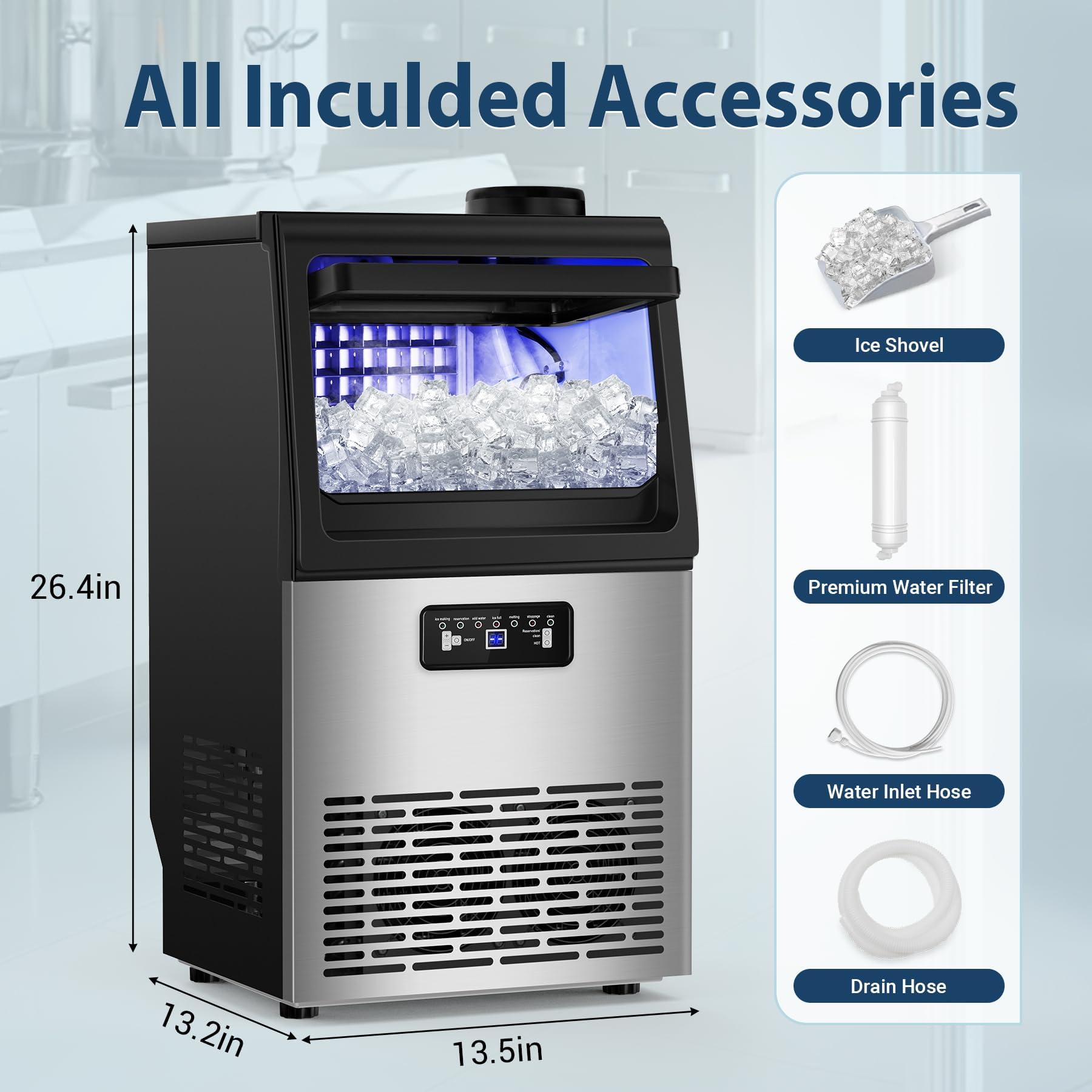 Ideal for Commercial & Residential Use - Overall size of the ice maker is 13.5 x13.2 x 26.4 inches, which makes it easy to integrate into any space. Under counter/freestanding/countertop ice maker design lets you install the ice maker anywhere inside your home, party, or bar. Ice scoop, water filter, water supply hose, and water draining hose, all you need is thoughtfully provided.
