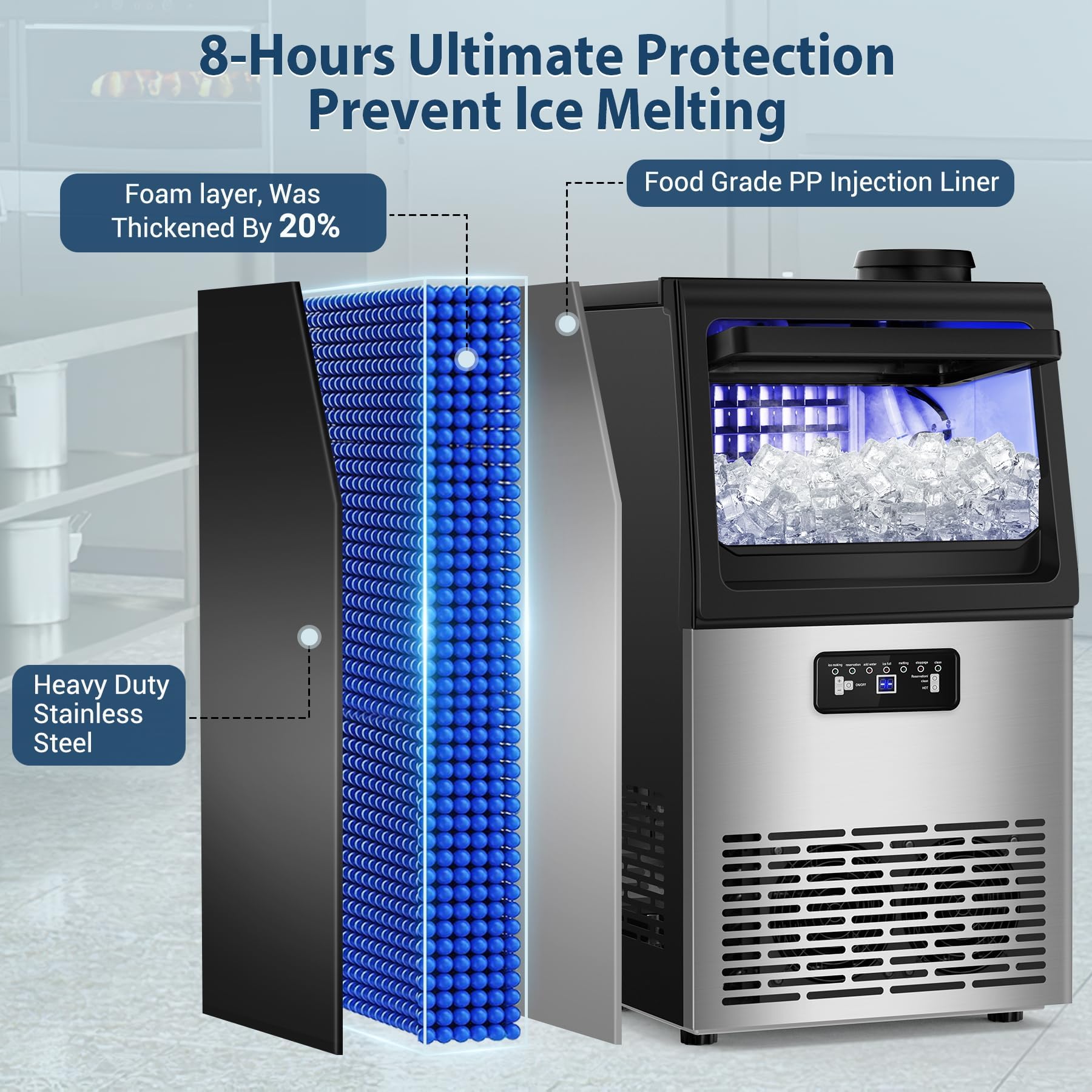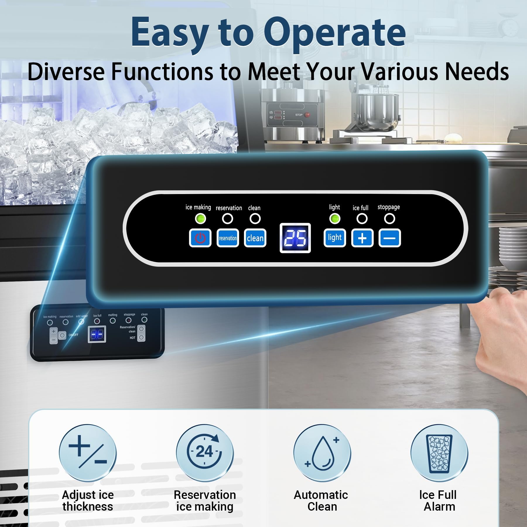 Smart Control Panel & Self-Cleaning Function. Boasting an intuitive LCD control panel, this ice maker simplifies operation with features like automated cleaning, defrosting, scheduling, and fault notifications. Effortlessly customize ice production time and cube thickness using the (+) and (-) buttons. The auto-clean functionality ensures effortless upkeep, minimizing maintenance hassles.