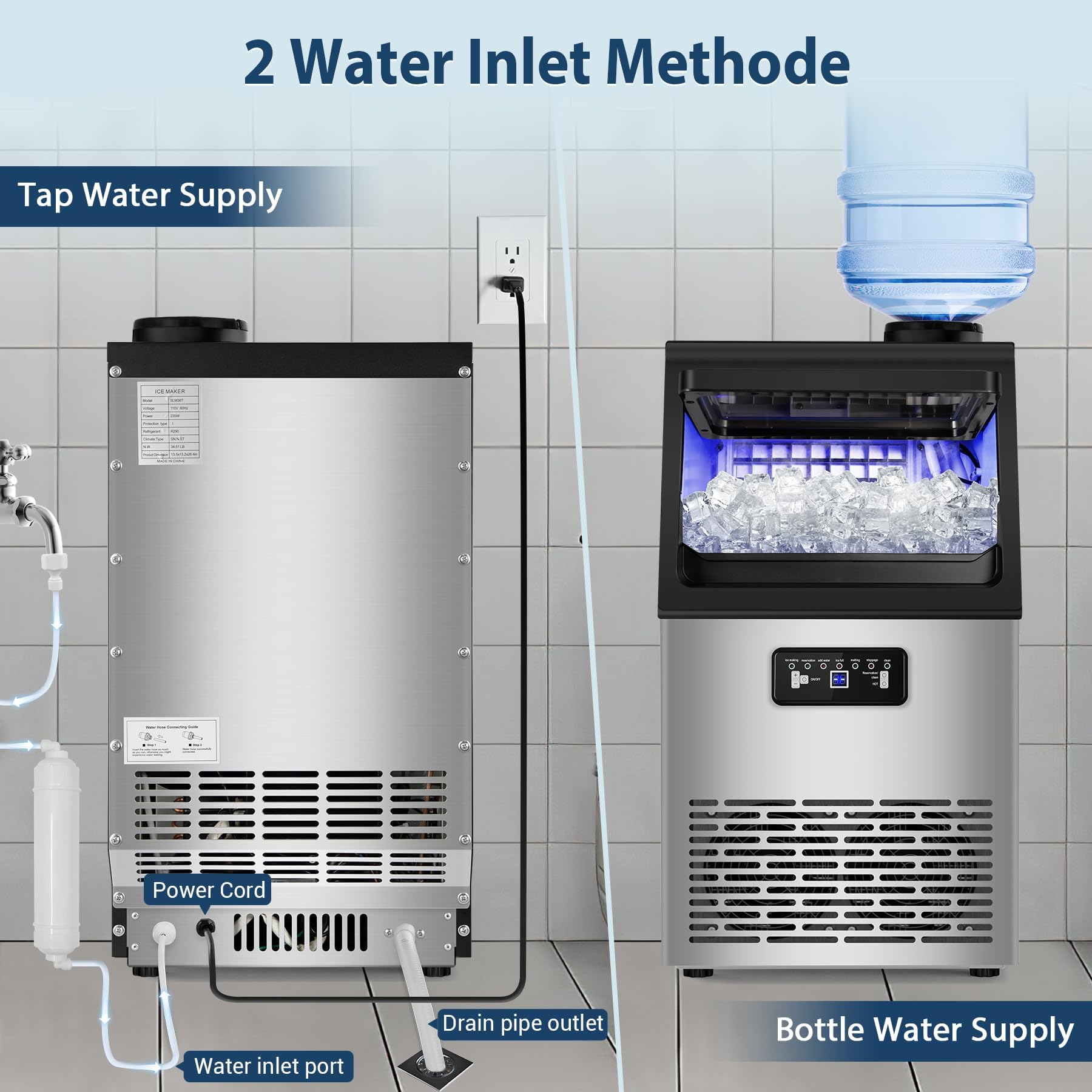 Dual Water Inlet with Built-in Purification. Designed for flexibility, the ice machine supports both tap water and gallon-bottled water connections. A built-in water filter purifies tap water, ensuring clean, crystal-clear ice with every batch. Perfect for kitchens, cafés, bars, and small businesses.