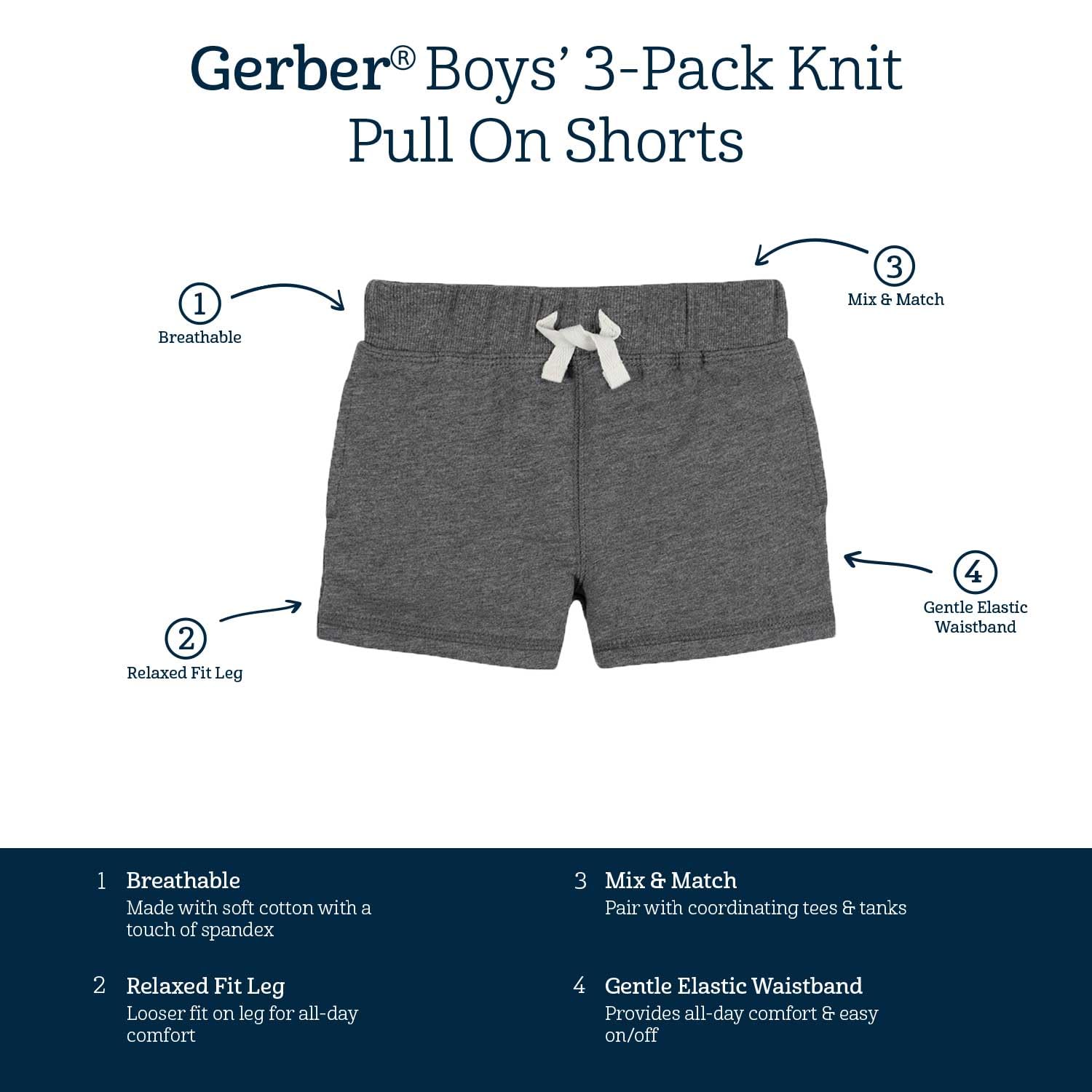 Description Keep babies and toddlers comfortable and ready for play with Gerber pull-on knit shorts. Made from soft 100% cotton fabric, these breathable shorts are designed for easy dressing, flexible movement, and everyday wear. The gentle elastic waistband offers a secure yet comfortable fit, while the solid color multipack makes outfit matching simple. With three versatile pairs in each set, these active-ready essentials deliver the Gerber quality parents can rely on from baby through toddler years.